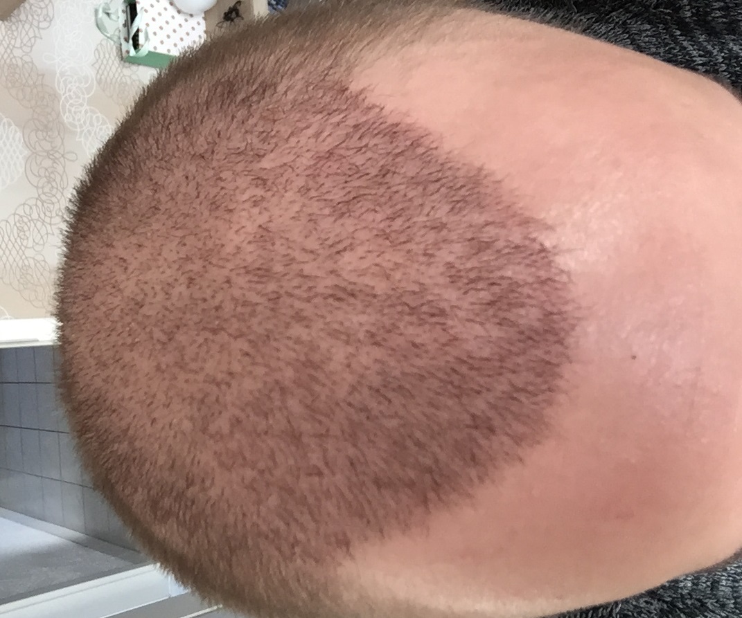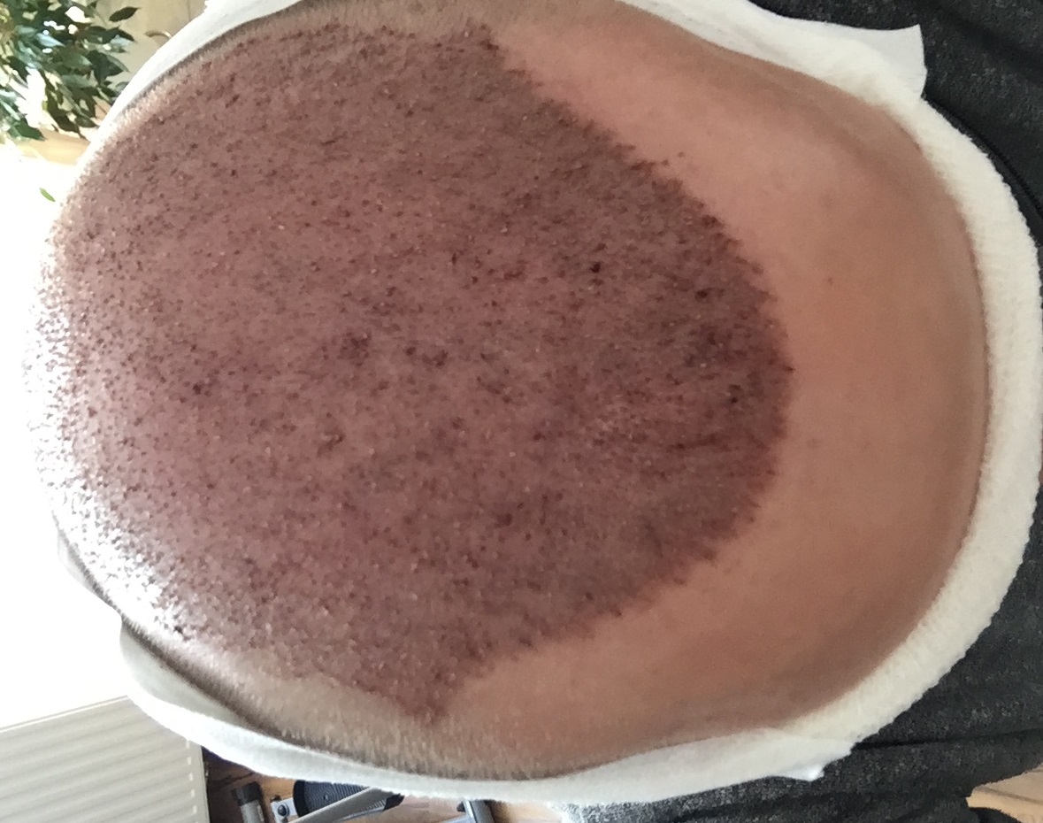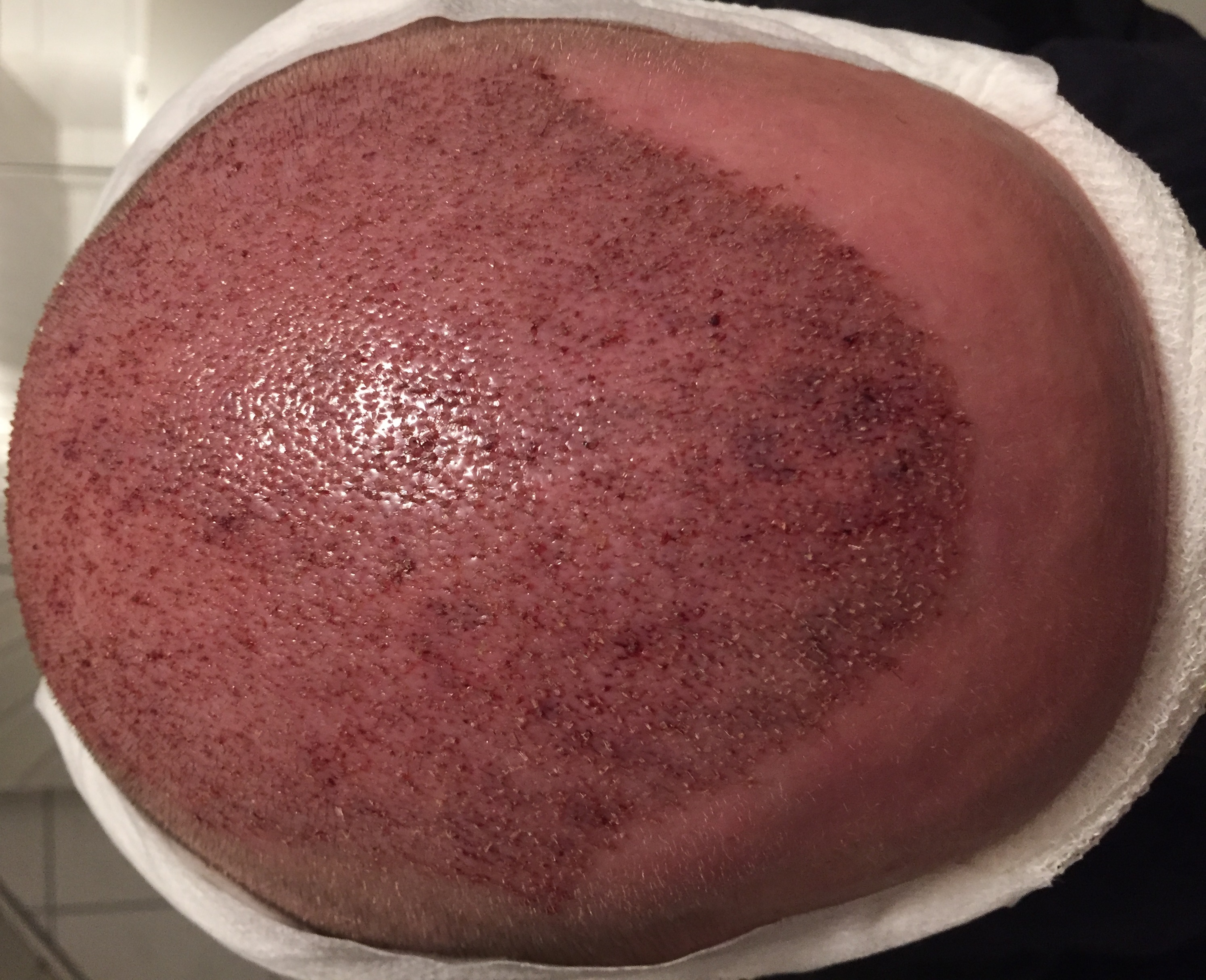 18:10Uhr fertig. Mir wurde gesagt, dass 4200 Grafts (Besprochen waren übrigens 4000) versetzt wurden und das ich eine tolle Spenderfläche hätte. Fast durchgehend 2-3 Haare pro Graft. Sogar der Tonsur konnte dichter beflanzt werden als angenommen.