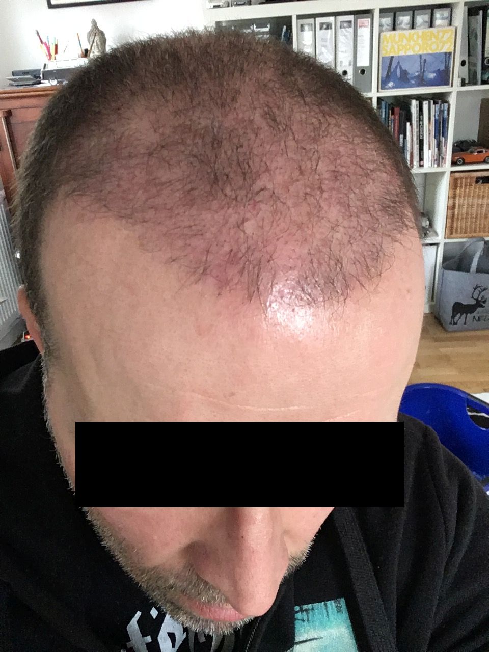 Nach ca. 2 Monaten hat das Taubheitsgefühl im Implantationsbereich auch etwas nachgelassen, heute nach 3 Monaten ist es fast wieder gut. Nach ca. 3 Monaten ist dann auch die Rötung der Kopfhaut deutlich besser geworden und die Haare haben angefangen zu wachsen.