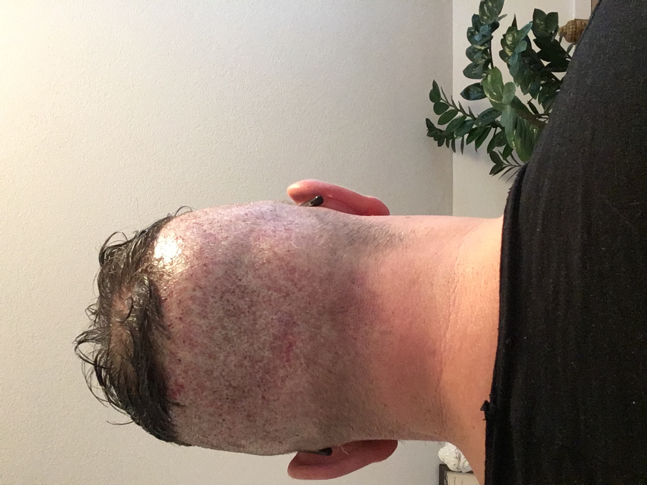und hier noch Bilder ca. 1 Monat nach der OP. Ich denke, da sieht man jetzt keine allzu großen Unterschiede da vermutlich auch ein Teil der implantierten Haare inzwischen wieder ausgefallen ist.