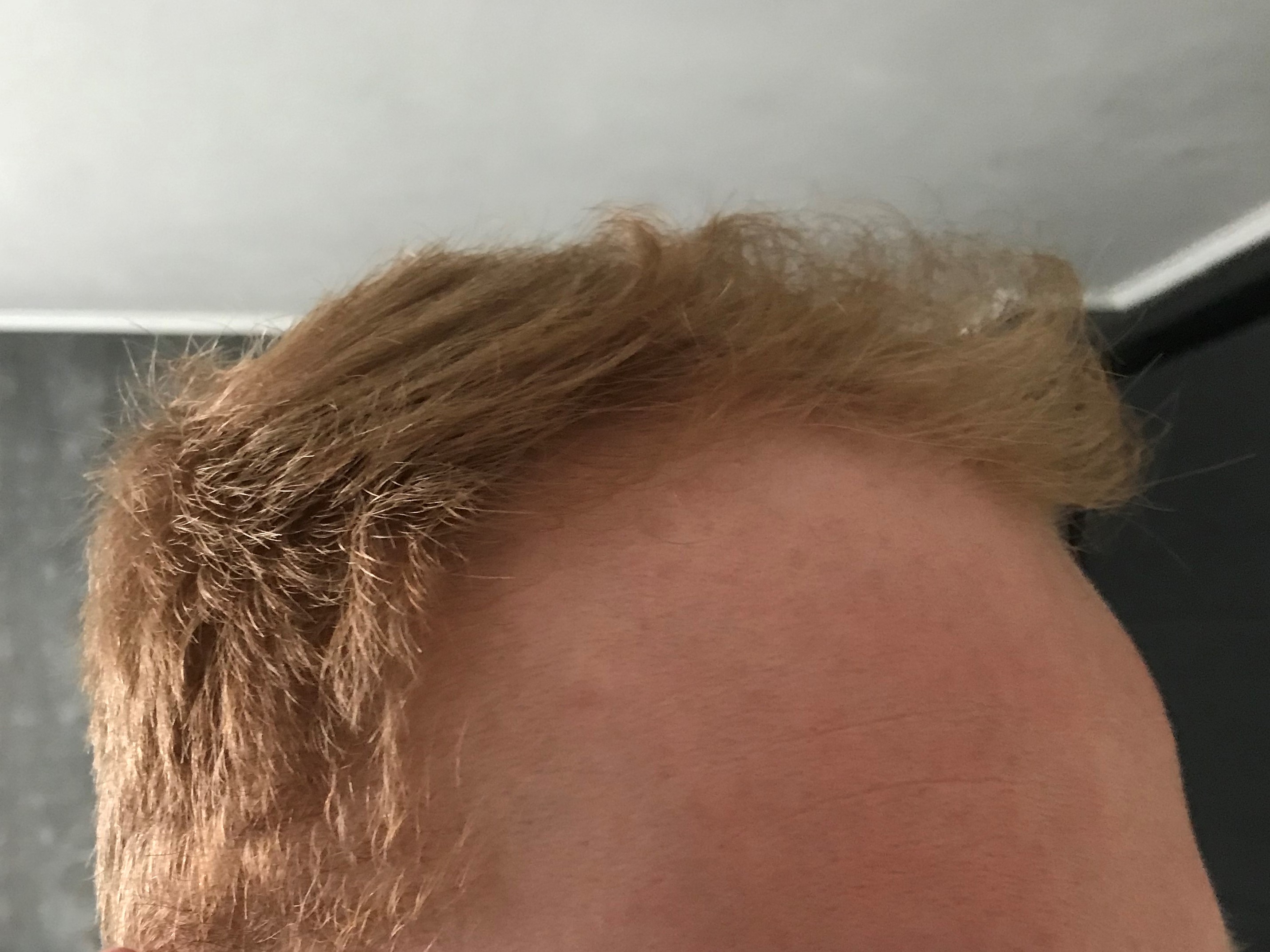 Ansonsten ist zu sagen, dass die Haare nun deutlich länger sind, was generell der Dichte zugute kommt, aber die Problemstellen (Mitte und rechte Seite) sind weiterhin da.