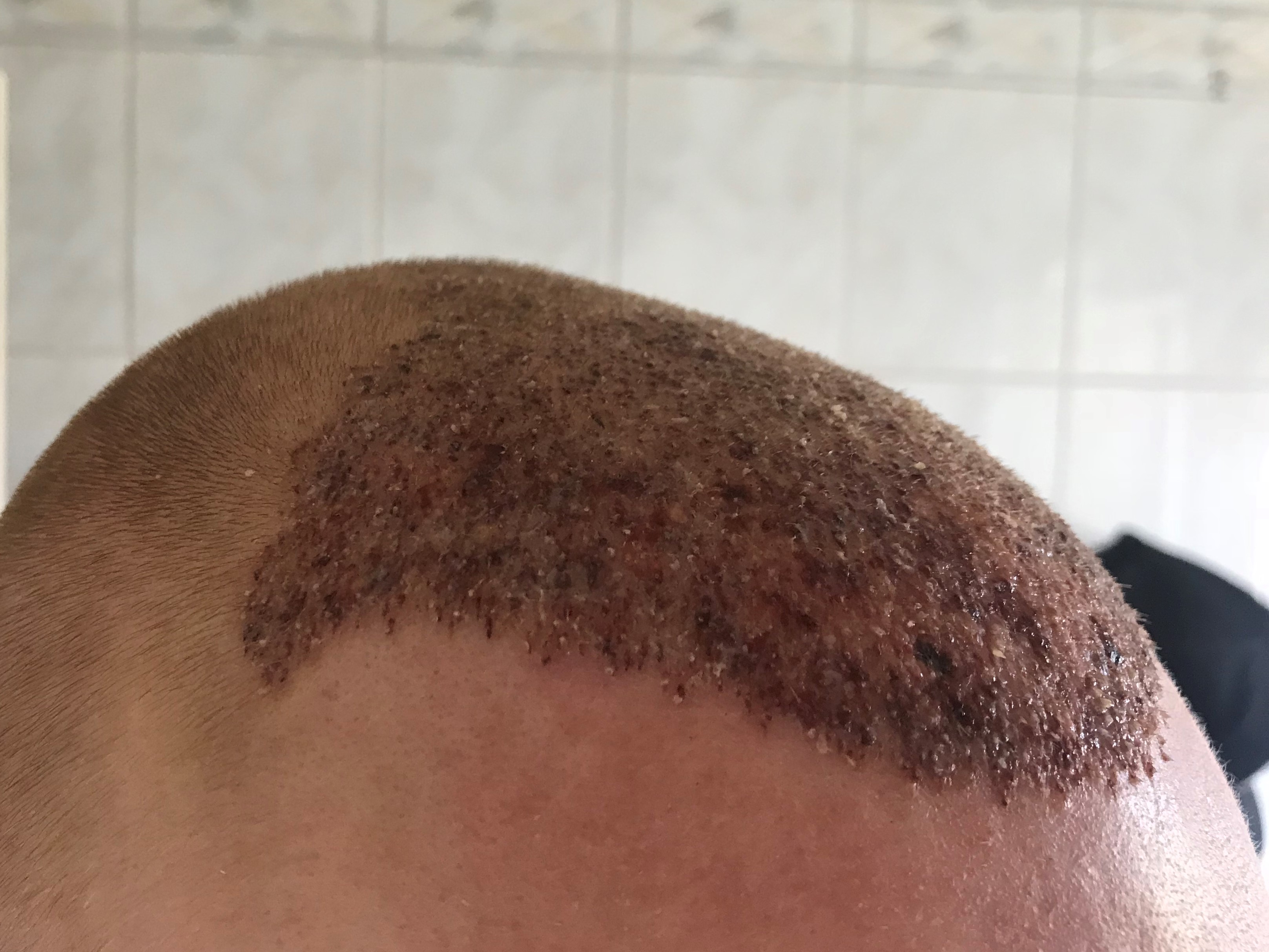 Die Rötungen sind immernoch deutlich, die ersten Haare fangen an zu wachsen. Diese sind allerdings noch sehr hell und haben noch nicht die Haarfarbe der restlichen Haare angenommen. Bekomme zusätzlich sowohl im Empfänger als auch im Donorbereich unregelmäßig Pickel, welche ich Ausdrücke und desinfiziere.