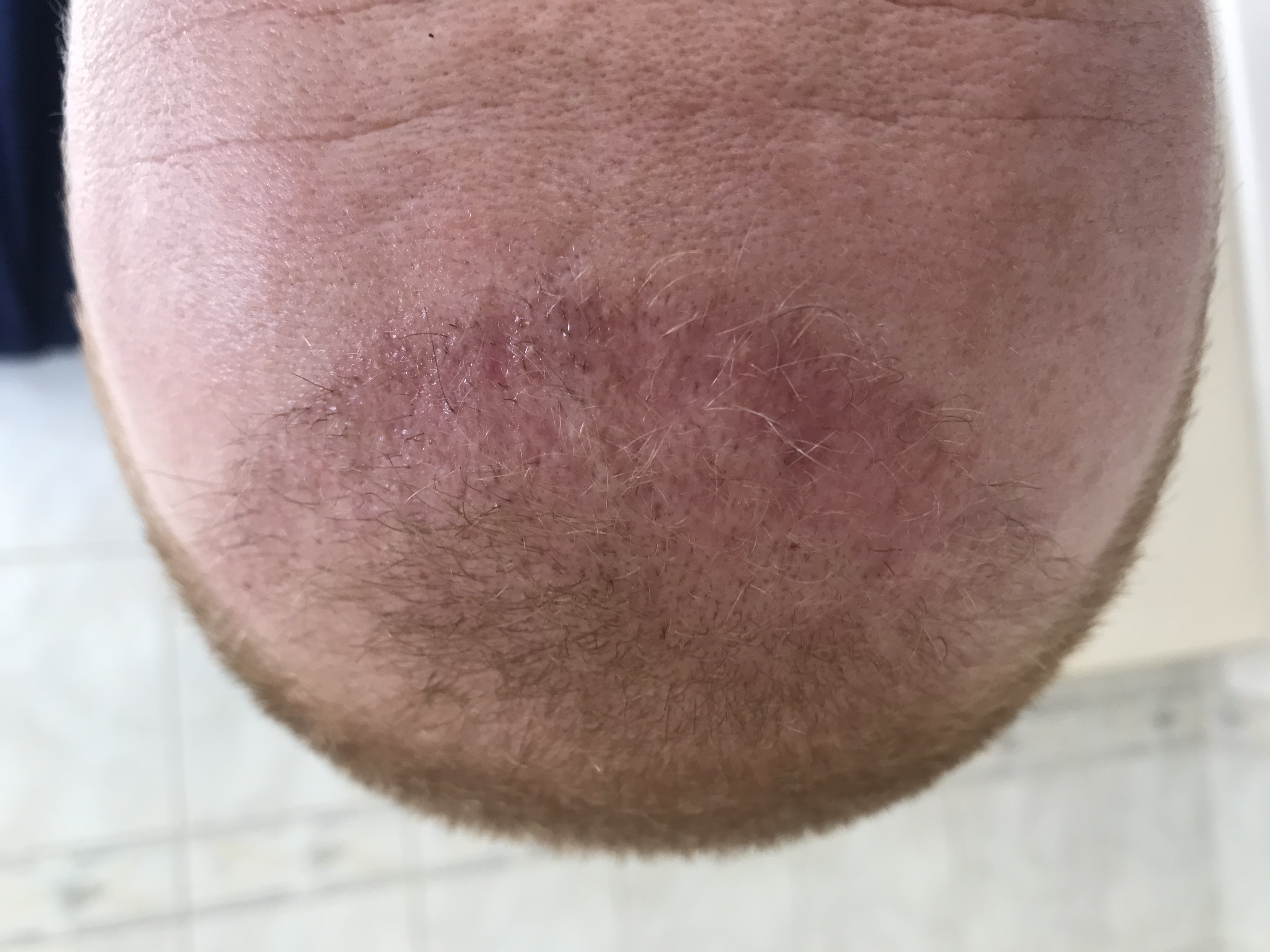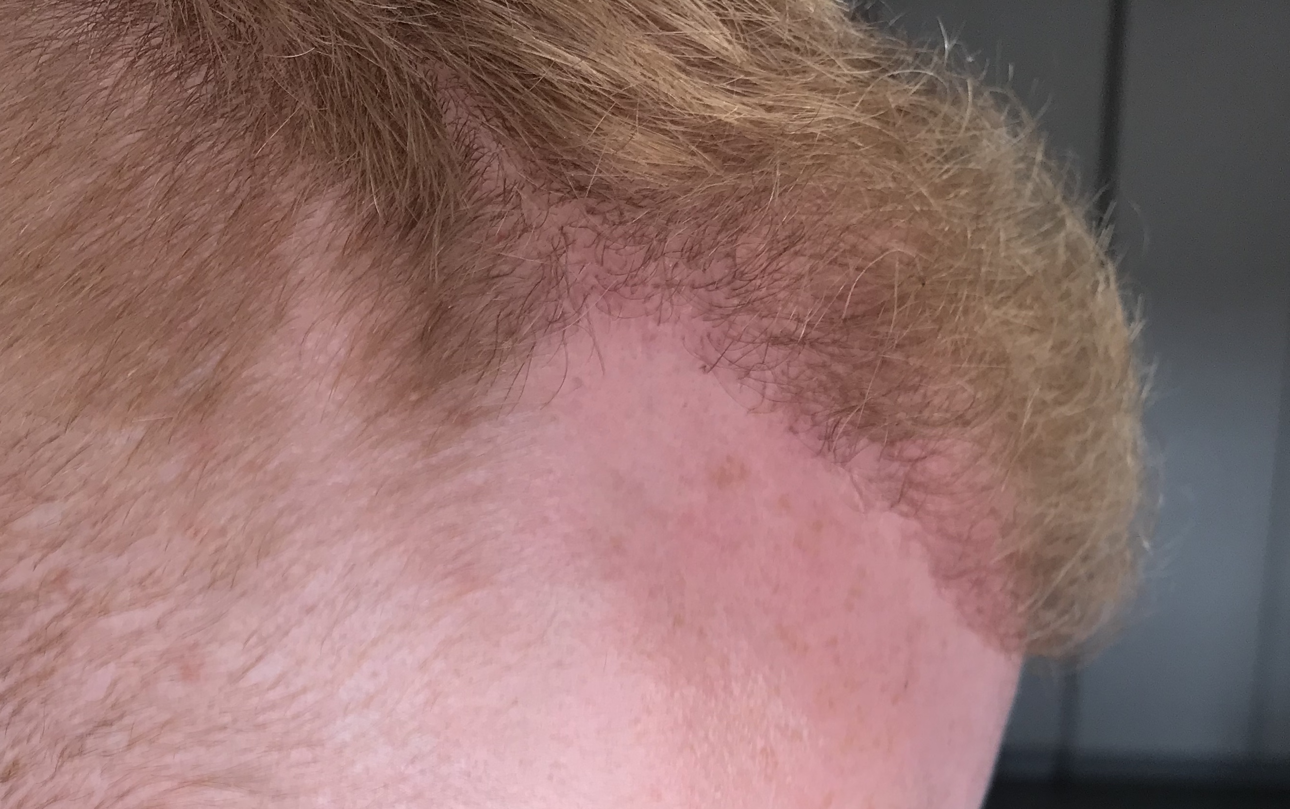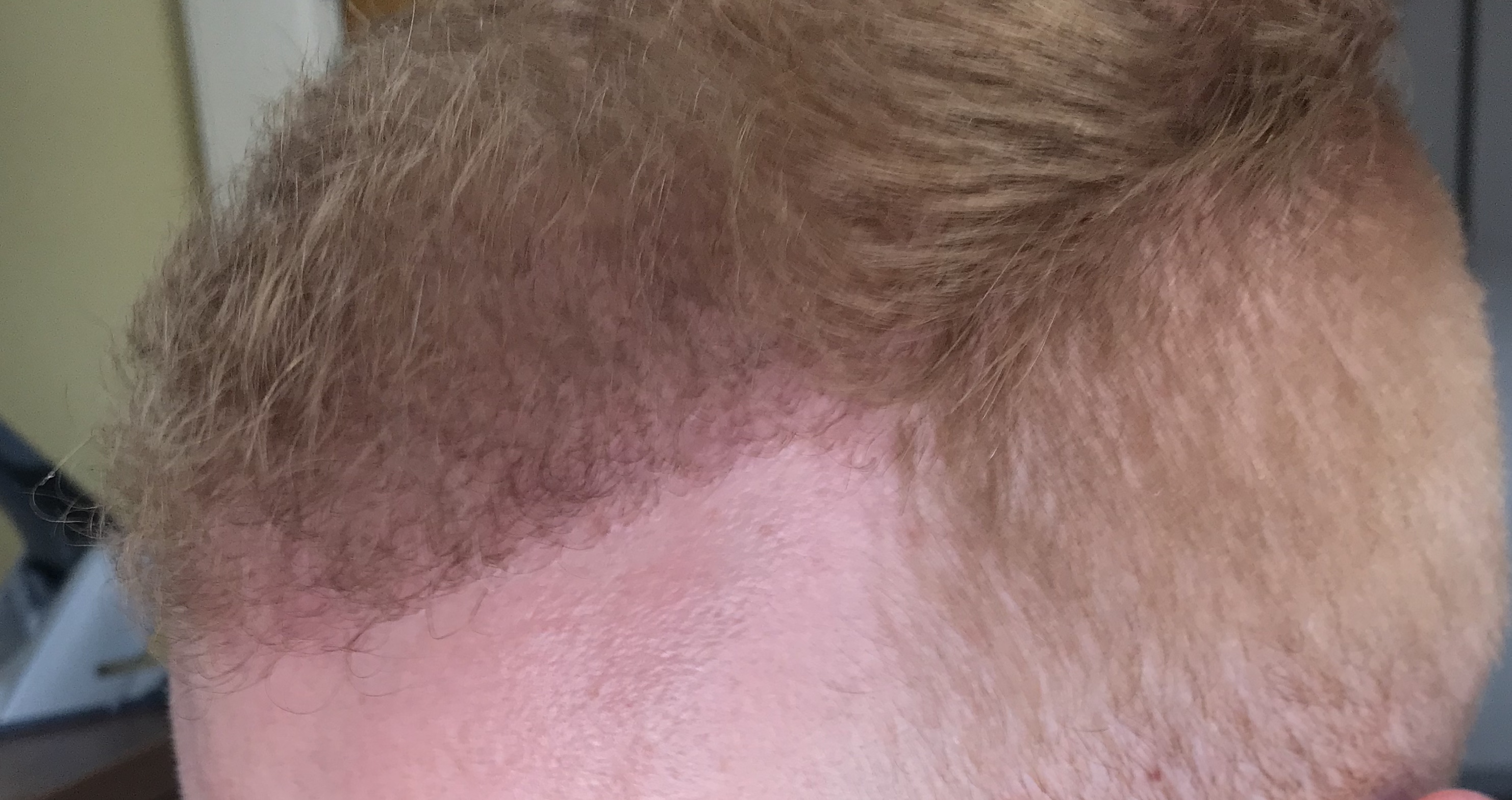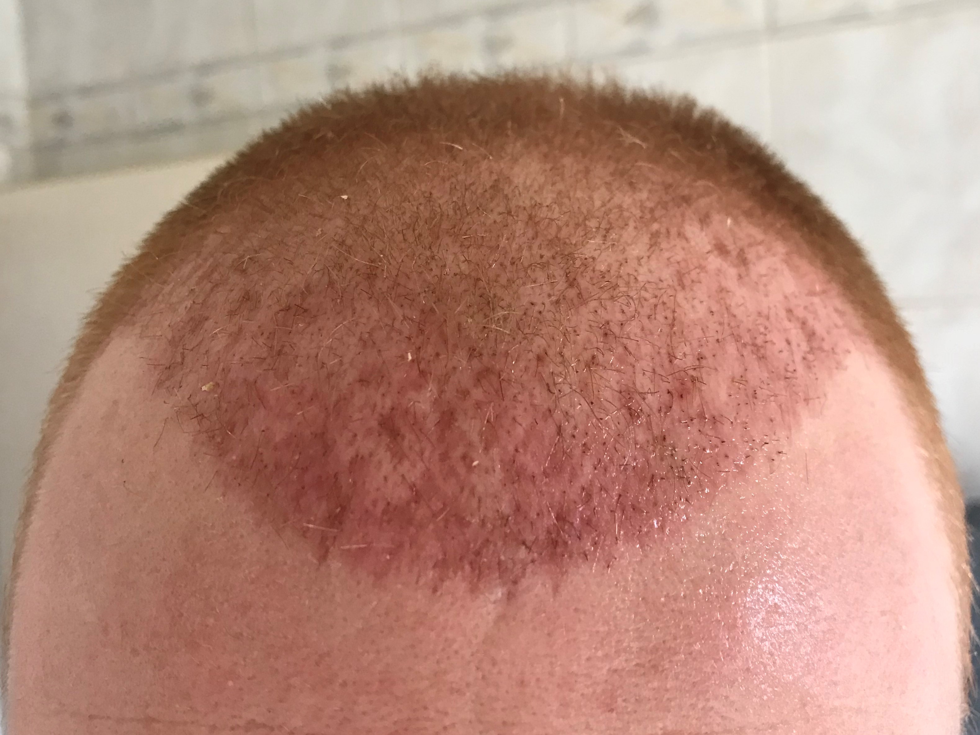 Die Rötung ist gerade an der Haarlinie am stärksten, was aber auch irgendwie logisch ist, das dort die höchste Dichte verpflanzt wurde.