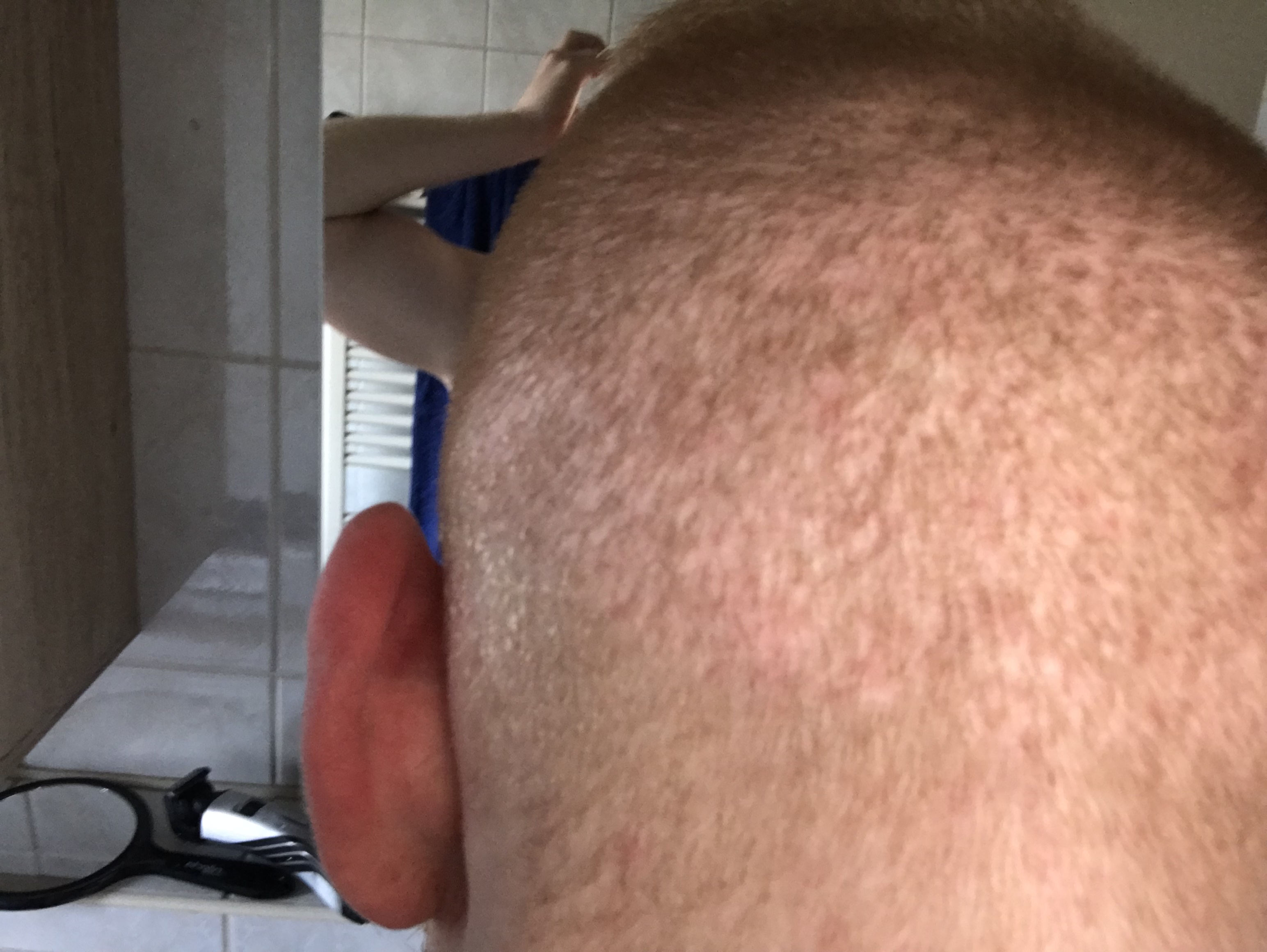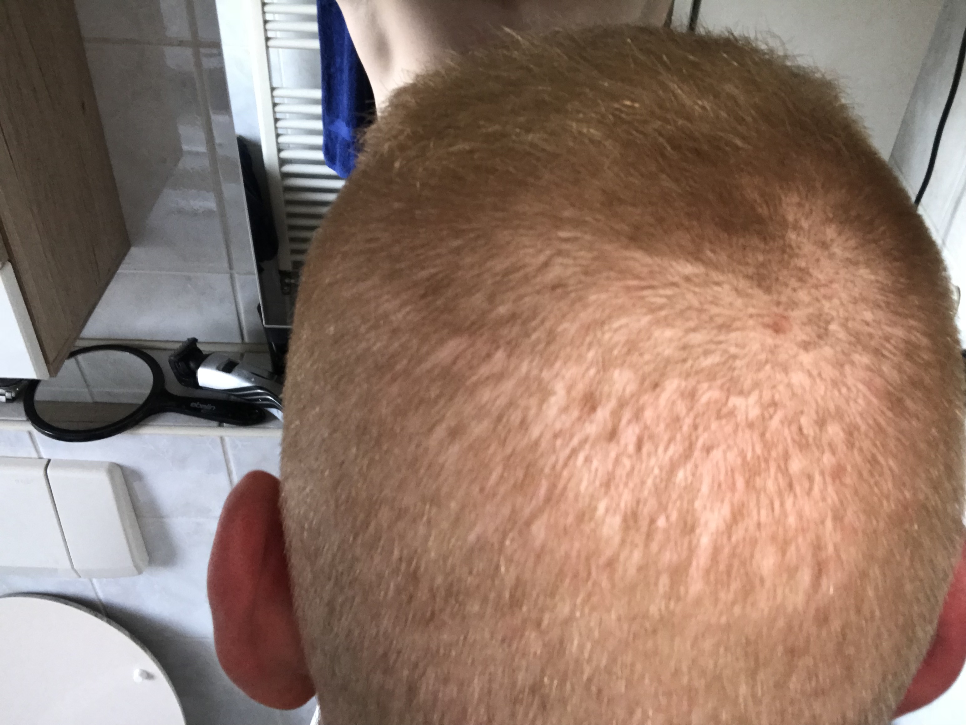 Gefühlt sind mir ca. 70% der Haare durch das Auftragen von Lotionen und durch das Waschen ausgefallen. Schön sieht es nicht aus, aber da muss ich jetzt durch.