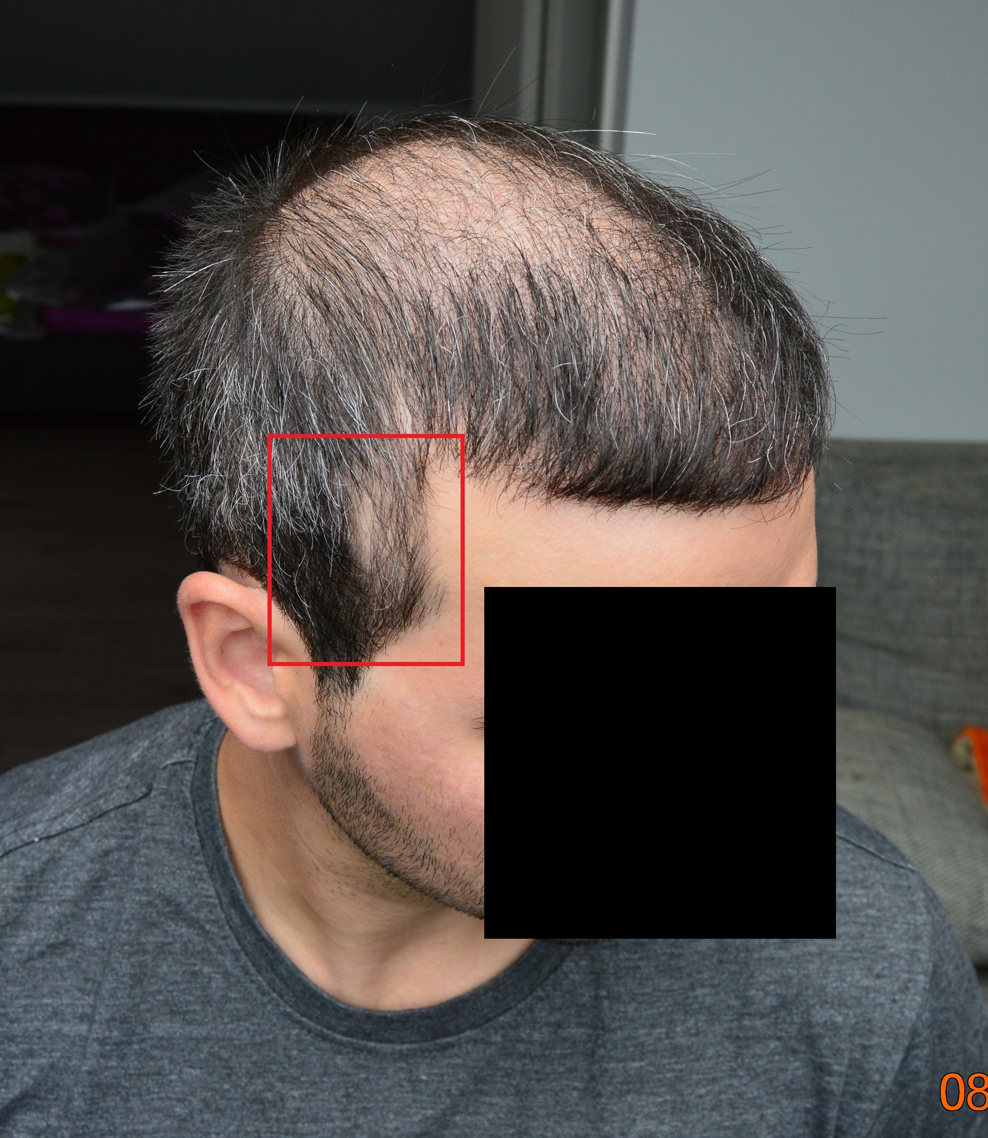 Ja rechts wurden ein paar Grafts eingepflanzt. Mir war vom Anfang an klar dass es einfach zu wenig ist. Obwohl das mein Wunsch war, die Schläfen zu verdichten.