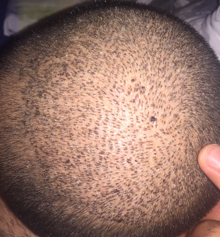 Aber wenn ich mir die Kopfhaut anschaue sehe ich nicht mal Stoppeln