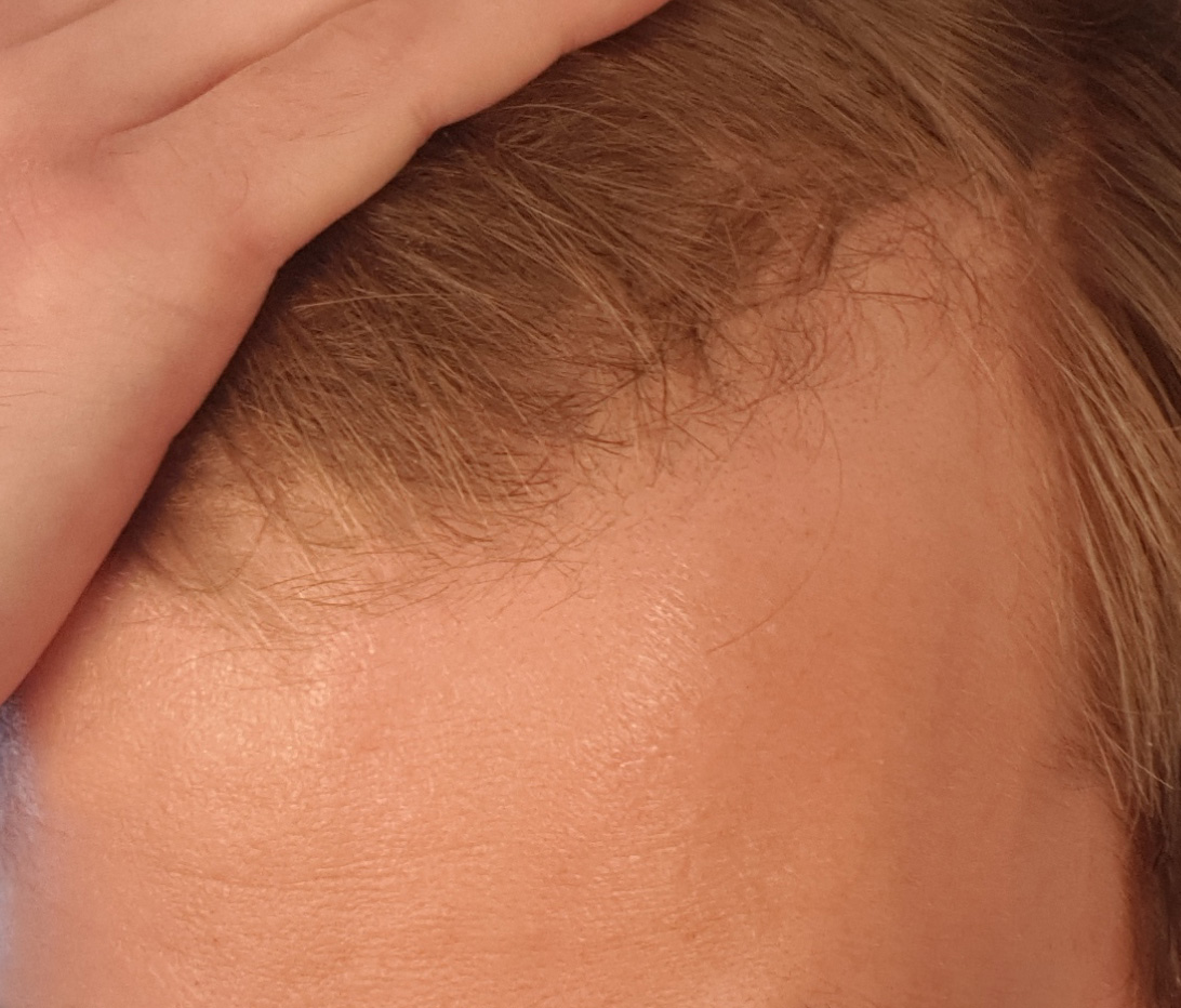 Ziemlich viele kleine Härchen nachgewachsen, auch an den Schläfen. An der rechten GRE sind sie sogar schon richtig lang, da ist ein ganzer Streifen dazugekommen. Die Mitte ist leider nicht wirklich dichter geworden, nur direkt am Ansatz.
