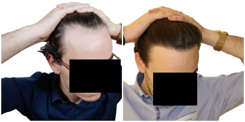 Er gab an, dass er keinen aktiven Haarausfall hat und keines seiner Familienangehörigen einen fortgeschrittenen Haarausfall hat.