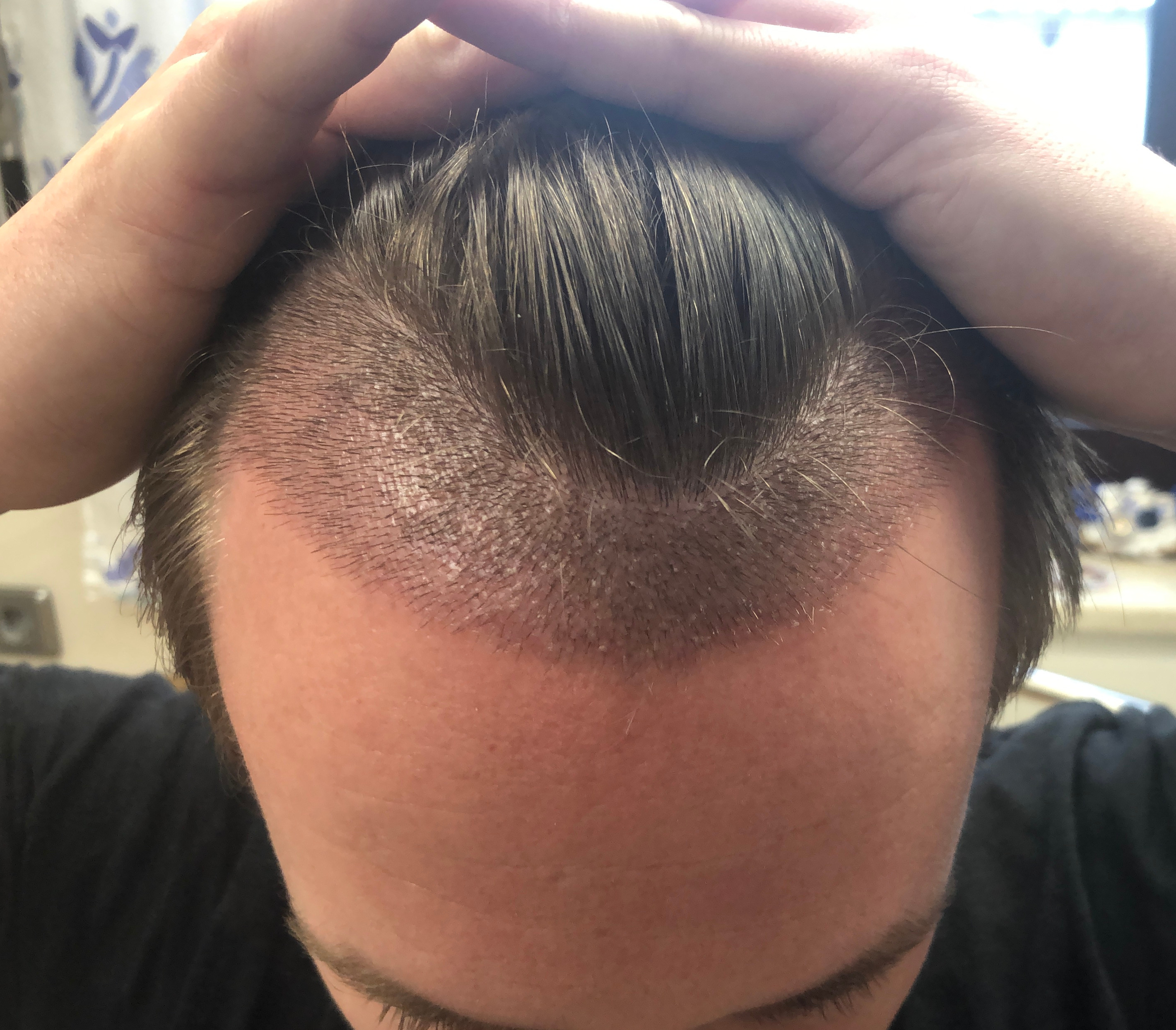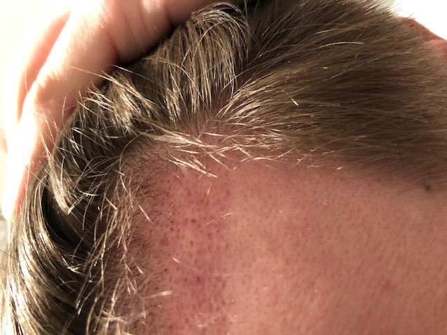 Mittlerweile scheint der größte Teil der Haare ausgefallen zu sein. Begann so in Woche 2 und bis Ende der dritten Woche waren ziemlich alle Haare weg. Bei den kurzen vor der aktuellen Haupthaarlinie bin ich unsicher wie viele davon vorher rasiert wurden und wie viel davon neue Haare sind.