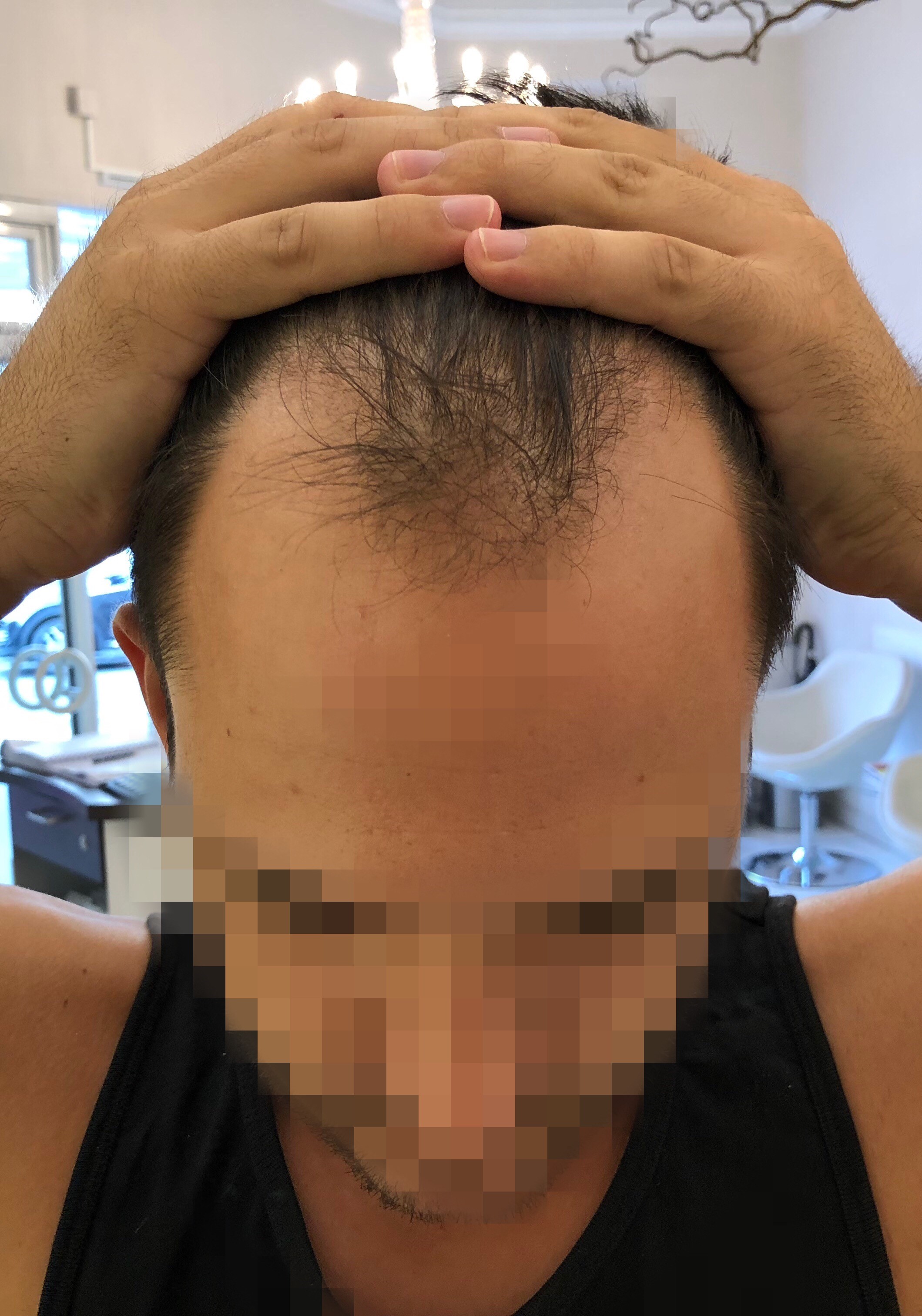 Nun wie gesagt, die Haarlinie ist ein minimales Stück über meiner natürlichen Haarlinie und einen Finger über dem letzten Stirnmuskel. Man stelle sich vor, ich hätte keinen Haarausfall gehabt, dann wäre sie doch auch ähnlich.