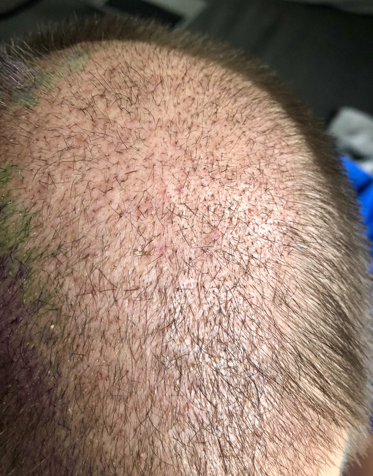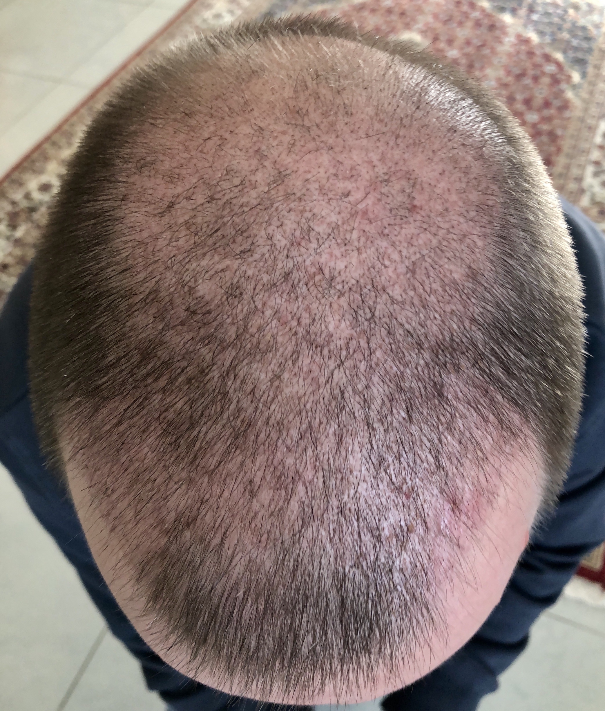 Den Spenderbereich habe ich auf 3mm gekürzt, den Empfängerbereich werde ich erst Ende April wieder auf 3mm trimmen. Die Rötung der Kopfhaut ist noch minimal vorhanden.