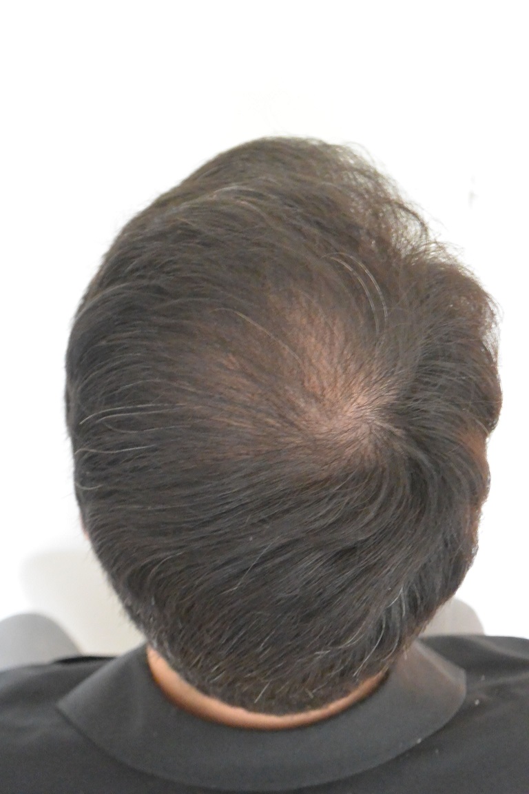 Der Patient hat die meisten Haaren die vor der Op noch da waren weiter verloren so das zum aller grössten Teil nur noch die Transplantate da geblieben sind. Das Resultat sieht auf Anhieb sehr natürlich aus, die gesamte Fläche ist gut abgedeckt und das Ergebnis steht auf "eigene Beine". Weil Transplantate auch seitlich in den "Humps" und im unteren Tonsurbereich prophylaktisch eingepflanzt wurden hat der Patient eine sehr gute Sicherheitsmarge falls der Kranz nach unten rutscht. Im Prinzip ist das Glatzenthema jetzt langfristig gelöst.