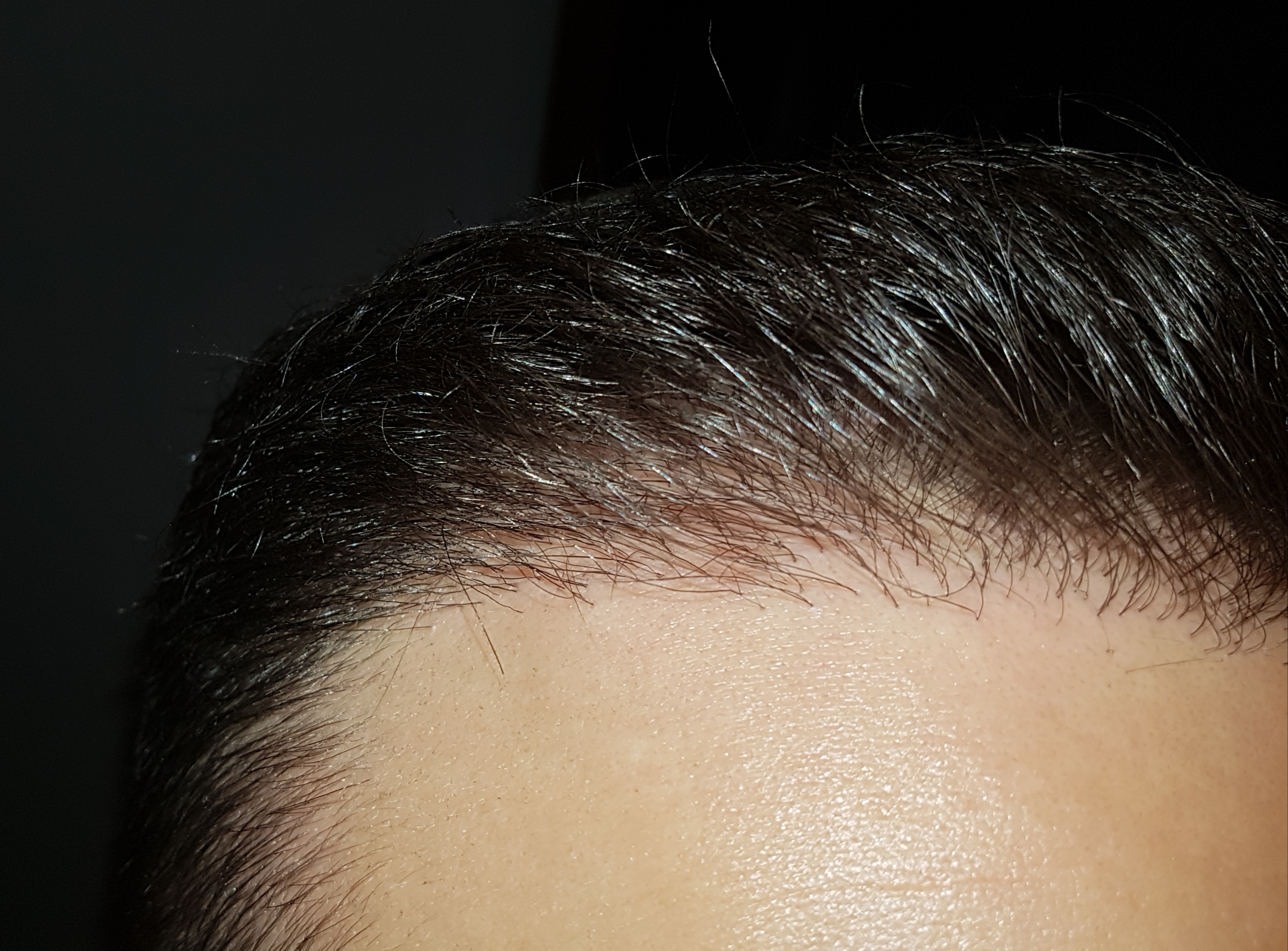 Die Haarlinie wurde mir von der Cinik Klinik transplantiert. Es sind teilweise ein paar 2er und sogar 3er in der Haarlinie vorhanden. Bei der Cosmedica Klinik habe ich die linke Seite der Haarlinie etwas verdichten und die rechte Seite etwas korrigieren lassen. Bei der Cosmedica Klinik wurden nur 1er Grafts in die Haarlinie transplantiert. Heißt für mich, das dort sorgfältiger gearbeitet. Zusätzlich sind die Narben (die weißen Punkte) im Spenderbereich kleiner.
