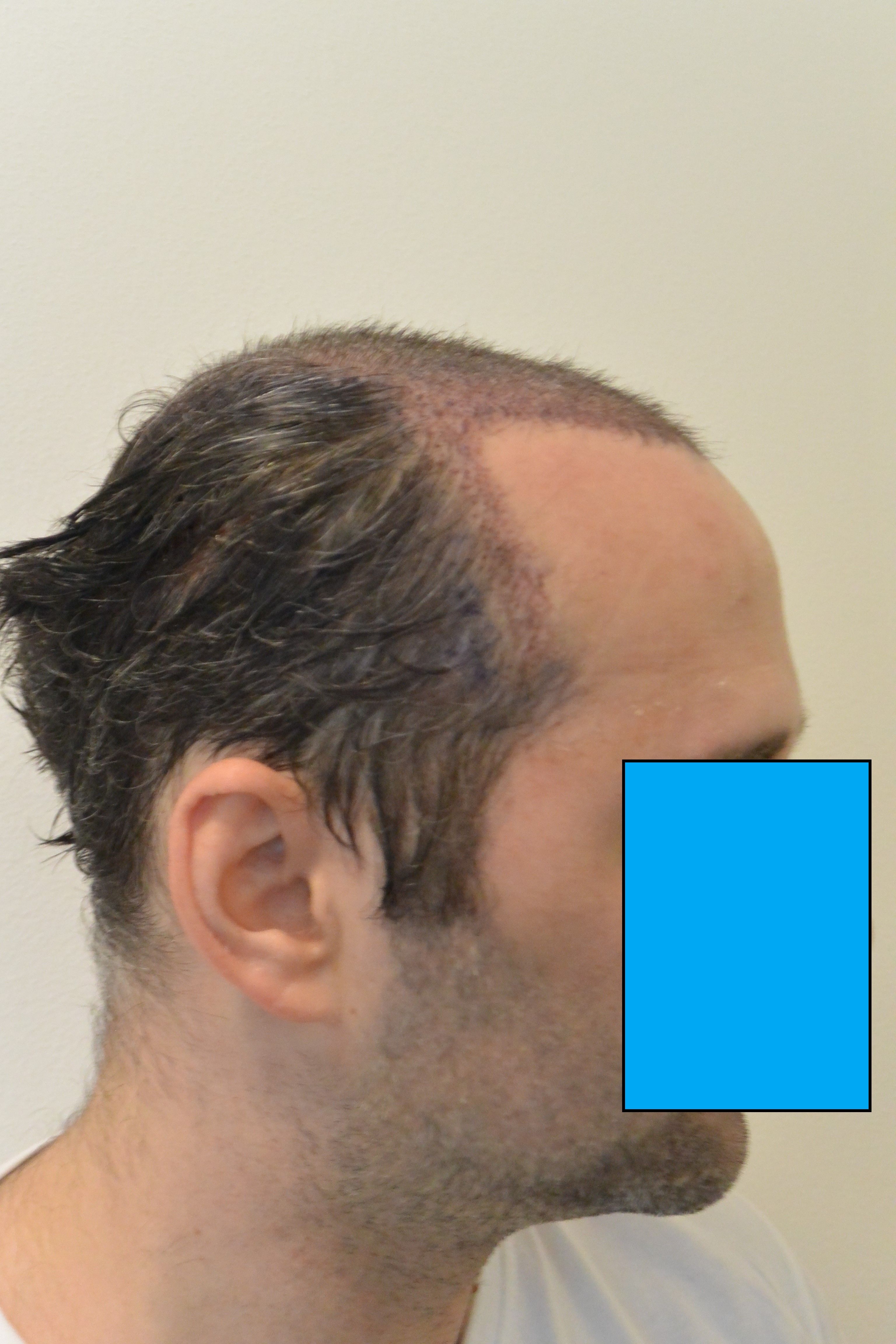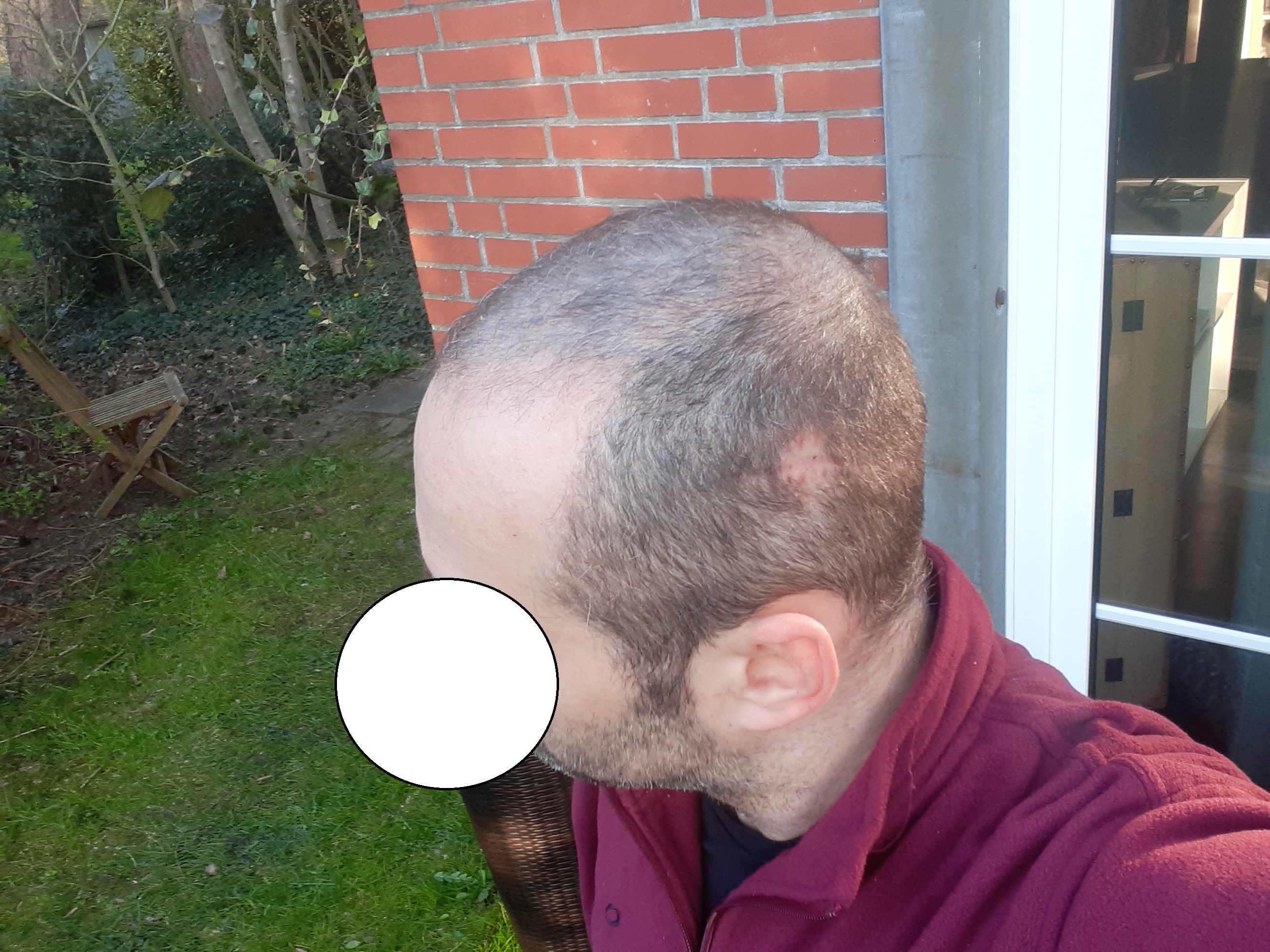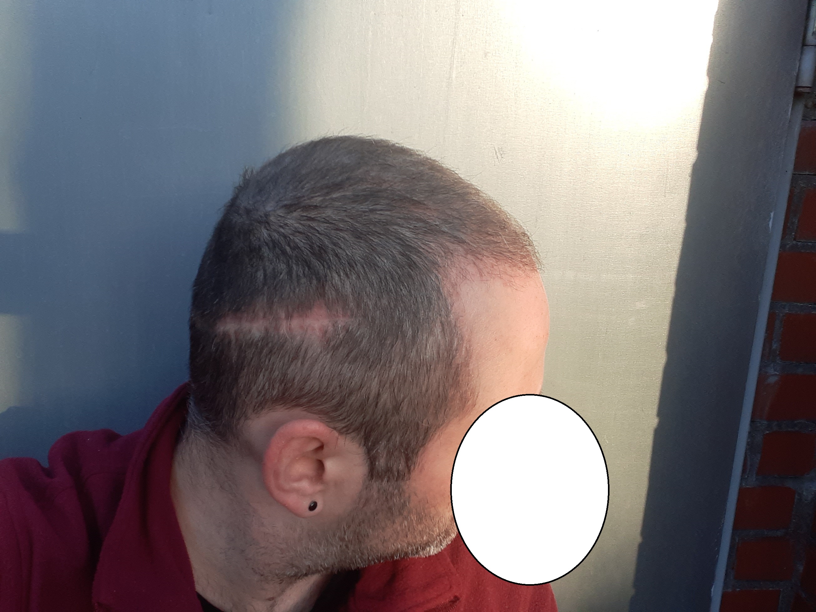 Die Entscheidung fiel dann für eine große FUT, um die gesamte Fläche in einer Sitzung zu behandeln. Es bleiben dann viele Spenderreserven (FUT und FUE) übrig, falls sich der Haarverlust weiter entwickeln wird. Die Narbe könnte ich später mit einer kleinen FUE bepflanzen.