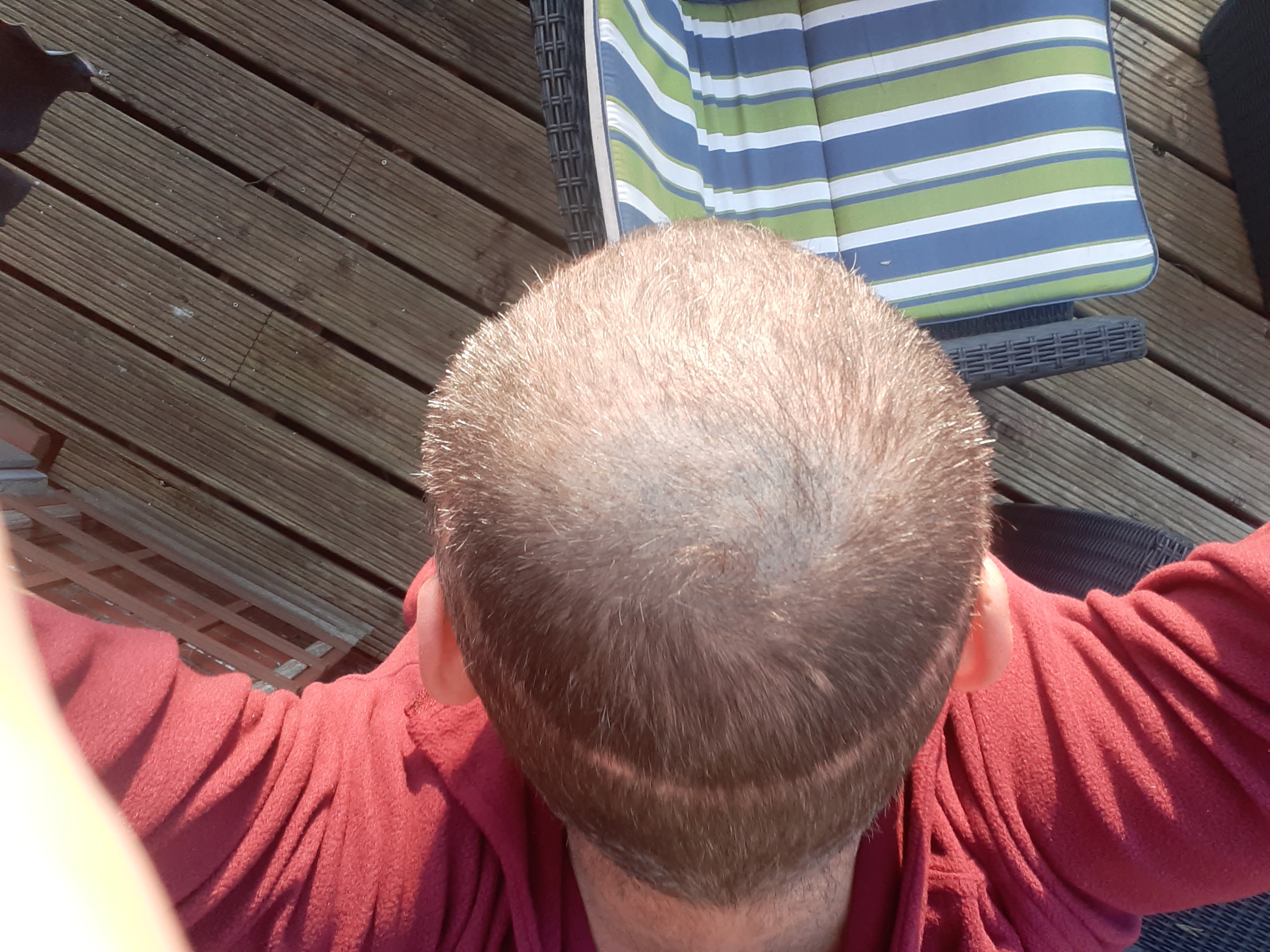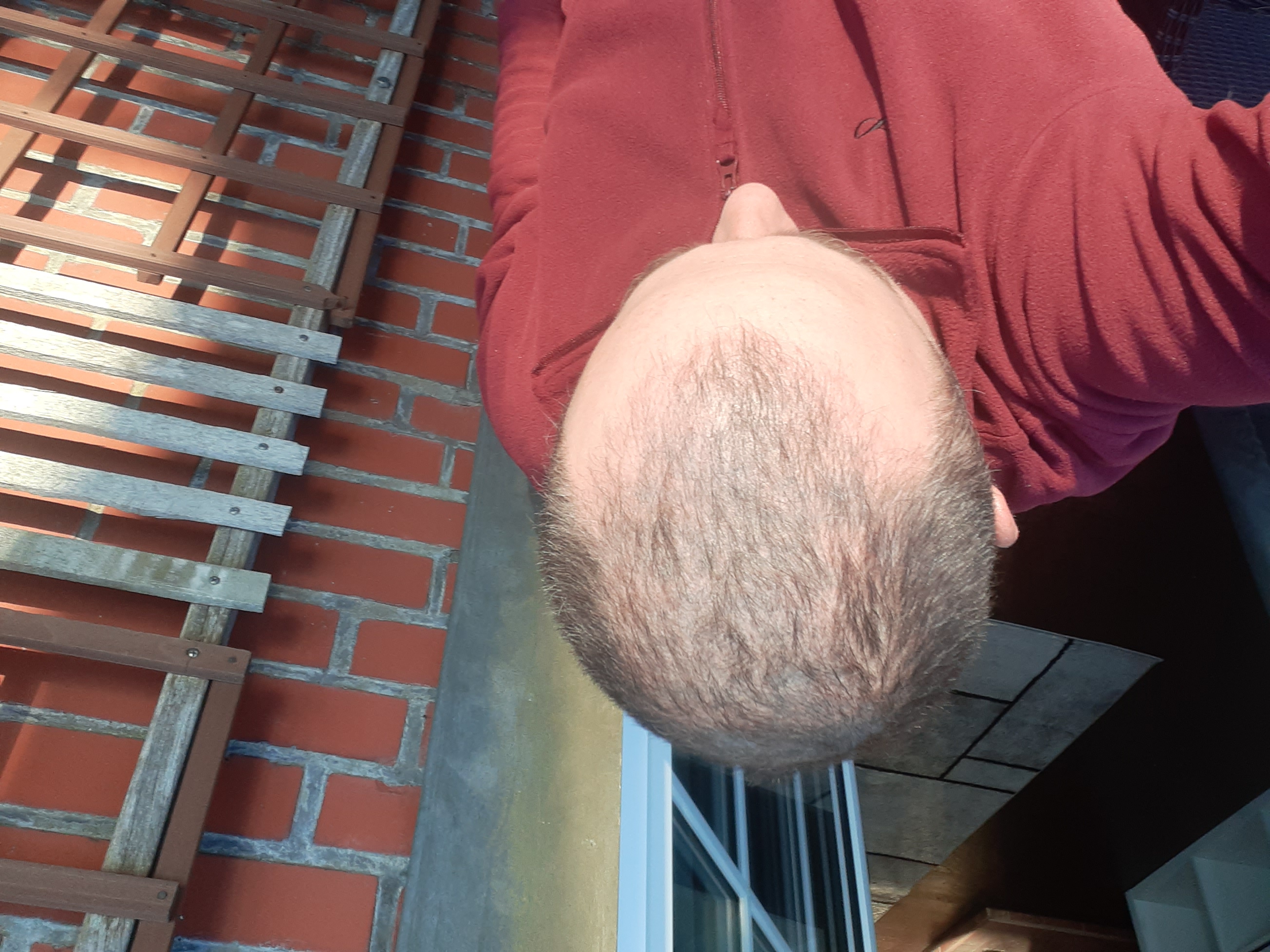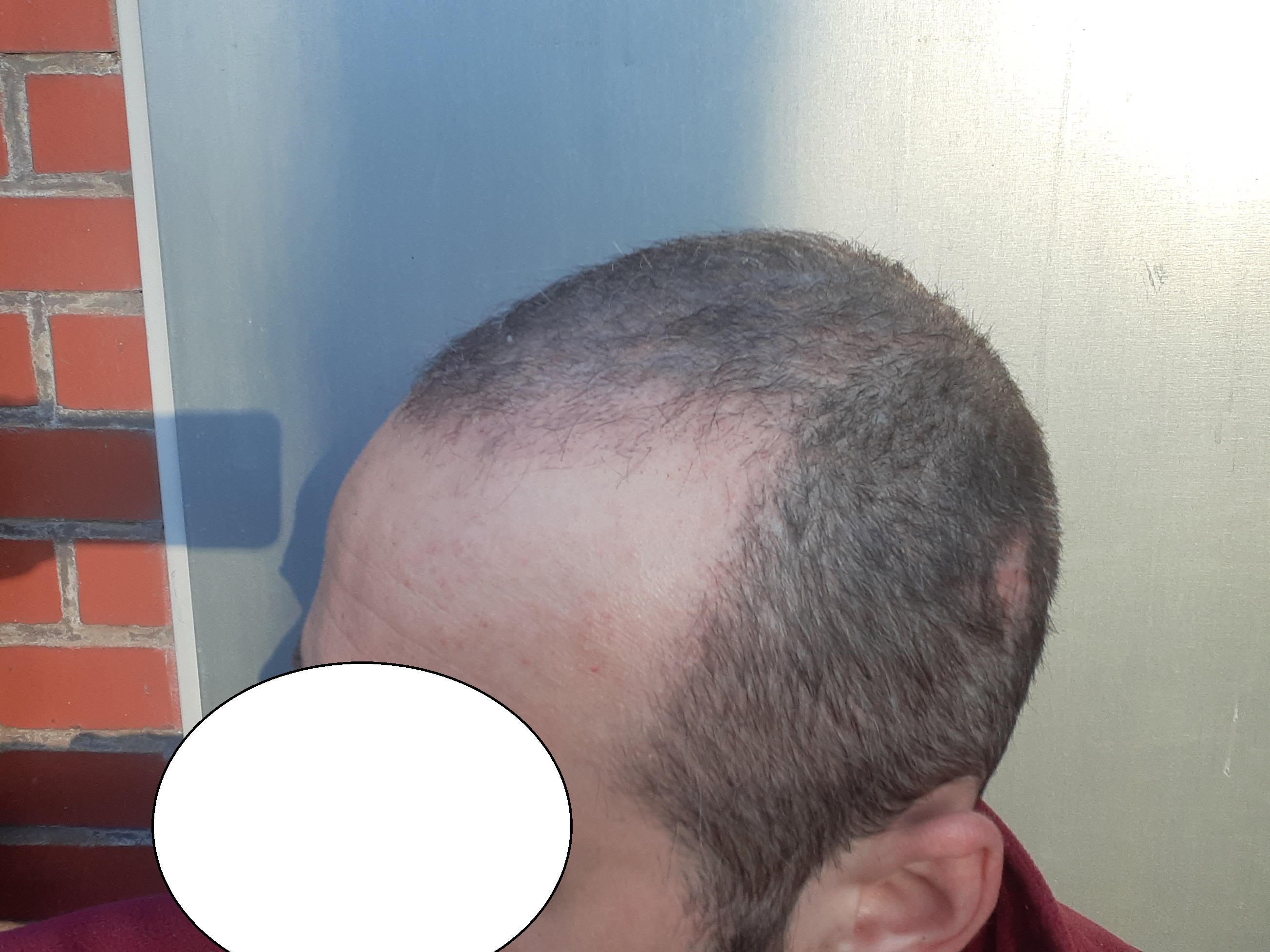 Besonders an der Haarlinie im Frontbereich sind an den transplantierten Stellen weiterhin leichte Rötungen zu erkennen, auch dies ja bekanntlich normal. Sonst geht es mir soweit ganz gut und hoffe, dass die Haare bald wachsen.