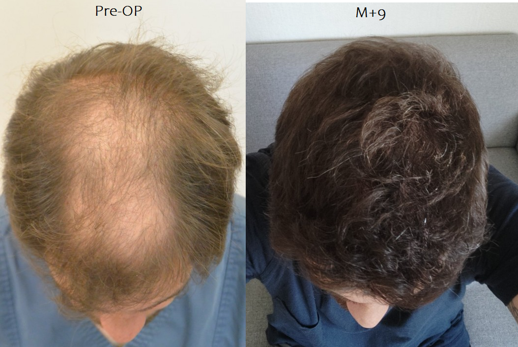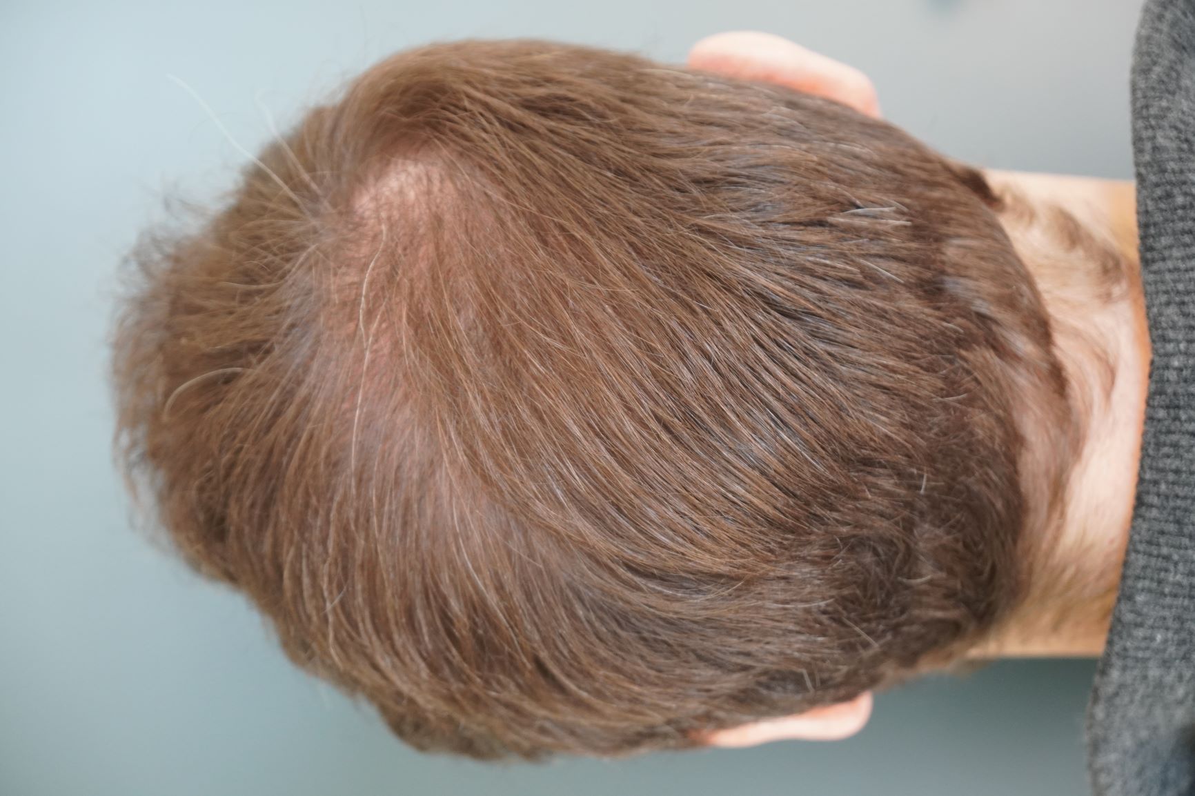 Der Oberkopf beginnt sich zu bedecken, während der Vertex etwas verspätet ist (eigentlich bin ich mir nicht sicher, wie weit das Transplantat nach unten reicht); bei der richtigen Haarlänge bin ich mir nicht sicher, ob das schockierend ist.