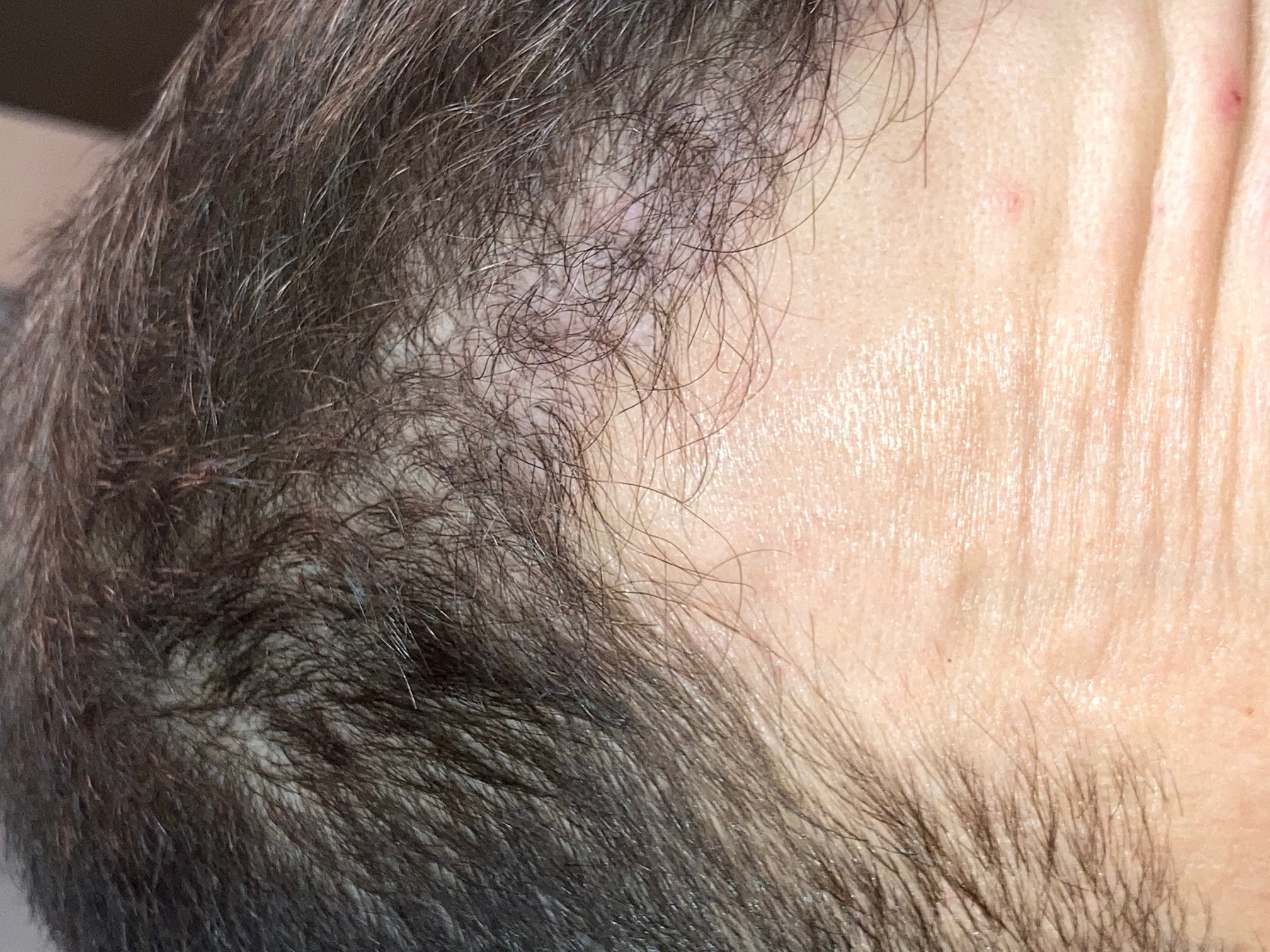 Bestandshaar mittig im Empfängerbereich wächst schon ein bisschen nach, vielleicht lässt sich meine Stirn in den nächsten Wochen und Monaten doch durch einen majestätischen Puschel etwas bedecken. Man wird sehen.
