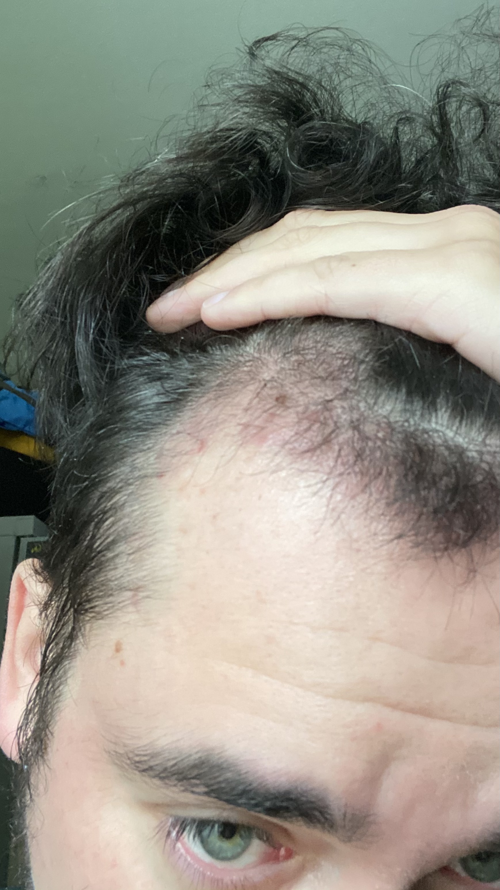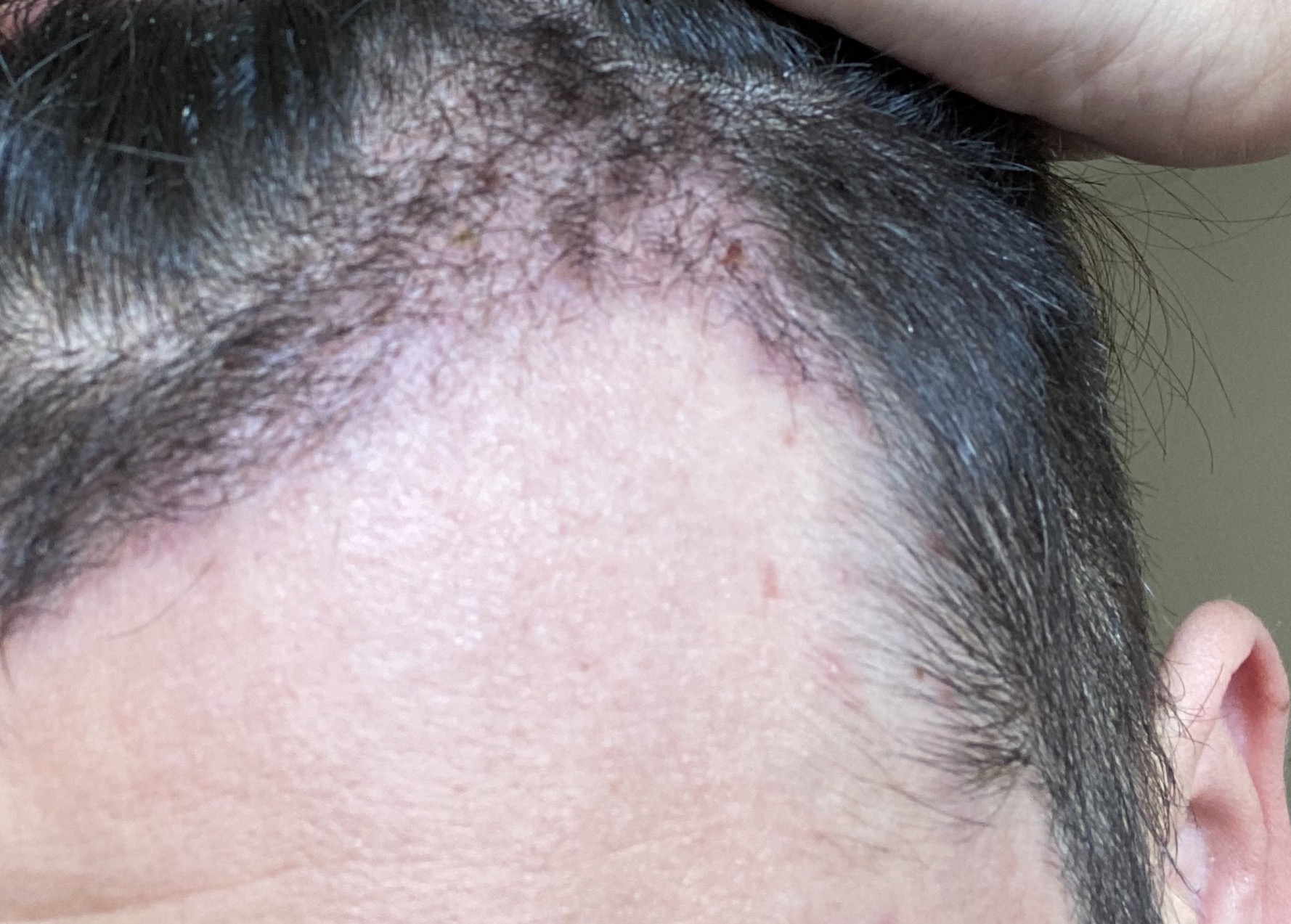 Heute ist Tag 9, die Krusten sind fast alle ab, nur eine kleine links über der Schläfe will noch nicht. Beim waschen waren hier und da auch mal ein Haar dabei, der Rest wird sich dann wohl die nächsten Wochen auch verabschieden.