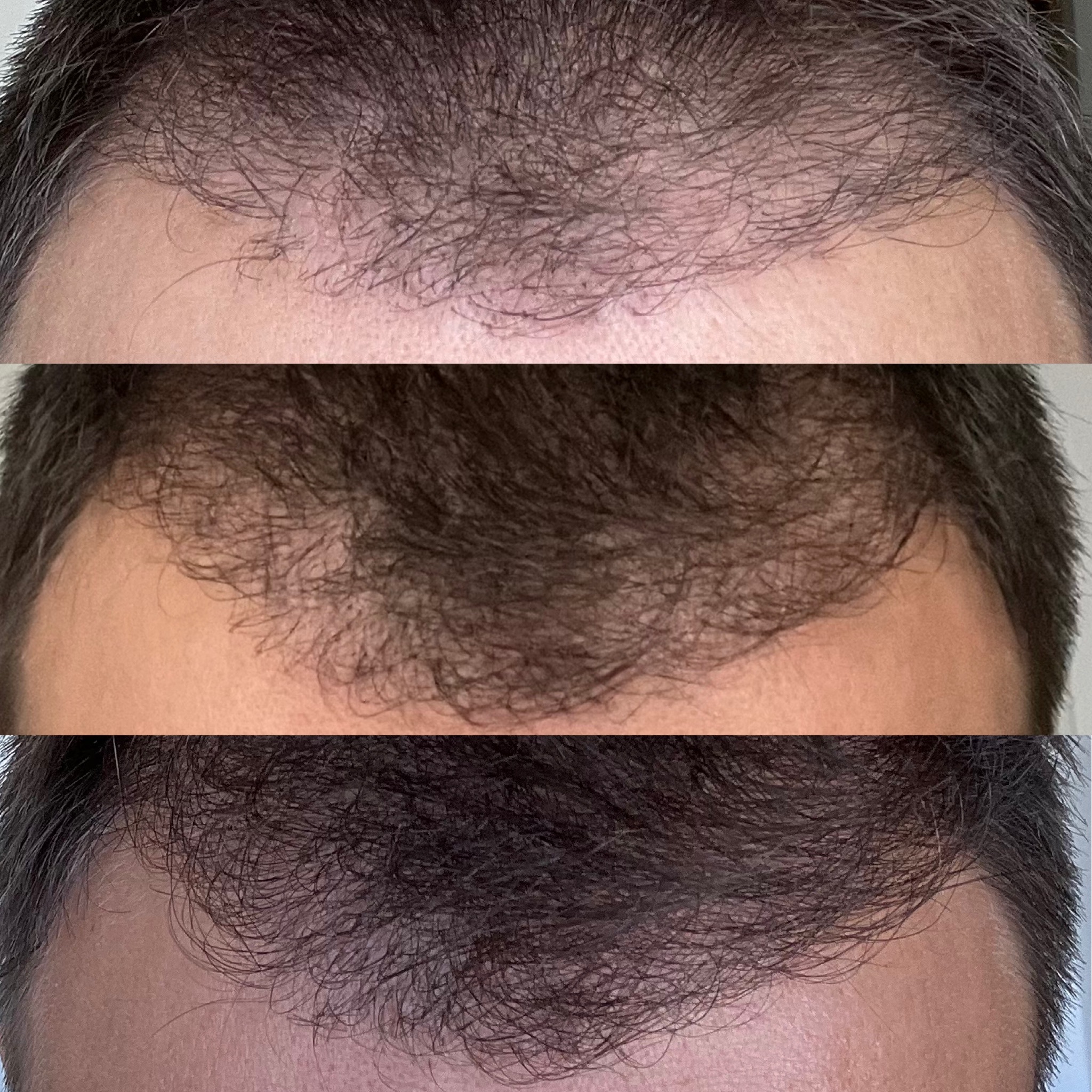 Hier sieht man mal die Entwicklung vom Ende des 4. Monats bis Ende des 6. Monats (von oben nach unten). Aktuell wird’s immer schwieriger „Neuwuchs“ zu erkennen. Das liegt zum einen an der schon erreichten Haardichte als auch daran, dass man jeden Tag checkt... mir ist aufgefallen, dass schon längere Zeit keine festen Stoppeln mehr durch die Haut brechen dafür aber sehr feines Haar. Zu Beginn waren es viele kräftige Haare die durch kamen...