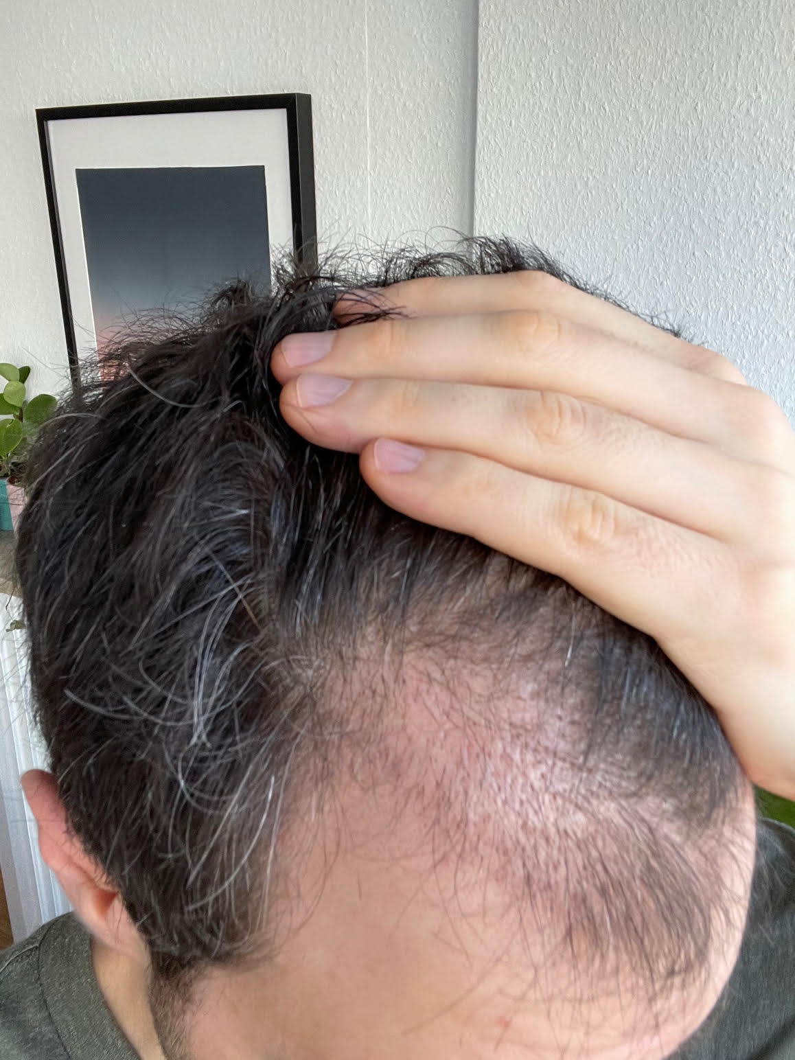Man erkennt eine Haarlinie, aber die Abstände zwischen den Haaren in den vorher kahlen Regionen sind schon noch sehr sehr groß. Müsste ich schätzen, wie groß der Anwuchs bisher ist, würde ich auf 25% bis maximal 30% tippen. Besser als vorher, aber leider noch nicht überzeugend.