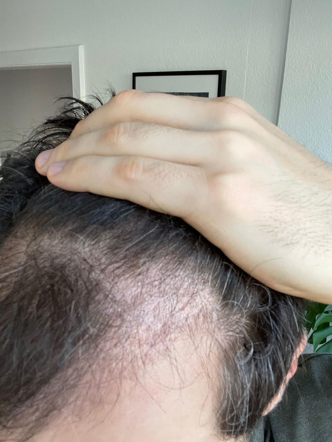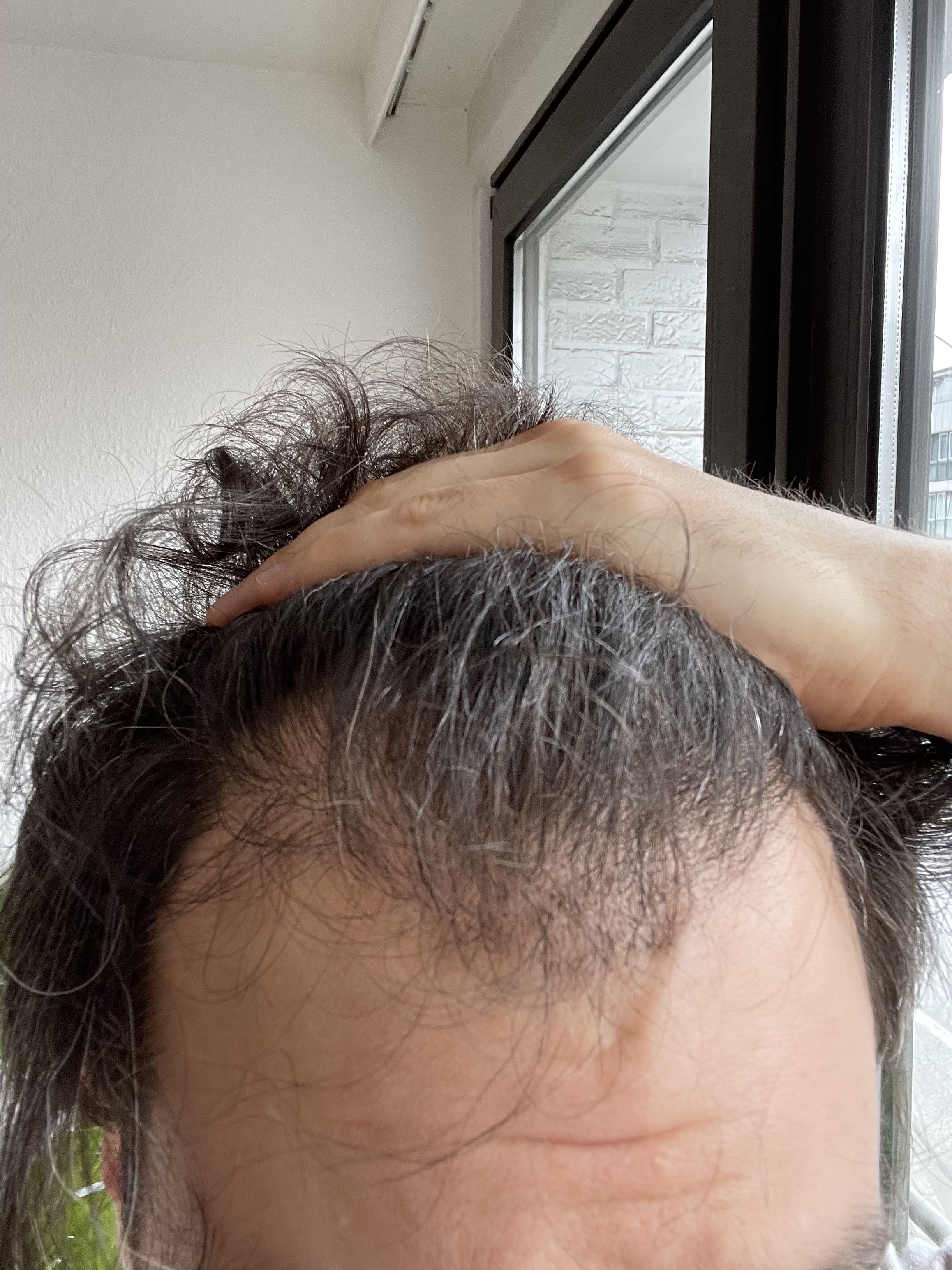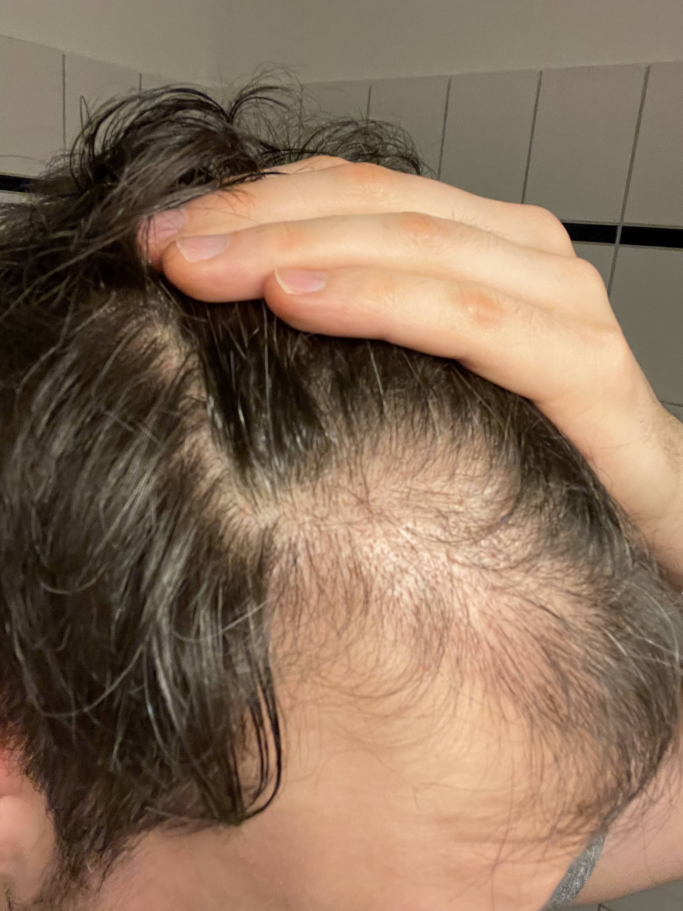 Man erkennt eine Haarlinie, aber die Abstände zwischen den Haaren in den vorher kahlen Regionen sind schon noch sehr sehr groß. Müsste ich schätzen, wie groß der Anwuchs bisher ist, würde ich auf 25% bis maximal 30% tippen. Besser als vorher, aber leider noch nicht überzeugend.