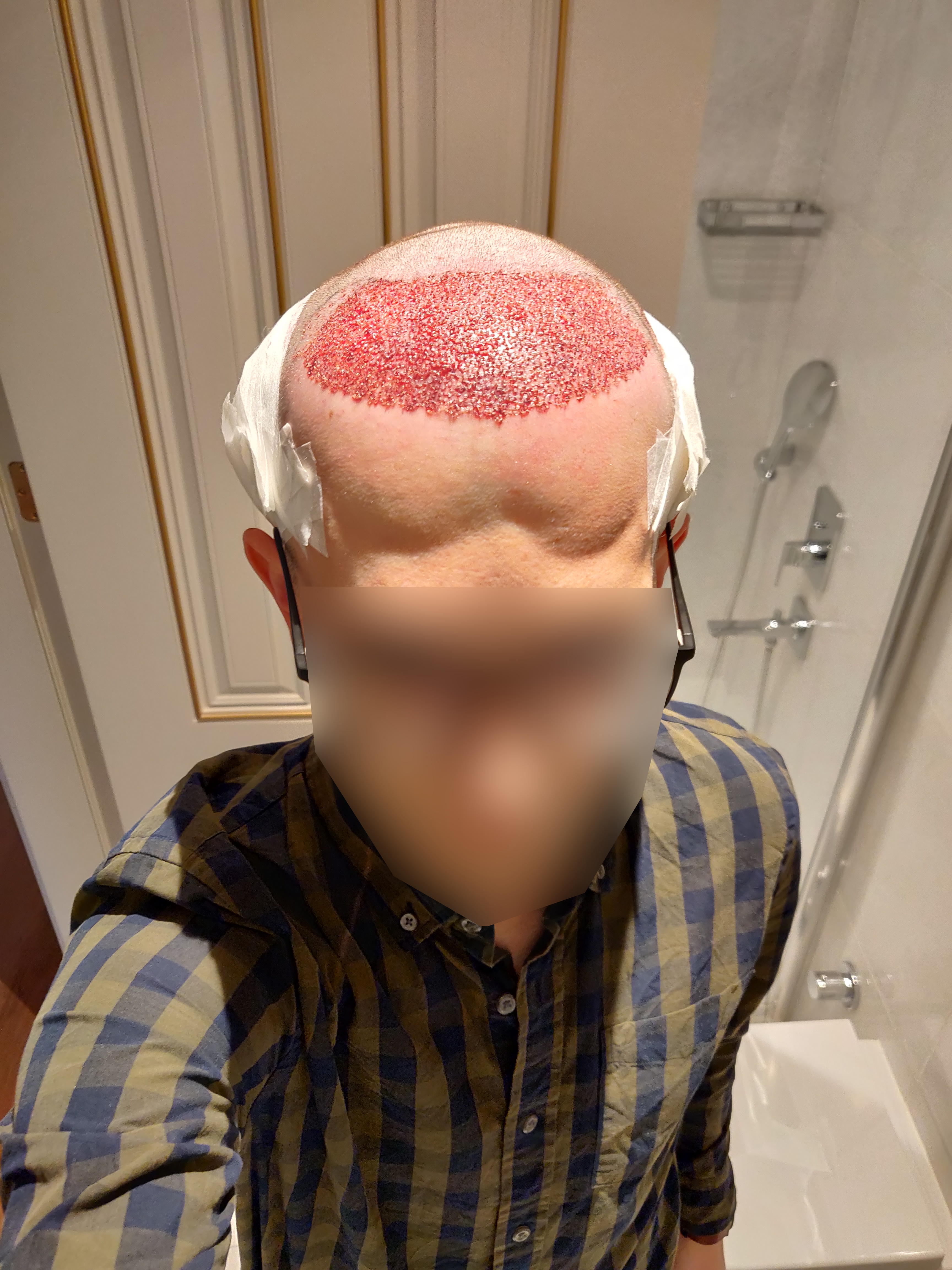 Noch ein Hinweis: Die ingesamt vier Tage waren echt äußerst anstrengend, ich dachte nicht dass es so heftig werden würde. Das Problem waren nicht Schmerzen; bei der OP wurde man ja eh betäubt und hatte somit keine oder nur kaum Schmerzen, und direkt danach hatte ich auch nur für wenige Stunden Kopfschmerzen. Das eigentliche Problem war dass ich echt sehr erschöpft war, also die HT selber und der Tag danach haben sehr an mir gezehrt. Bevor ich mich zur HT entschlossen habe hatte ich auf Youtube Videos gesehen, wo Leute angeblich direkt nachher in die Stadt gehen zum Einkaufen oder Sightseeing, meiner Meinung nach ist das kompletter Blödsinn. Man sieht ja auf dem einen Bild wie mein Kopf dann ausgesehen hat, und ich war so müde ich hätte gar nichts mehr machen können.