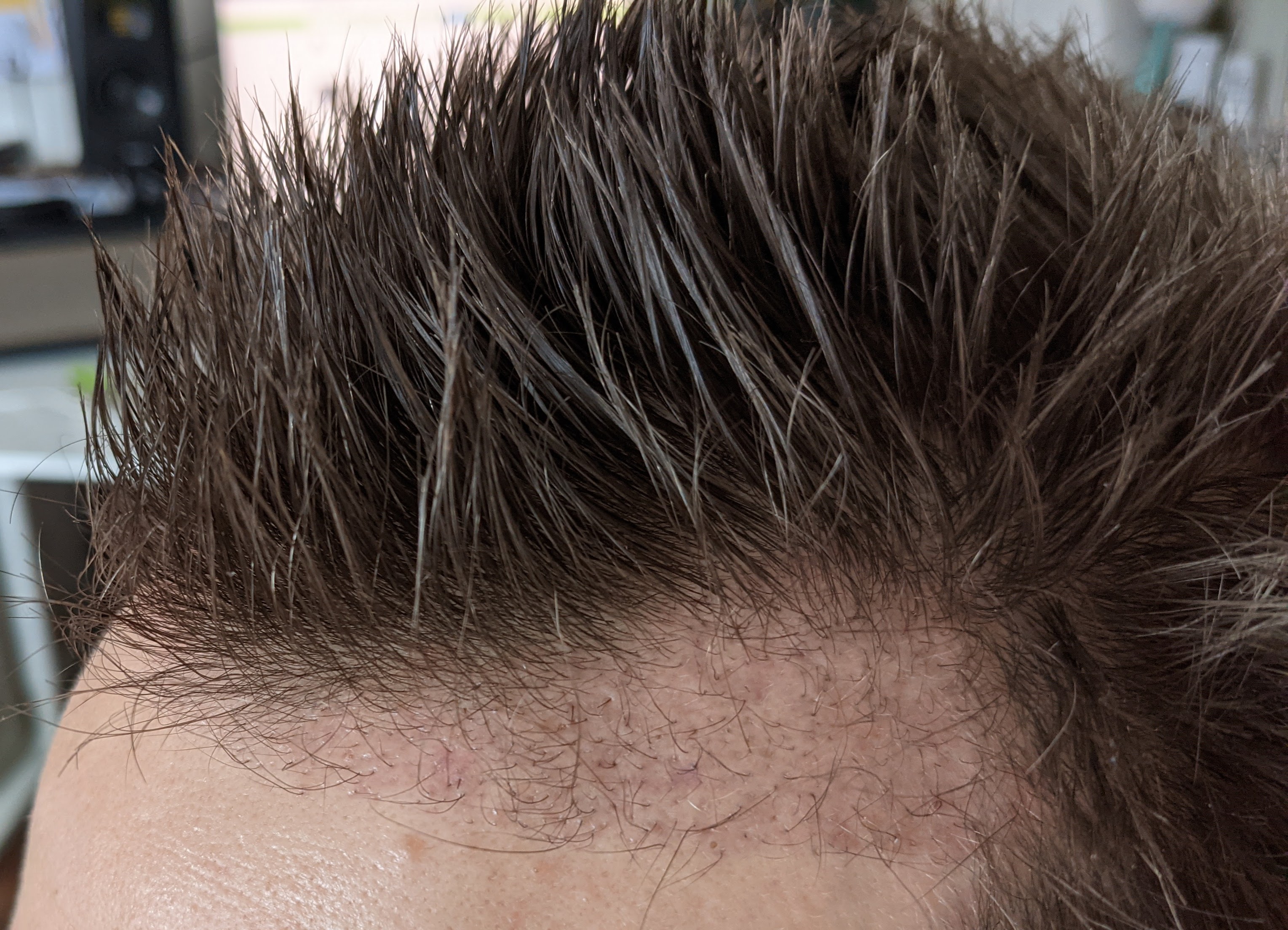 Ich bin jetzt in der 3 Woche nach der OP. Erst fingen gefühlt alle verpflanzten Haare an zu wachsen. Ab der 2 Woche fingen einige an auszufallen und die Wuchsrichtung der meisten Haare war auch nicht mehr so schön (gut zu erkennen auf den letzten Fotos. Aktuell scheint der Ausfall aber erstmal gestoppt, jedenfalls hoffe ich das, vielleicht habe ich ja Glück und es fällt nicht alles aus. Ab dem 10 Tag habe ich übrigens mit Regaine/Minodoxil angefangen, morgens und abends.
