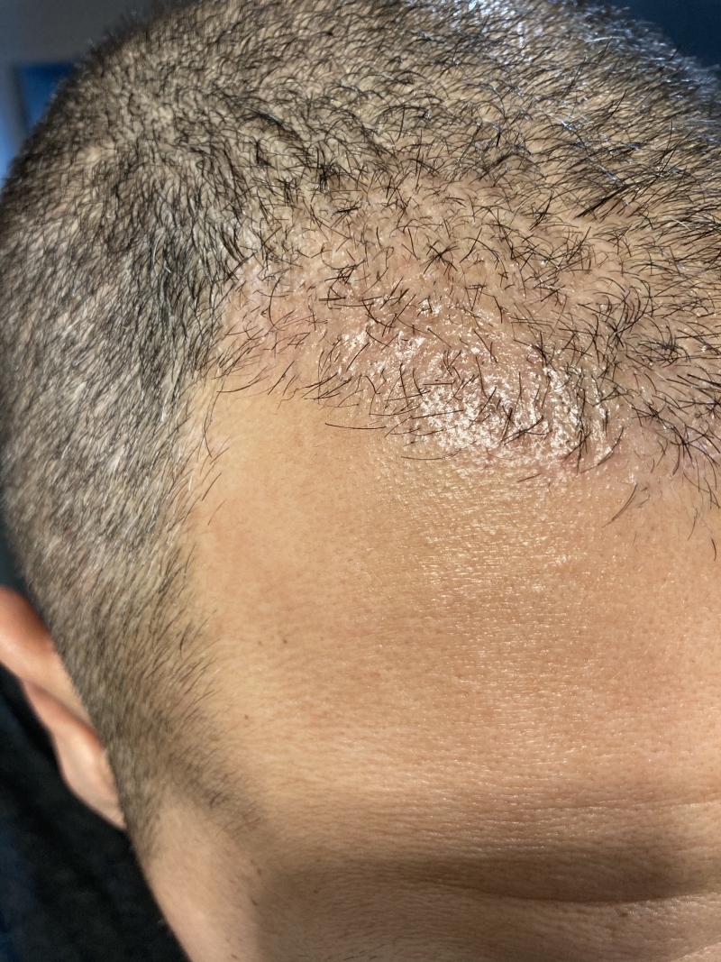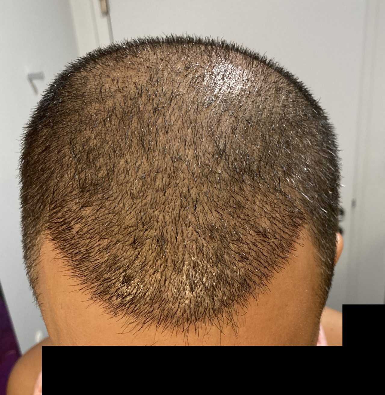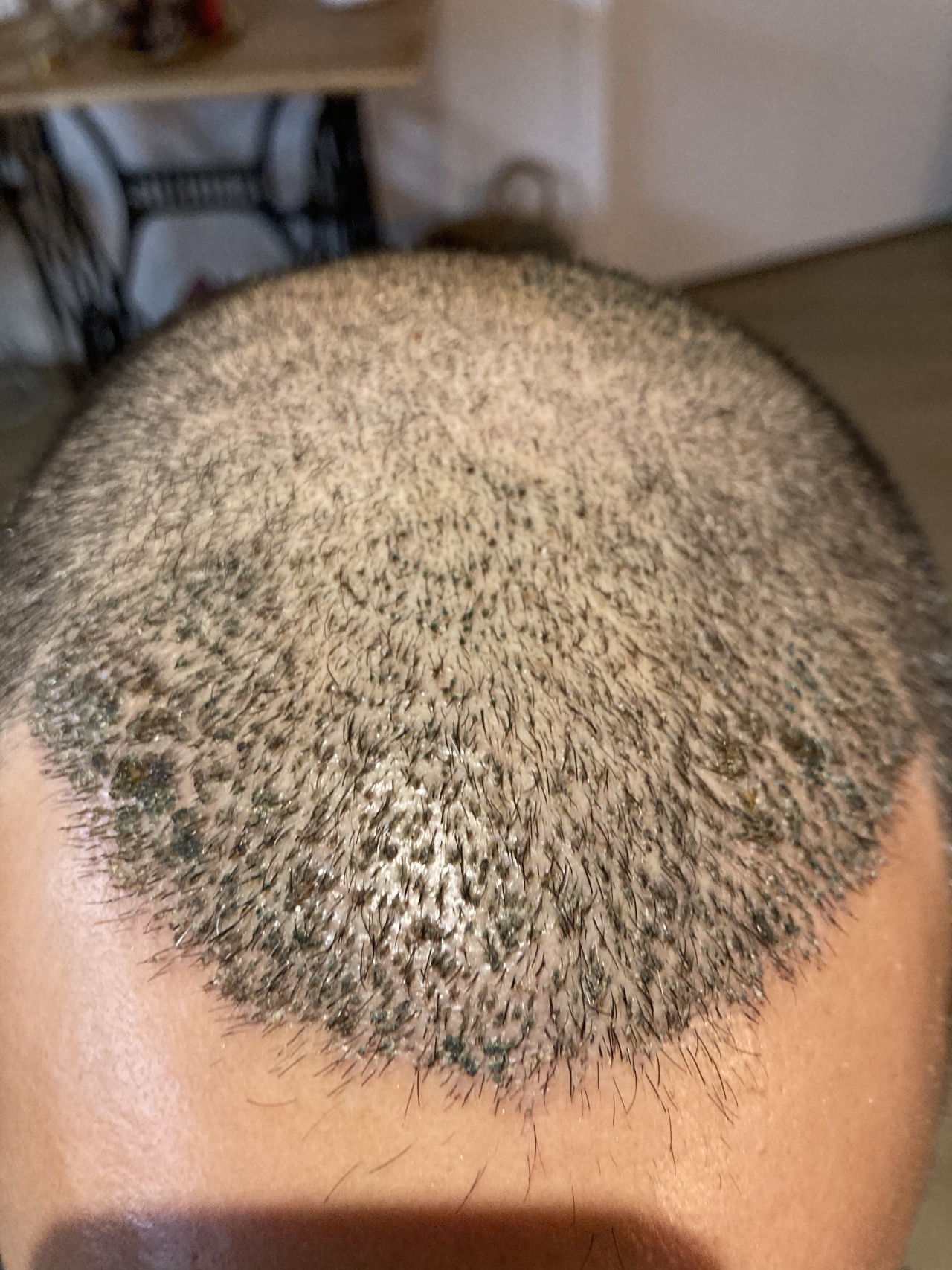 Bin jetzt 7 Wochen Post-OP und vor allem in der Tonsur ist ziemlich viel ausgefallen. Vorn auch, aber es ist auch viel stehengeblieben. Ich halte die Seiten meist auf ca. 2mm und oben ein klein wenig länger, ca. 4,5mm (so ists auch auf den Bildern).