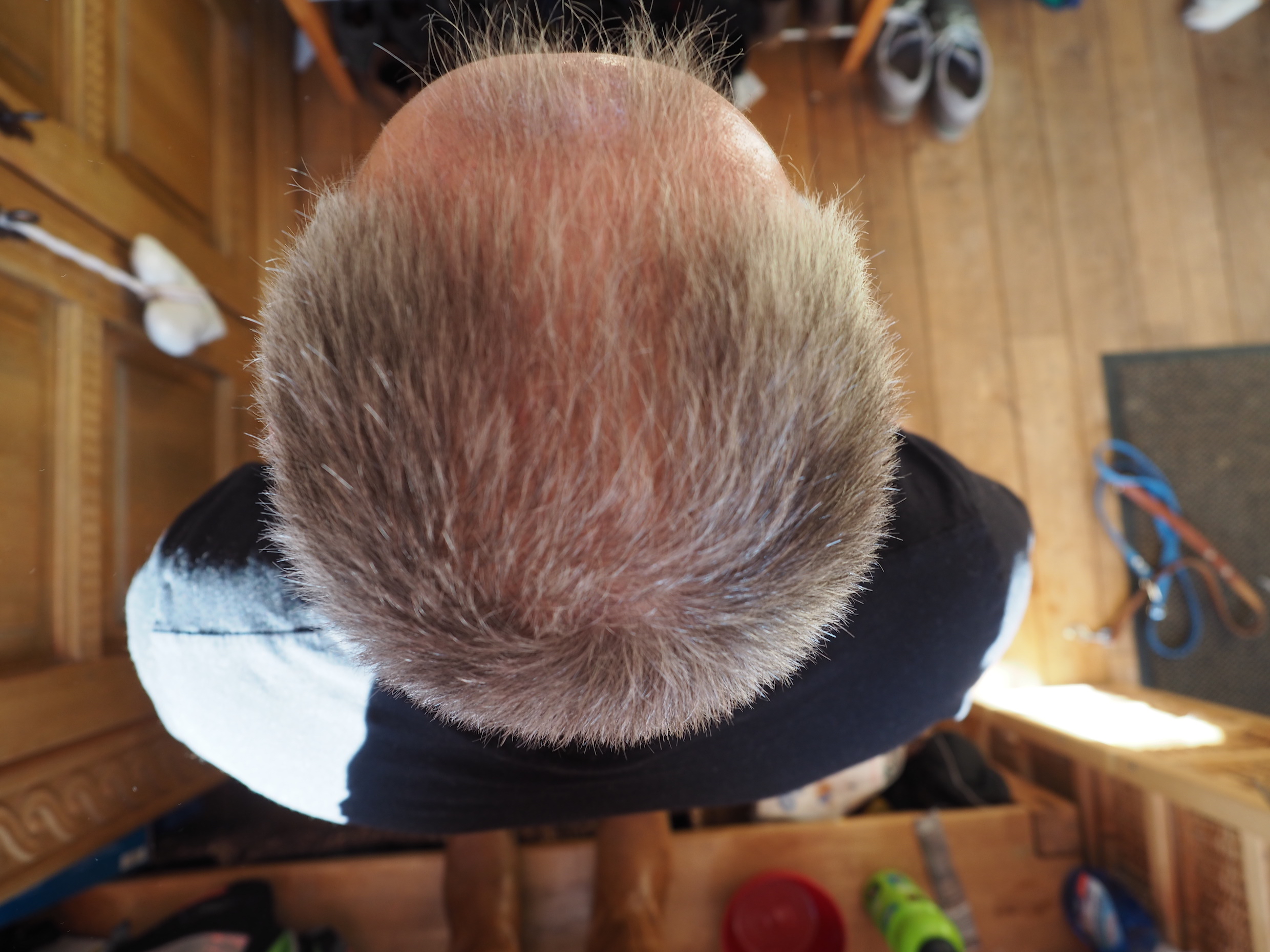 Relativ kahl war es vorher ja auch bereits, allerdings durch die Länge der noch vorhandenen Haare wurden die kahlen Stellen einigermassen verdeckt, was einem selbst die Illusion von halbwegs dichtem Haar gibt.