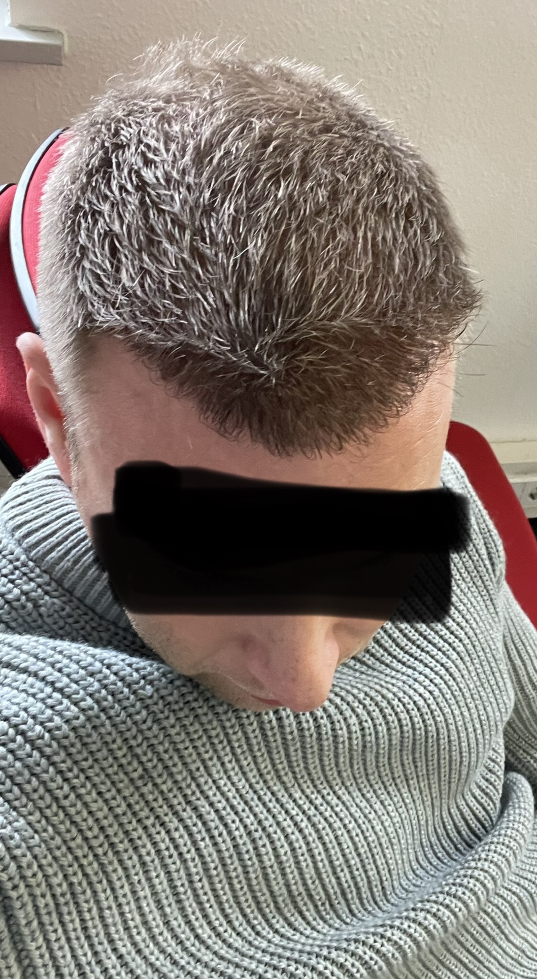 Und dir danke für dein Feedback. Und nochmals zum Spender, es kommt hier wirklich auf die Lichtverhältnisse und die Kopfhaltung an. Zudem nochmal ein beigefügtes Bild, an dem man sieht, dass die Seite auch so an einer nichtentnommenen Stelle ausschaut. Ich habe teilweise immer mal ein paar dunkle Haare dazwischen, was es ziemlich kahl wirken lässt.