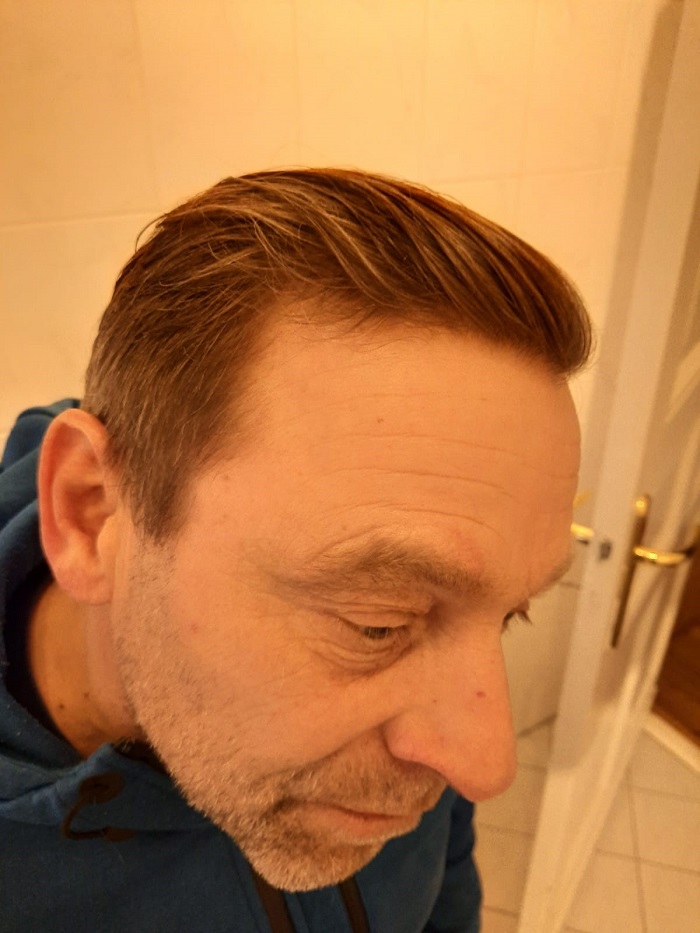 Nachher Fotos: Unscharf (man erkennt kaum Haardetails) gelbes passives Licht?, Haare trocken, mit Filter? (siehe viel weniger vorhandenen Falten in der Stirn), wahrscheinlich mit Handy geschossen