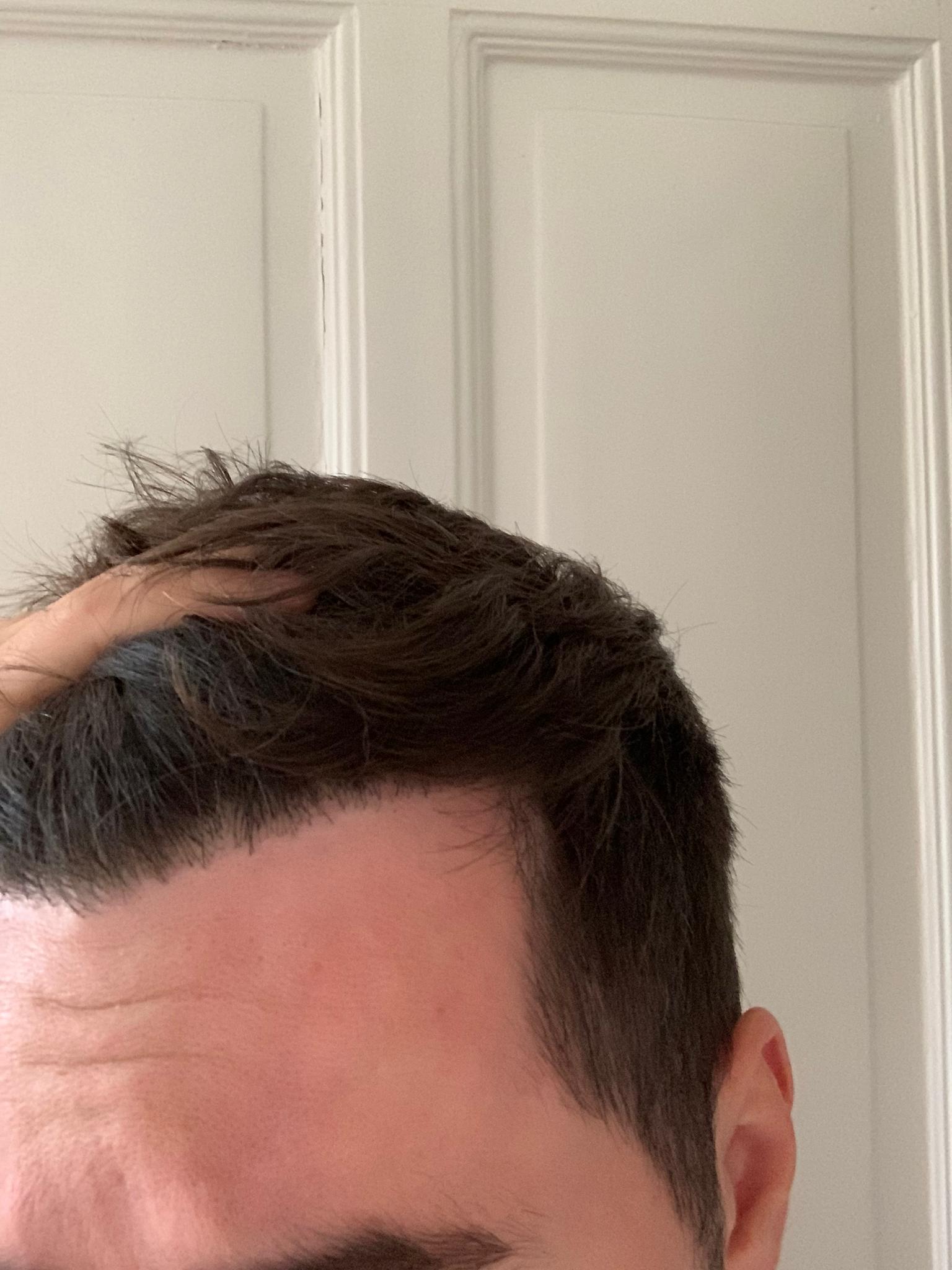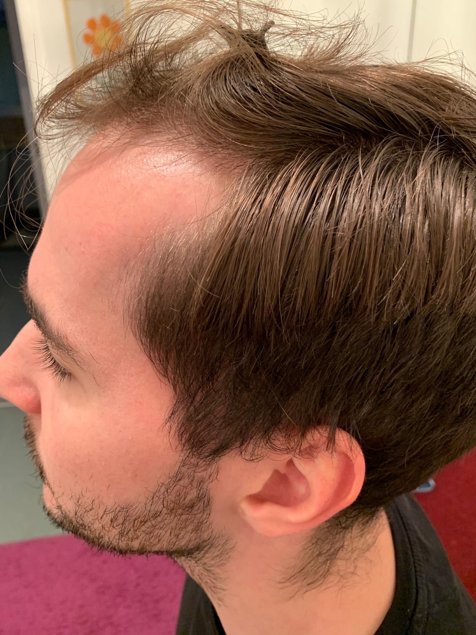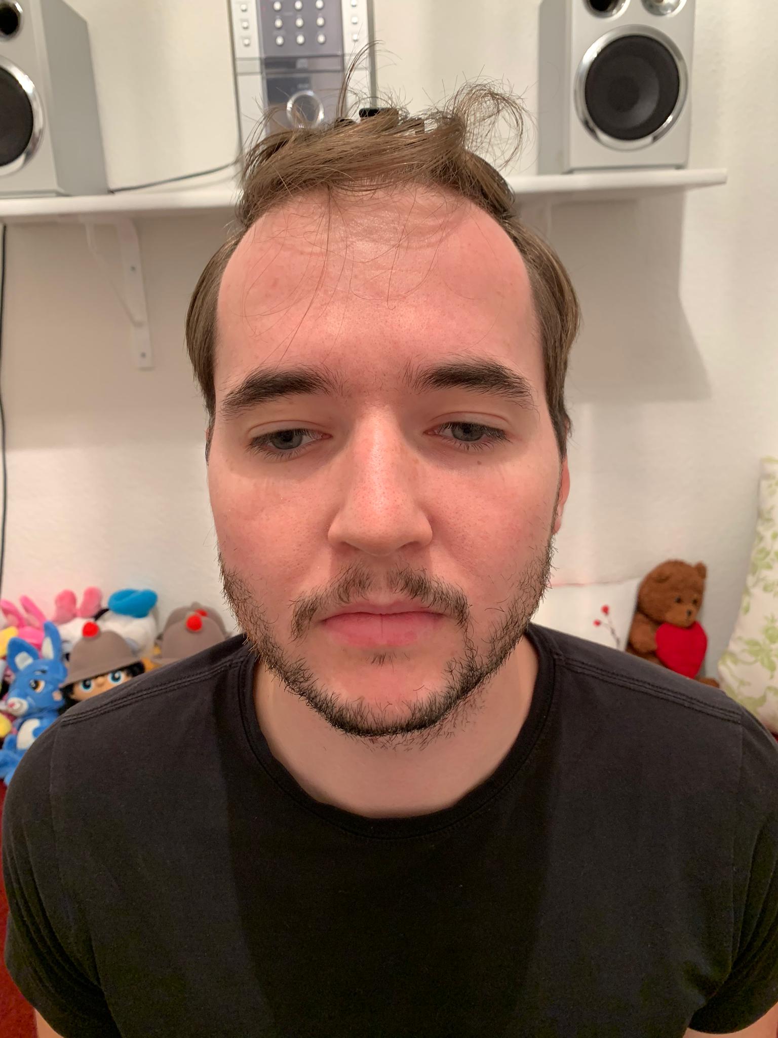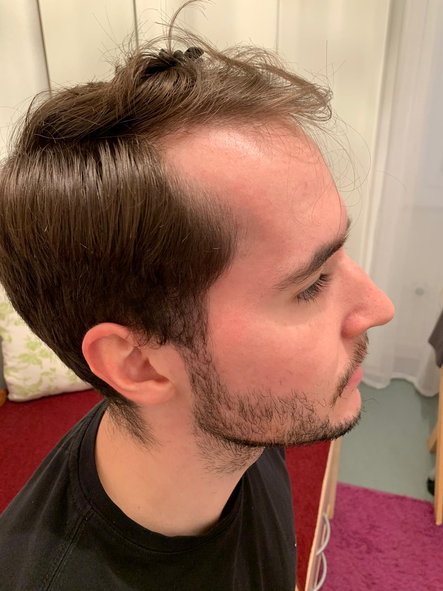 2 Monate nach der OP. In der Mitte sind die Haare schön bisschen länger. Die Geheimratsecken sind noch nicht so gekommen. Hoffe aber die werden noch kommen. Habe Pickel bekommen auf der Kopfhaut aber durch die schnelle und gute Beratung per whatsapp konnte ich die richtige Creme in der Apotheke kaufen gehen. Bin gespannt wie es im nächste Monat ausschauen wird.