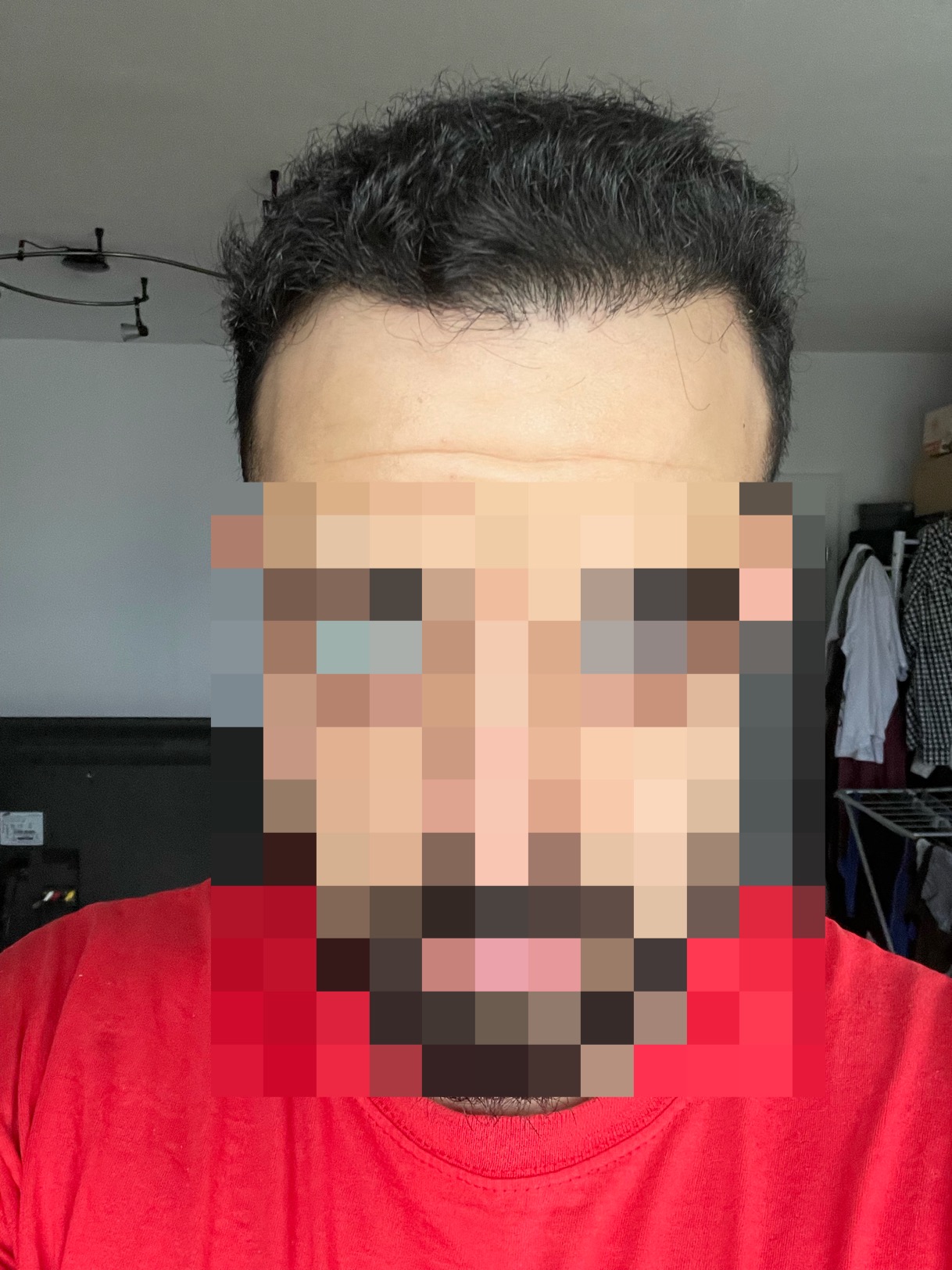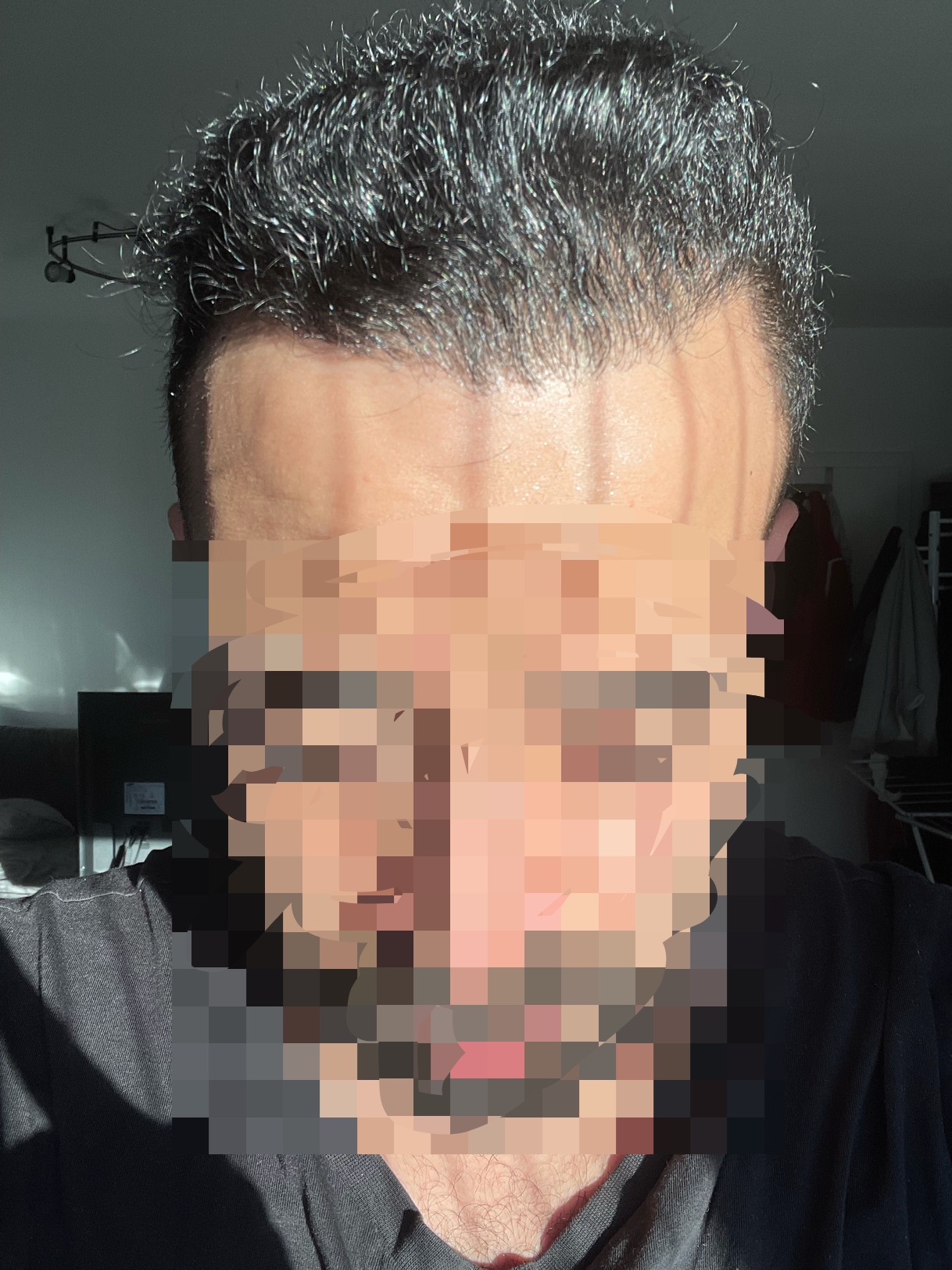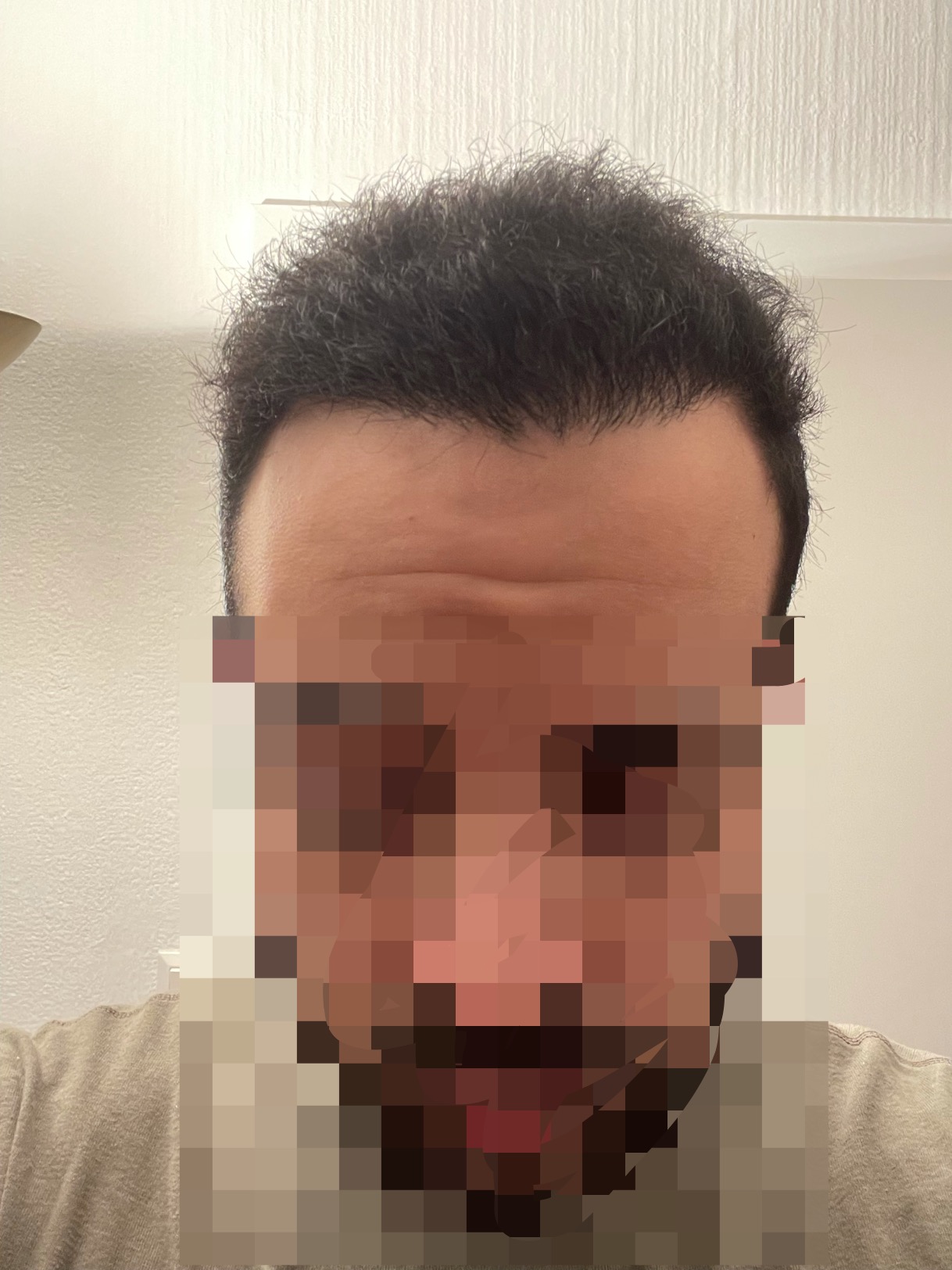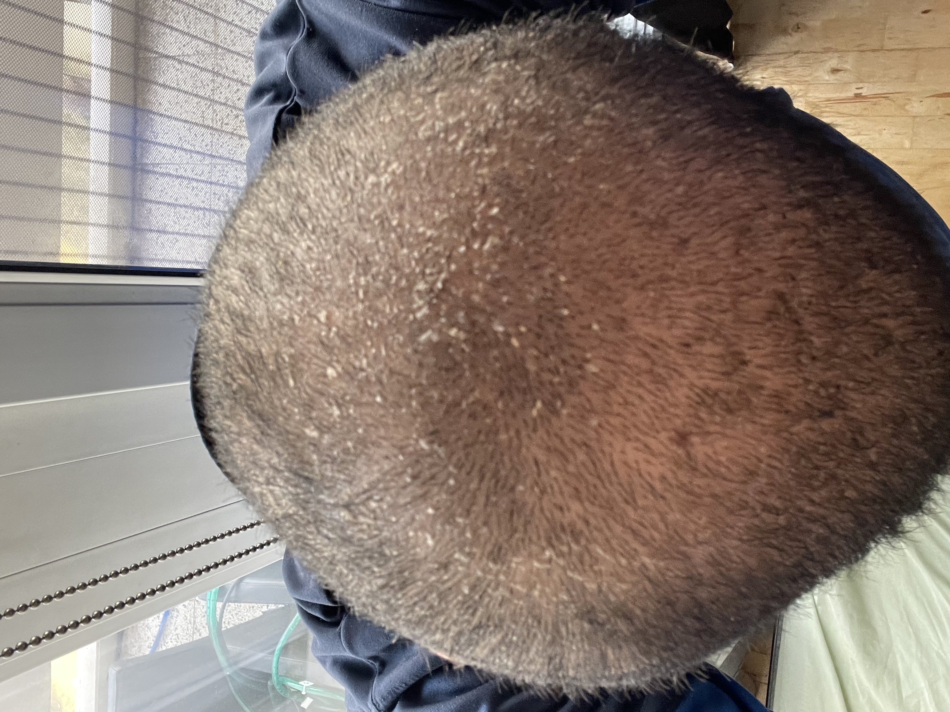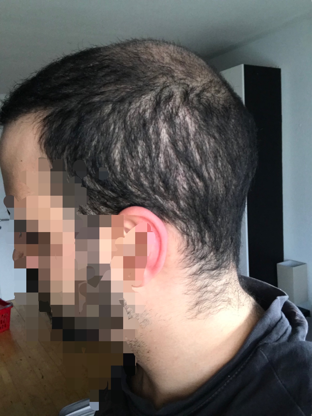 Wenn man meine jetzigen Haarstatus betrachte, merkt man zu den vorherigen Fotos den Schockhaarausfall, den sogenannten "Shock Loss". Das ist aber ganz normal. Die Haare fallen zwar aus, aber die verpflanzte Wurzel bleibt und es kommen neue Haare in den nächsten Wochen zum Vorschein. Also ist Geduld gefragt. Die Klinik empfiehlt 18 Tage nach Op mit unterstützenden Produkten anzufangen. Ich verwende morgens Minoxidil und eine Priorin Tablette und abends das von der Klinik zur Verfügung gestellte Haarserum mit einer Priorin Tablette. Ich verwende auch das Shampoo von der Klinik.