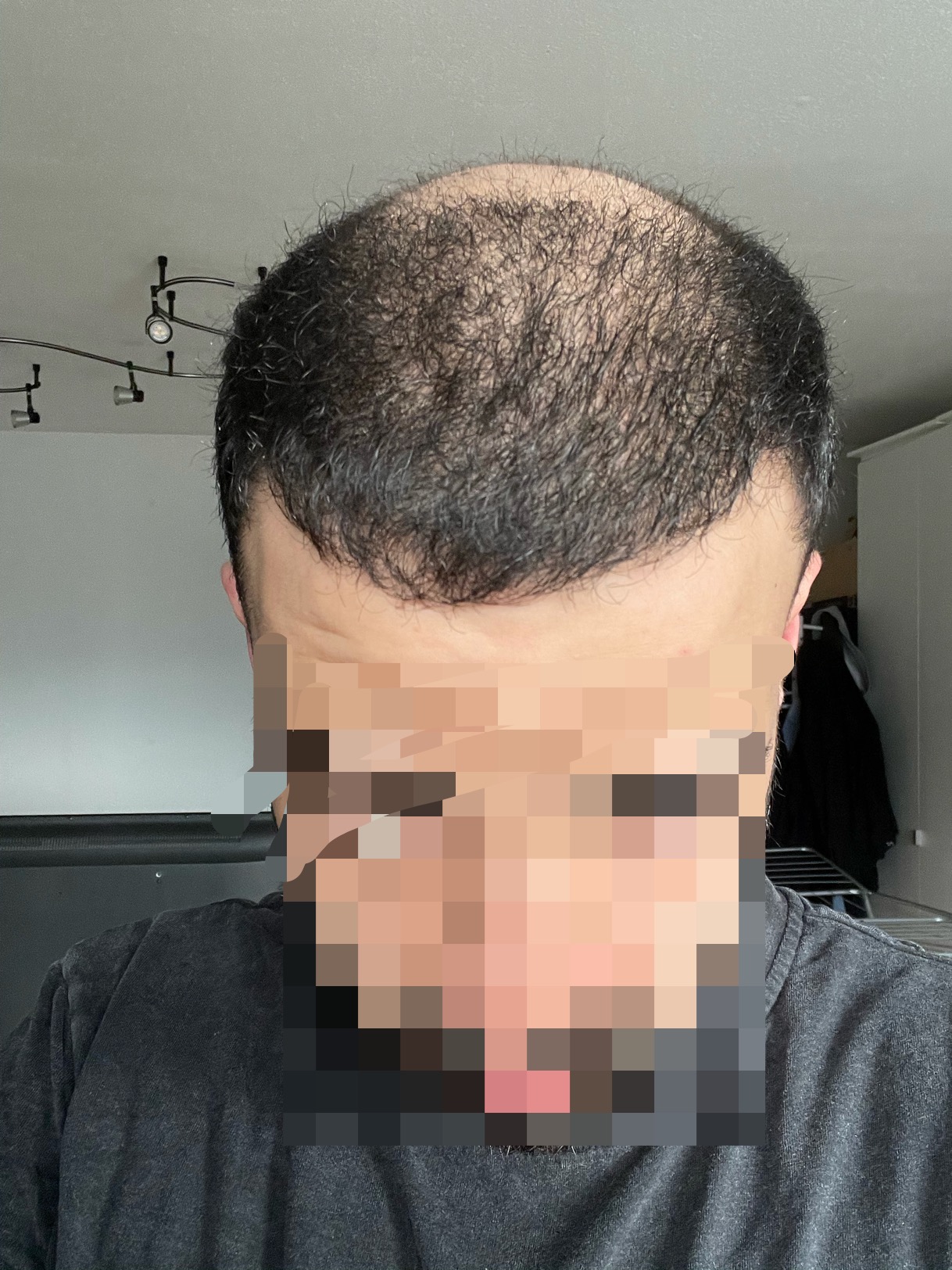 Man sieht die Haare werden in der mittleren transplantierten Fläche dichter und hinten kommen mehr und mehr Einzelhaare raus.