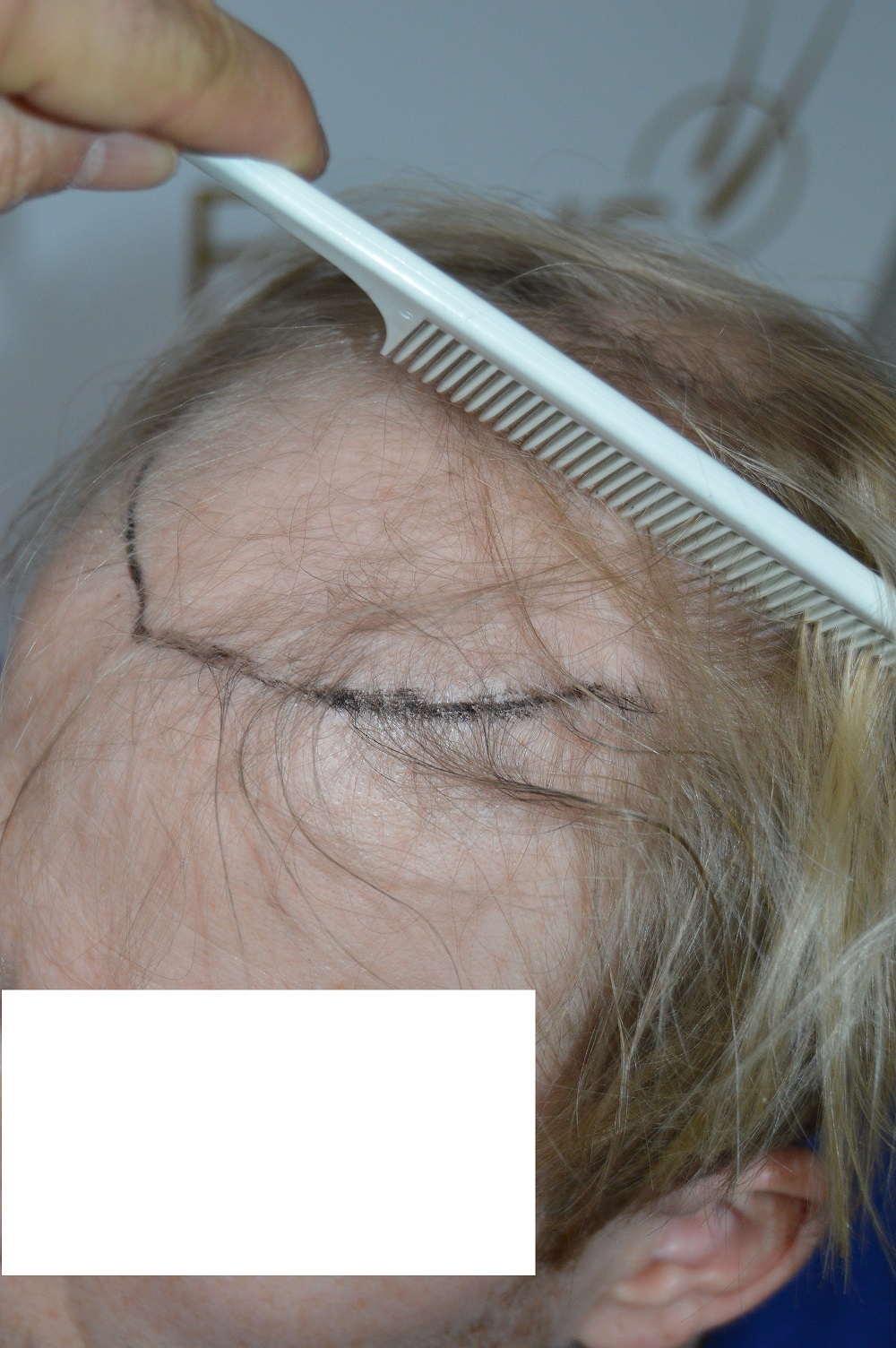 Genau, für den gesamten Bereich waren ca. 4.500 Grafts nötig, deswegen wurde die OP auf 2 Jahre aufgeteilt und im ersten Schritt nur die Haarlinie neu erstellt. Geplant waren 1.800 Grafts, der Doktor hat sich allerdings verzählt und 2.000 Schlitze gemacht und ohne Aufpreis auch gefüllt.