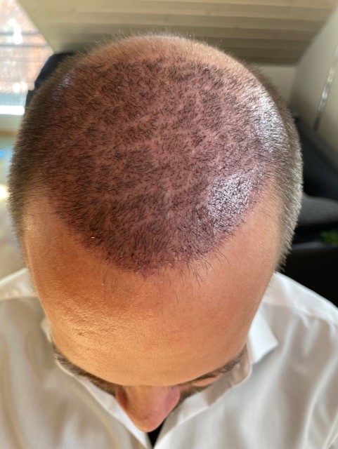 Ich bin bereits jetzt mit dem Ergebnis zufrieden und schätze, dass mit der Kruste und bei den Haarwäschen rund 60%-70% der transplantierten Haare bereits ausgefallen sind.