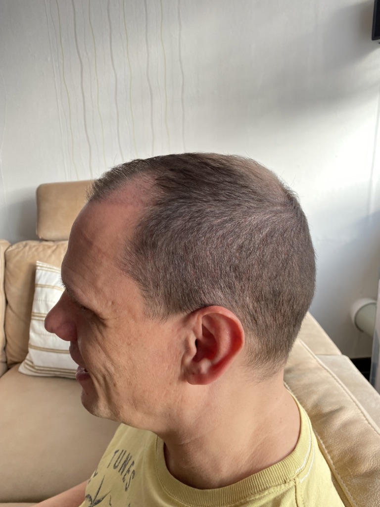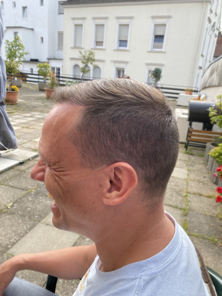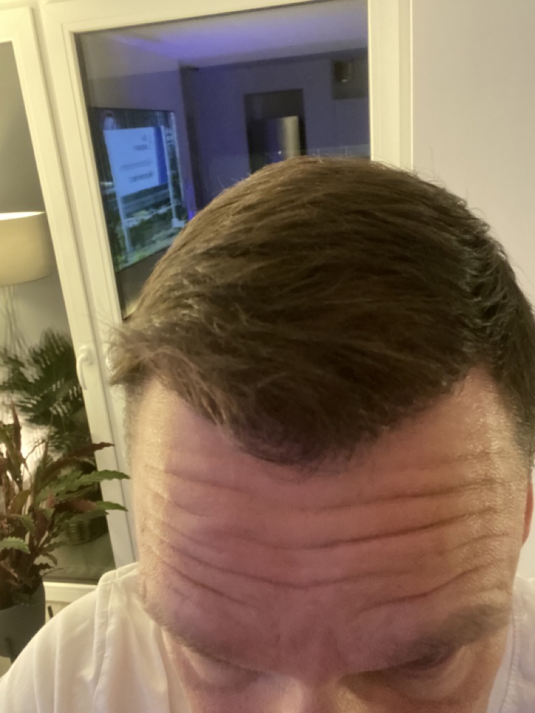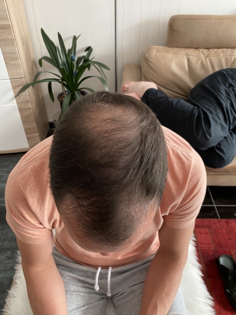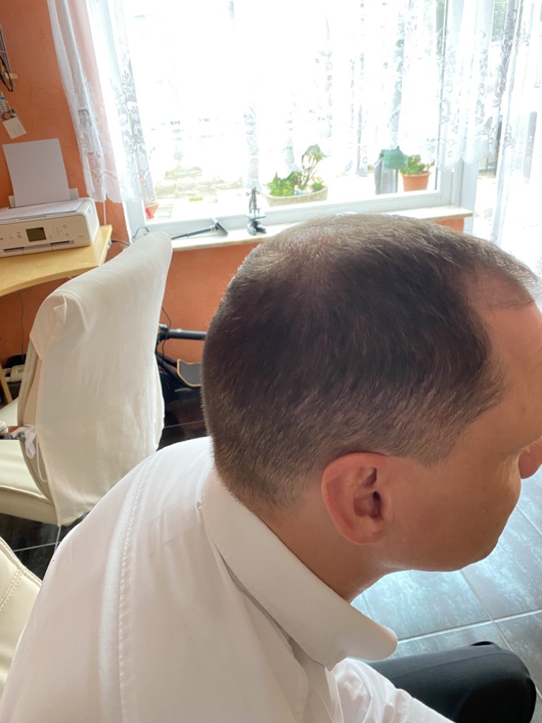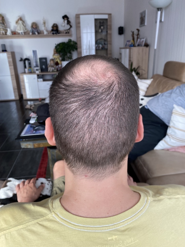 Jetzt sind 2 Monate vergangen und es fängt an zu wachsen auch wenn ich vorne noch Löcher habe. Ich habe gelesen, das es aber nach 3 Monaten erst richtig wachsen wird. Vorne sieht es schon besser aus als auf dem Haarkranz