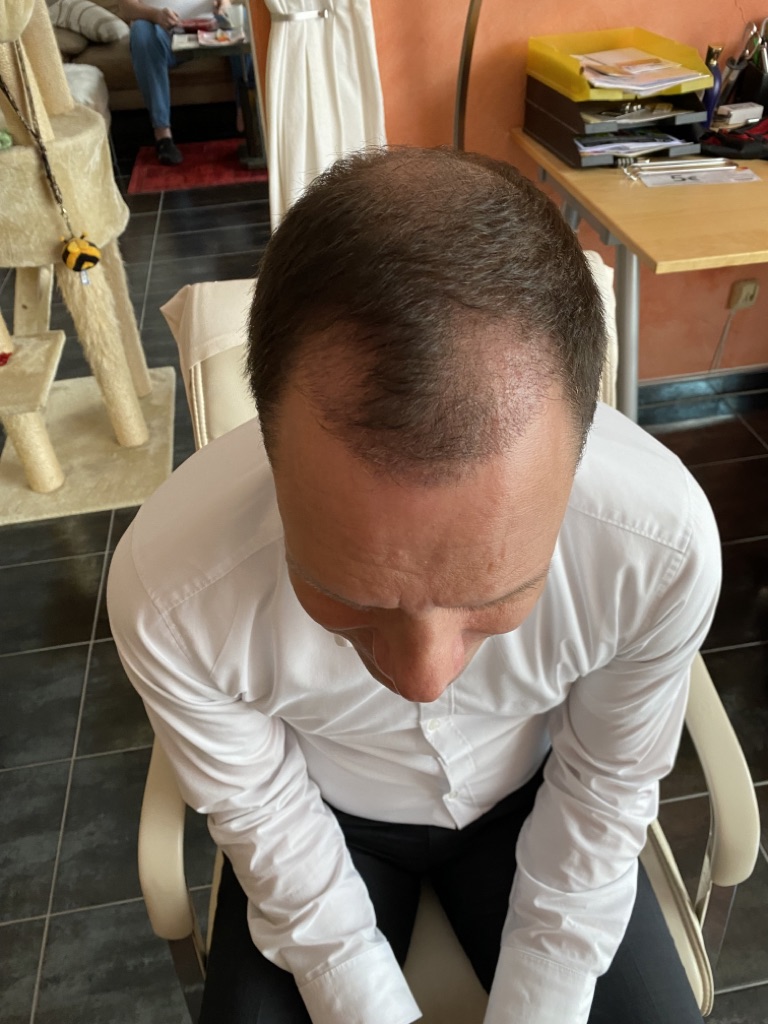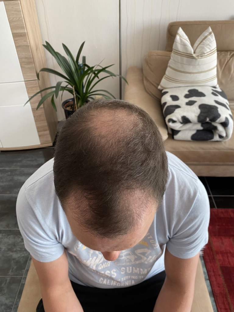 Jetzt sind 2 Monate vergangen und es fängt an zu wachsen auch wenn ich vorne noch Löcher habe. Ich habe gelesen, das es aber nach 3 Monaten erst richtig wachsen wird. Vorne sieht es schon besser aus als auf dem Haarkranz