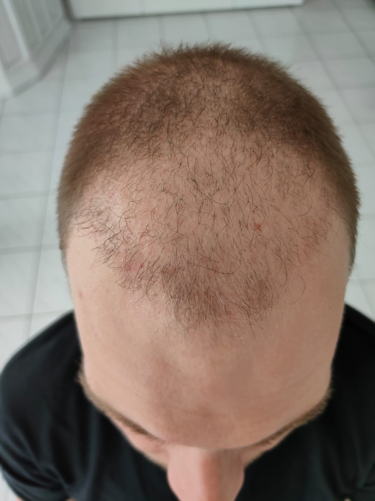 Ich bin 28 Jahre alt und habe seit ca. 8 Jahren starken Haarausfall, wie man gut sehen kann. Ich verwende 5% Regaine seit ca. 7 Jahren, anfangs 2 x täglich seit ein paar Jahren 1x täglich. Die Front ist bis auf einen kleinen Büschel ganz vorne praktisch komplett leer, an der Tonsur hat es in den letzten 1-2 Jahren auch angefangen.