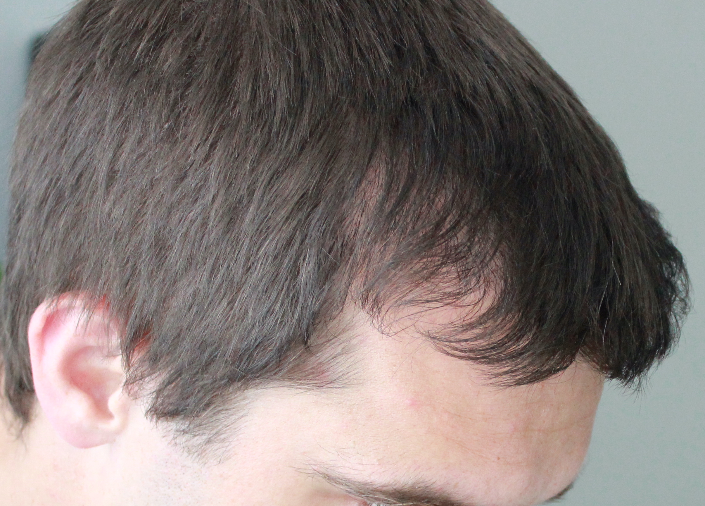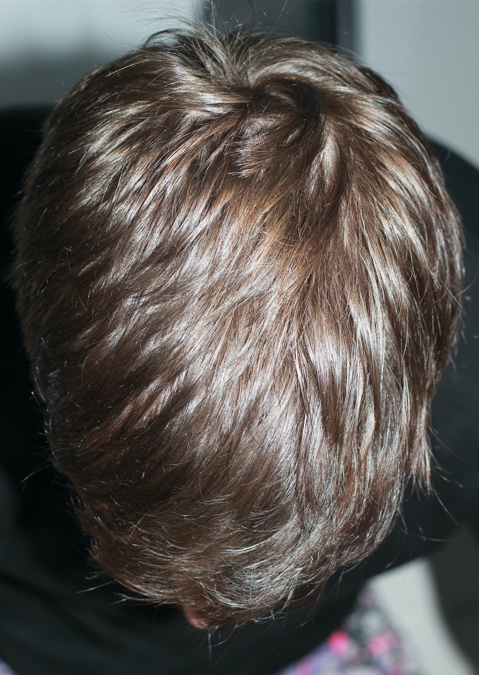 Die letzten zwei Fotos sind vielleicht weniger aussagekräftig, da die Haare verglichen mit den Vorherfotos viel länger sind, und somit die etwas lichteren Stellen sehr gut kaschieren.