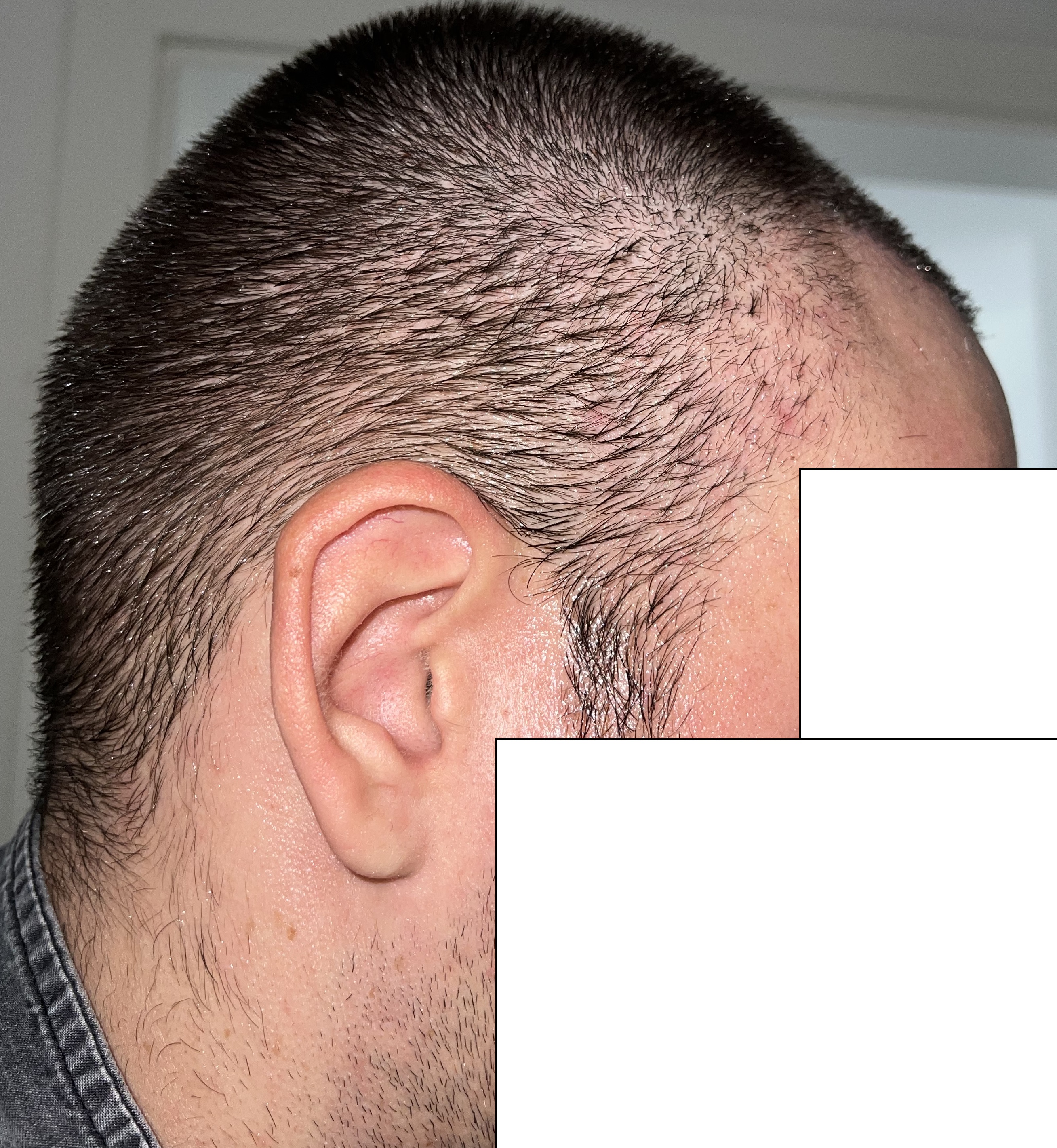 Die Haare wachsen weiter. Seit 2 Wochen ist nicht mehr der extreme Fortschritt zu sehen. Liegt wahrscheinlich daran, dass der Unterschied nicht mehr so extrem ist. Von der Form her bin ich sehr zufrieden. Leider fehlt bisher noch die dichte. Besonders wenn man von oben auf den transplantierten Bereich schaut sind noch kahle stellen zu sehen. Ich hoffe das sich da noch was tut. Was denkt ihr? Kann ich mit mehr dichte rechnen?