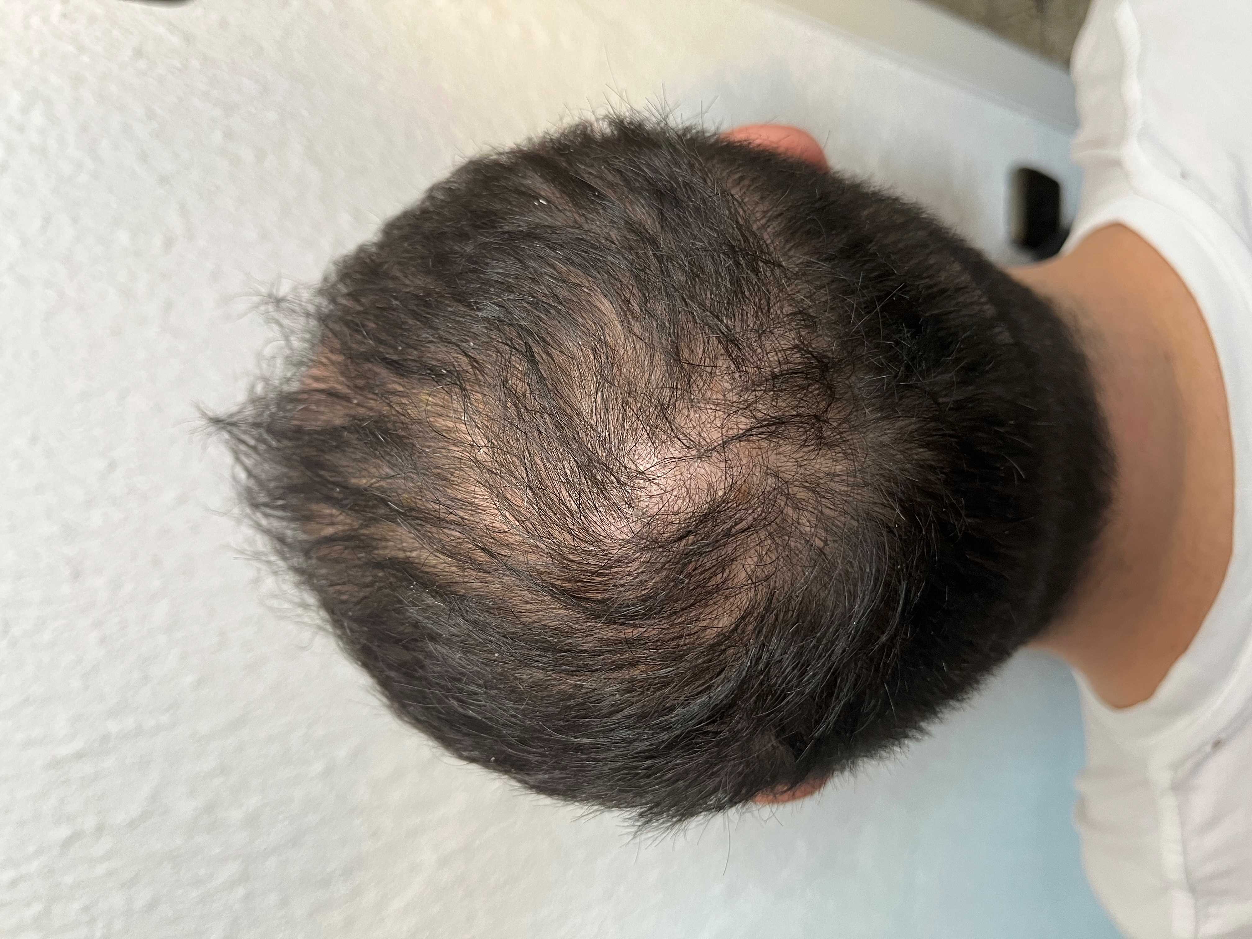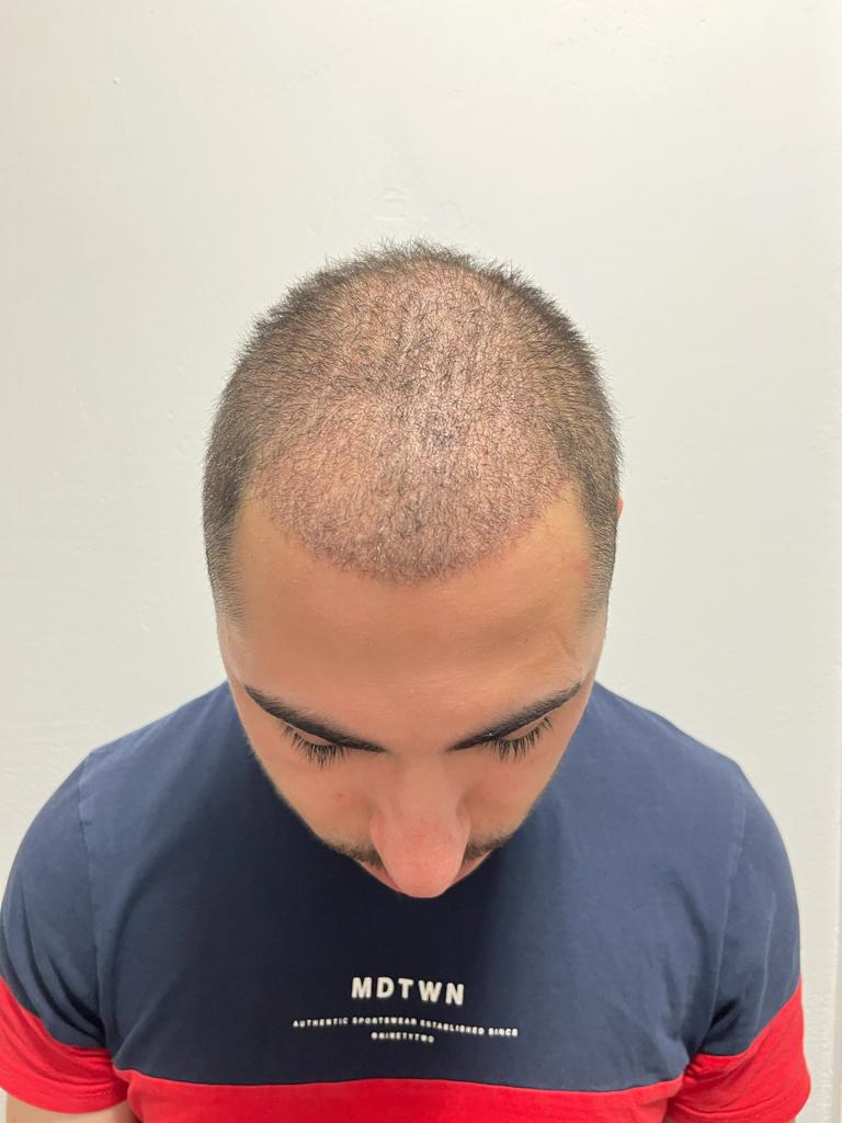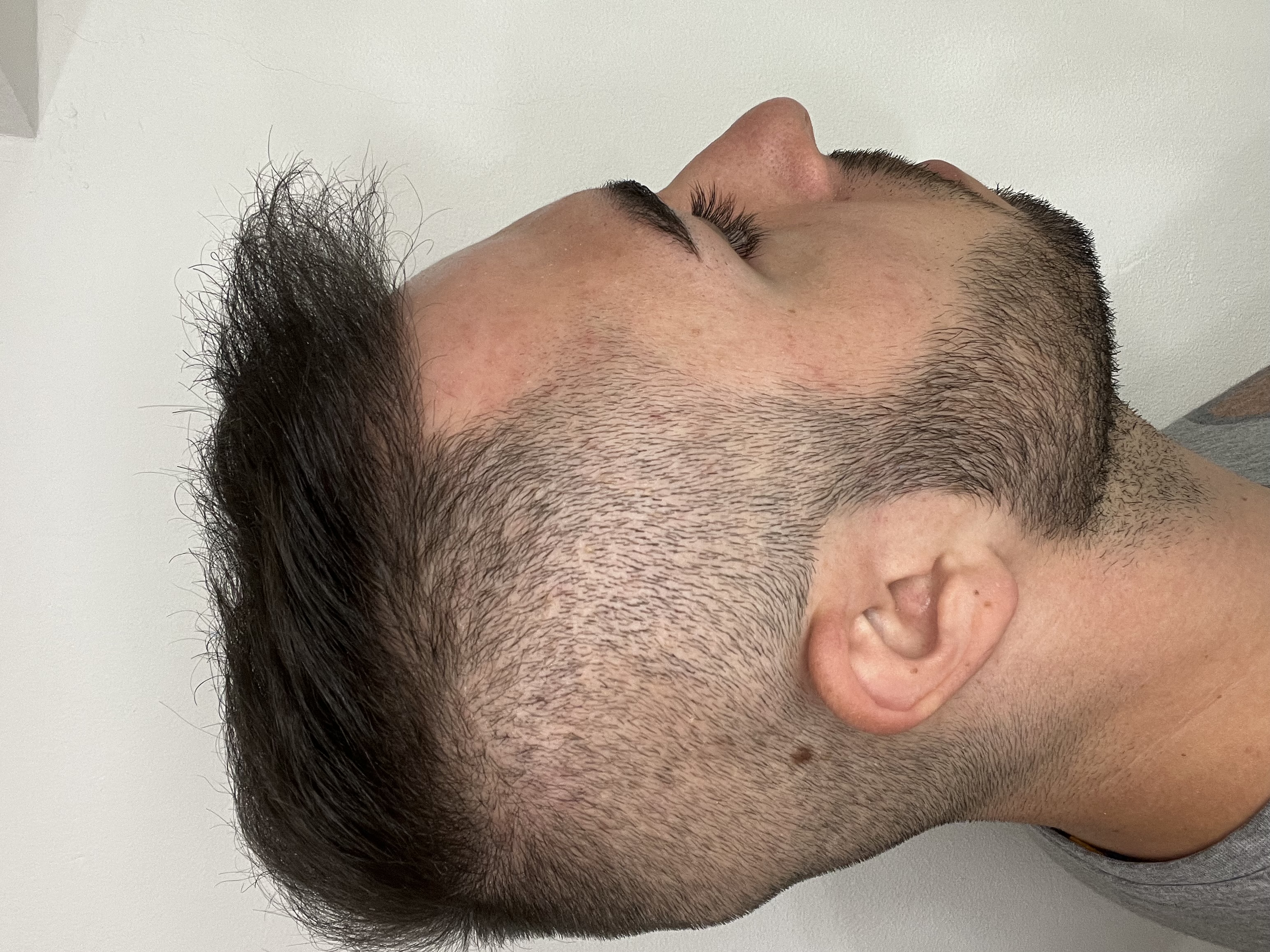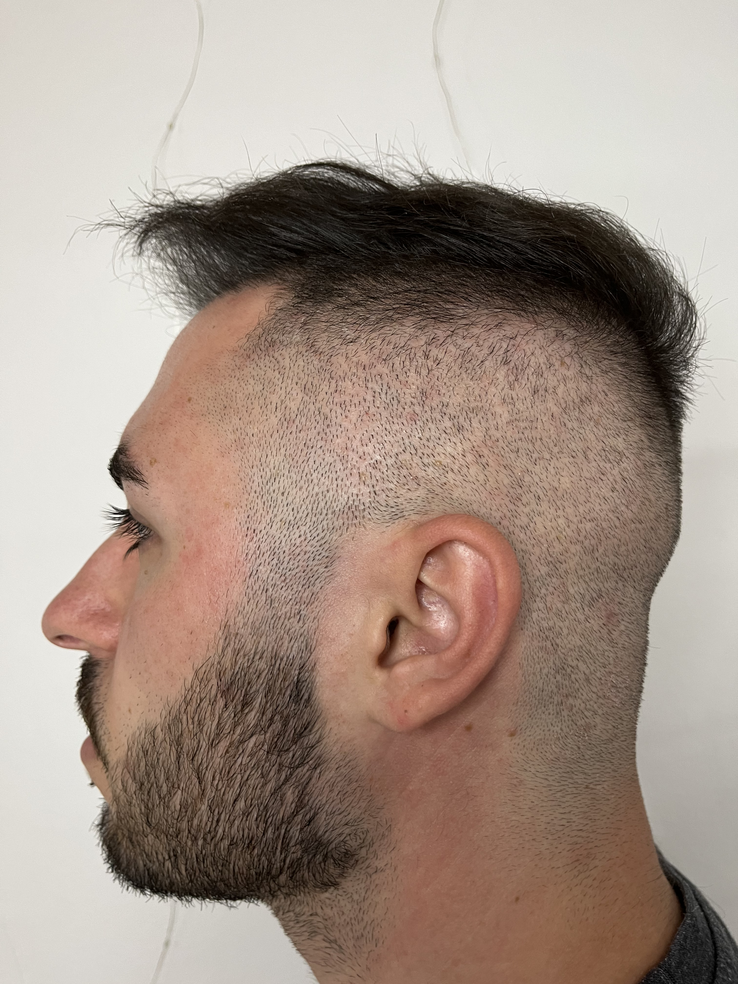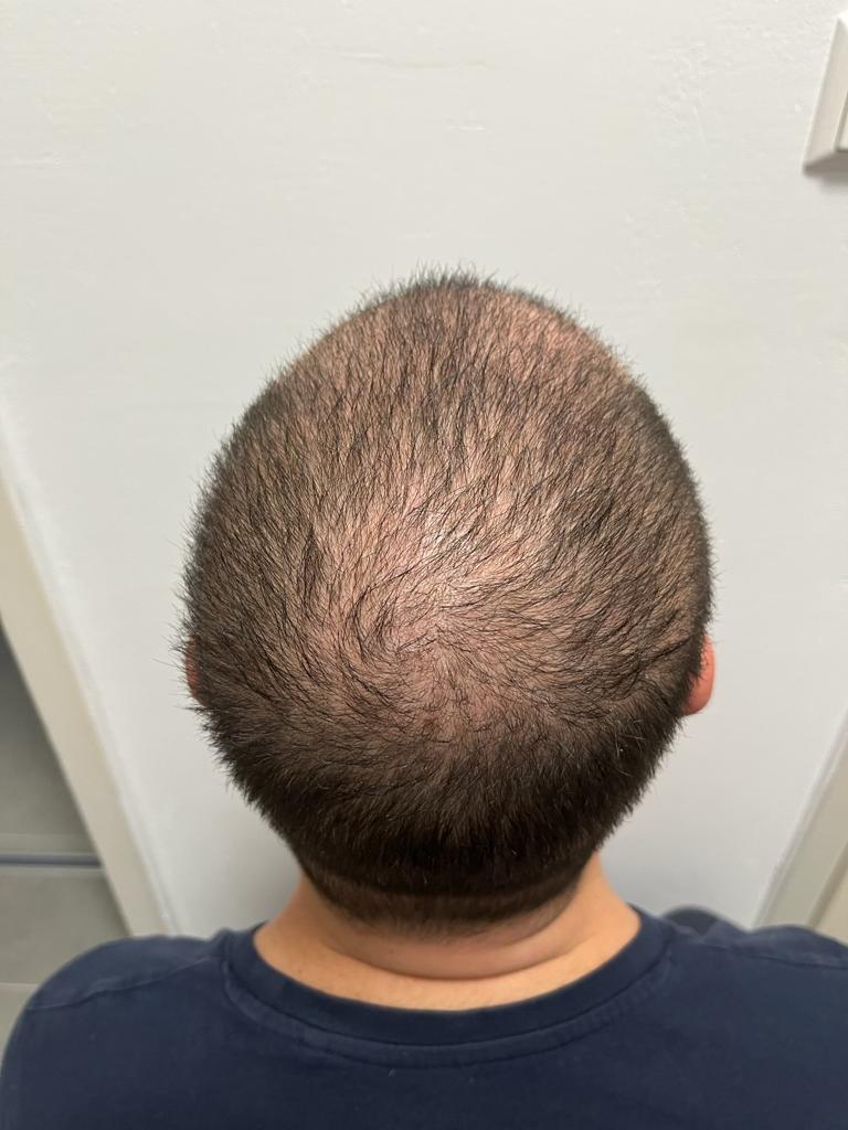 Mittlerweile sieht man gar nicht mehr, dass eine Haartransplantation durchgeführt wurde und die Haare werden zwar auch immer Dichter, aber sehr viel hat sich da zum Vormonat jedoch nicht getan.