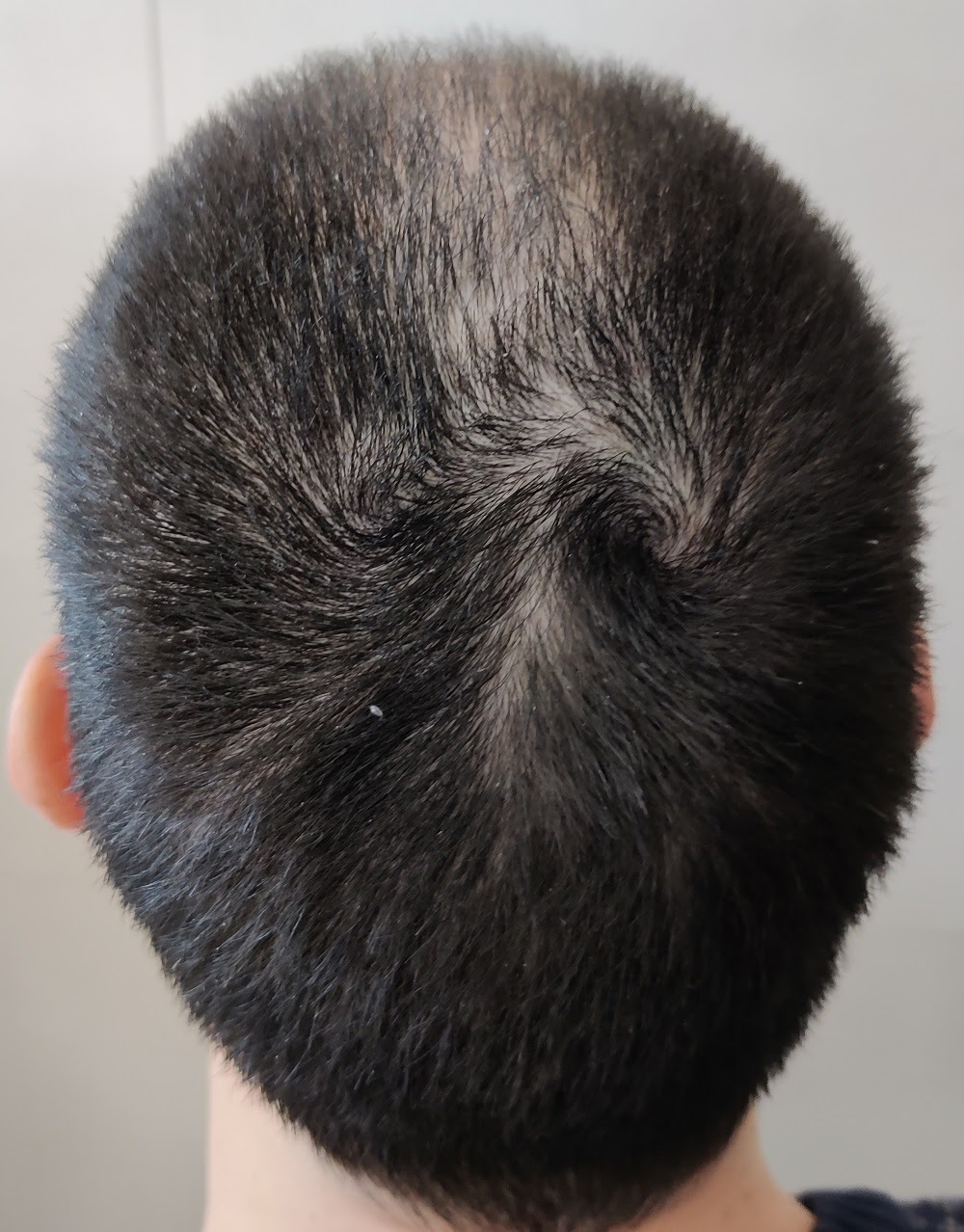 Leider bin ich etwas enttäuscht vom aktuellen Status. Ich dachte die Haare wären zu diesem Zeitpunkt schon etwas dichter. Man sieht je nach Bild: Es hängt extrem von der Lichtsituation ab wie dicht es aussieht. Bei tageslicht oder unter einer Lampe sieht es leider noch sehr Licht aus.