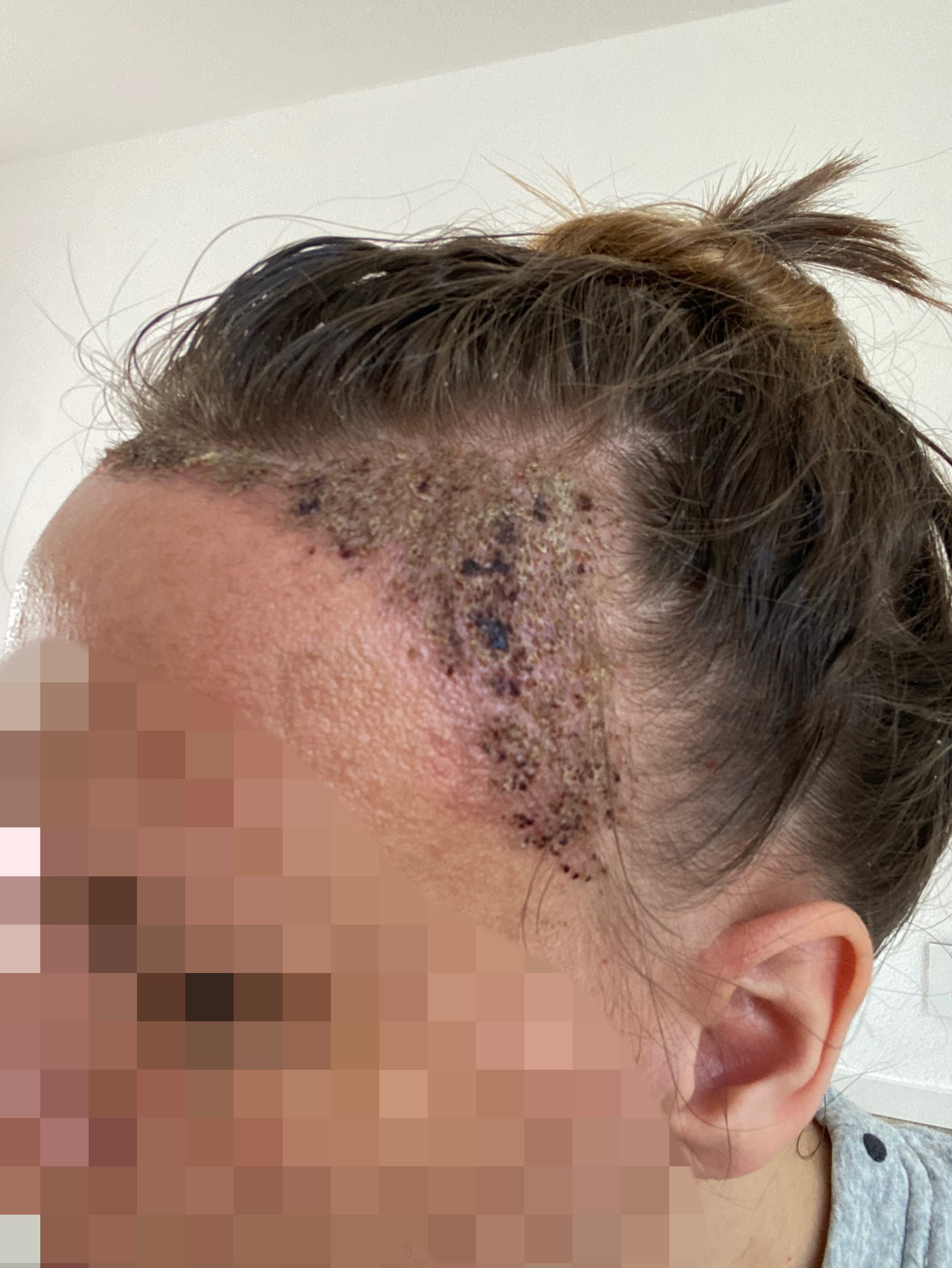 Der Schorf im Empfangsbereich ist komplett verschwunden, die Kopfhaut noch leicht gerötet und ich habe den Eindruck, dass bei der Haarwäsche heute morgen leider schon ein paar Haare ausgefallen sind. Ich hoffe, es bleibt mir so viel wie möglich erhalten.