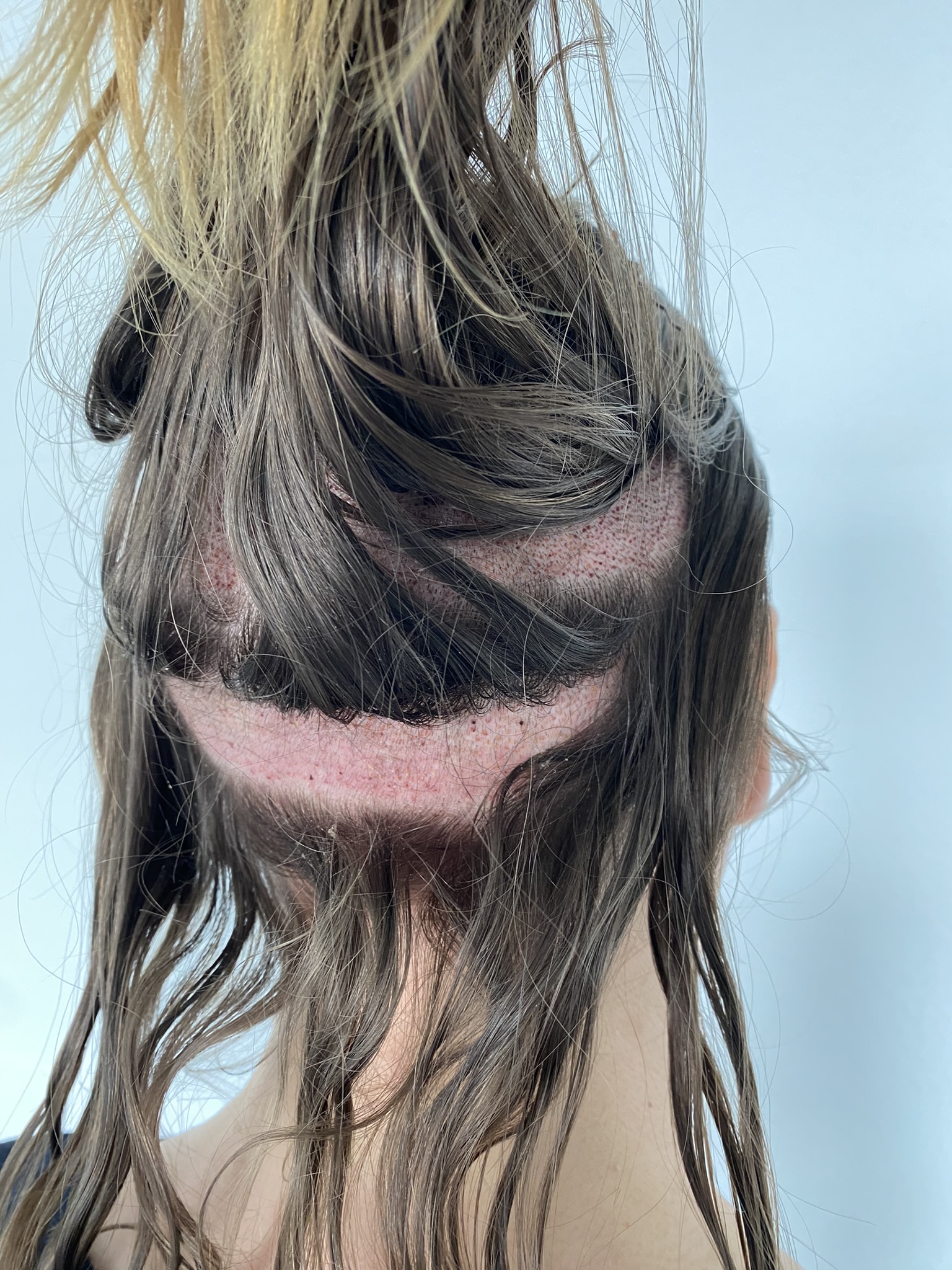 Im ersten Teil der OP wurden meine Stirn vorbereitet. Dr. Feriduni hat über 2.000 kleine Schlitze gesetzt, in die nachher die FU‘s gesetzt wurden. Um dies besser sichtbar zu machen, wurden diese blau eingefärbt (siehe Foto). Danach wurden Teile meines Hinterkopfes rasiert und die Entnahme fand statt. Ich war dabei so entspannt, dass ich sogar zwischendurch geschlafen habe.