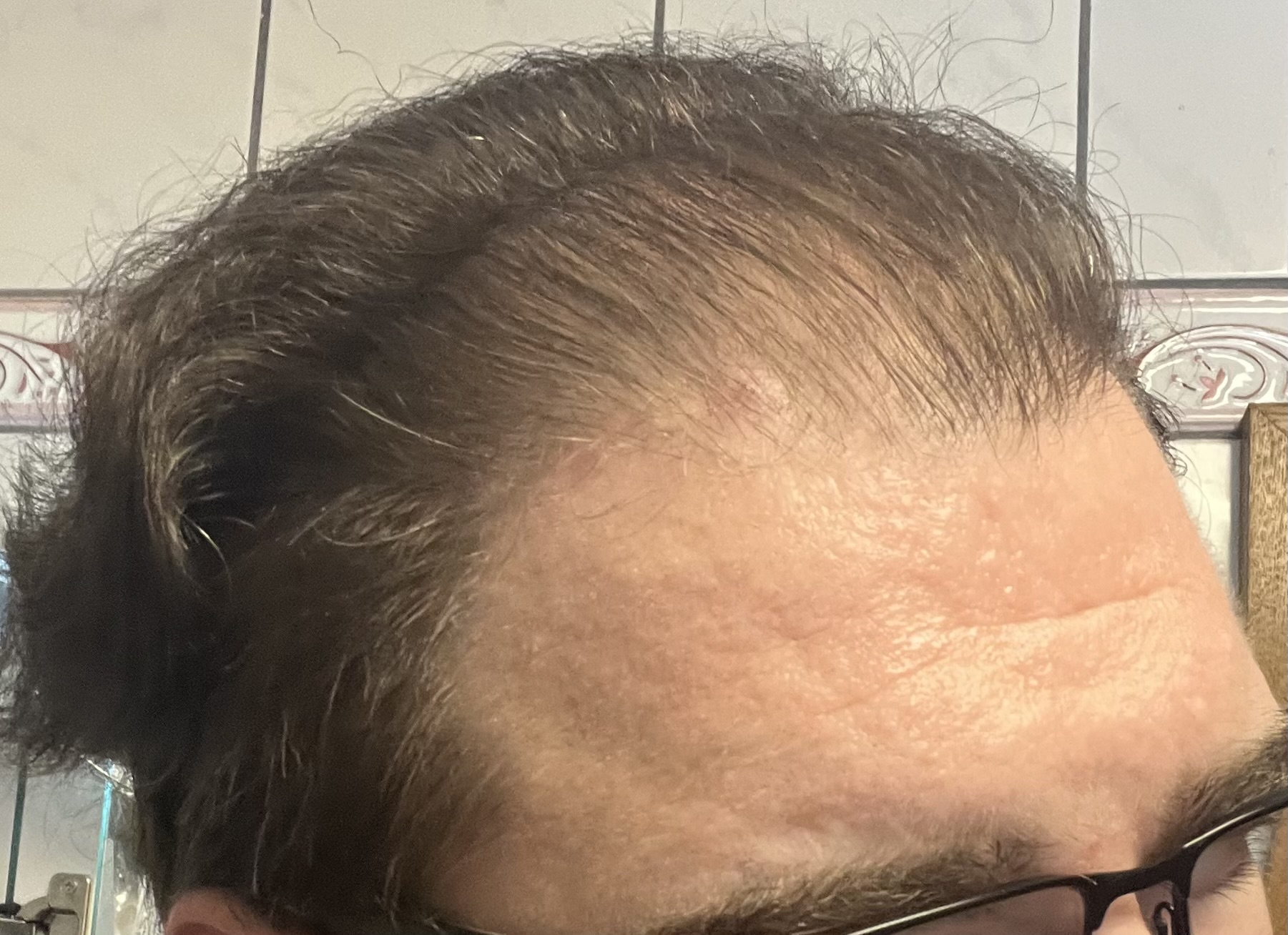 Mein Haarausfall ist vor allem im vorderen Bereich ziemlich stark, dünne diffus aus, das bedeutet das die Haarlinie noch nicht stark zurückgewichen ist ist und die GHE nicht sehr groß (NW2), aber direkt hinter der Haarlinie leider die Haare stark ausfallen und dort auch nicht nachwachsen. Eine Tonsur oder kahle Stellen habe ich nicht.