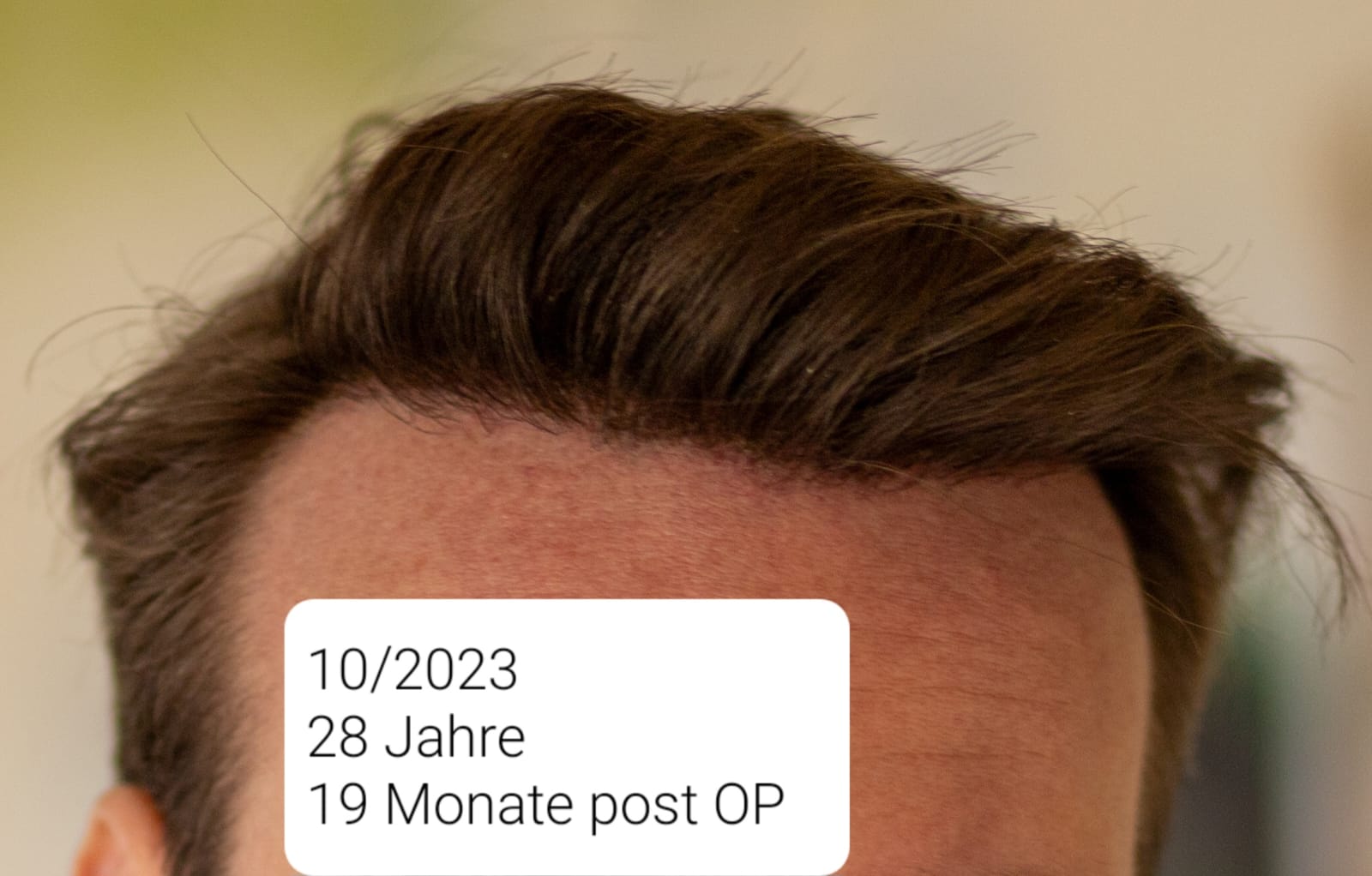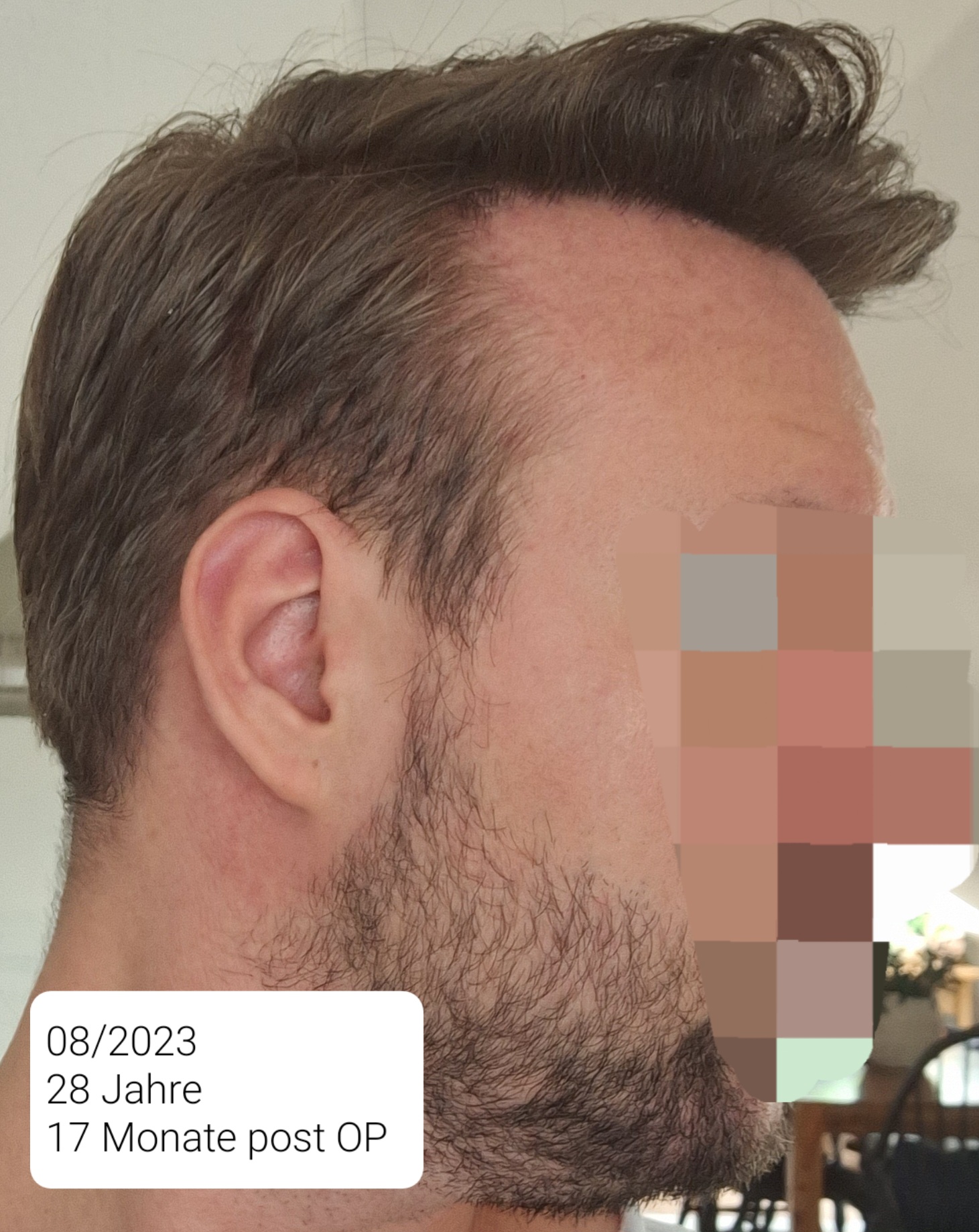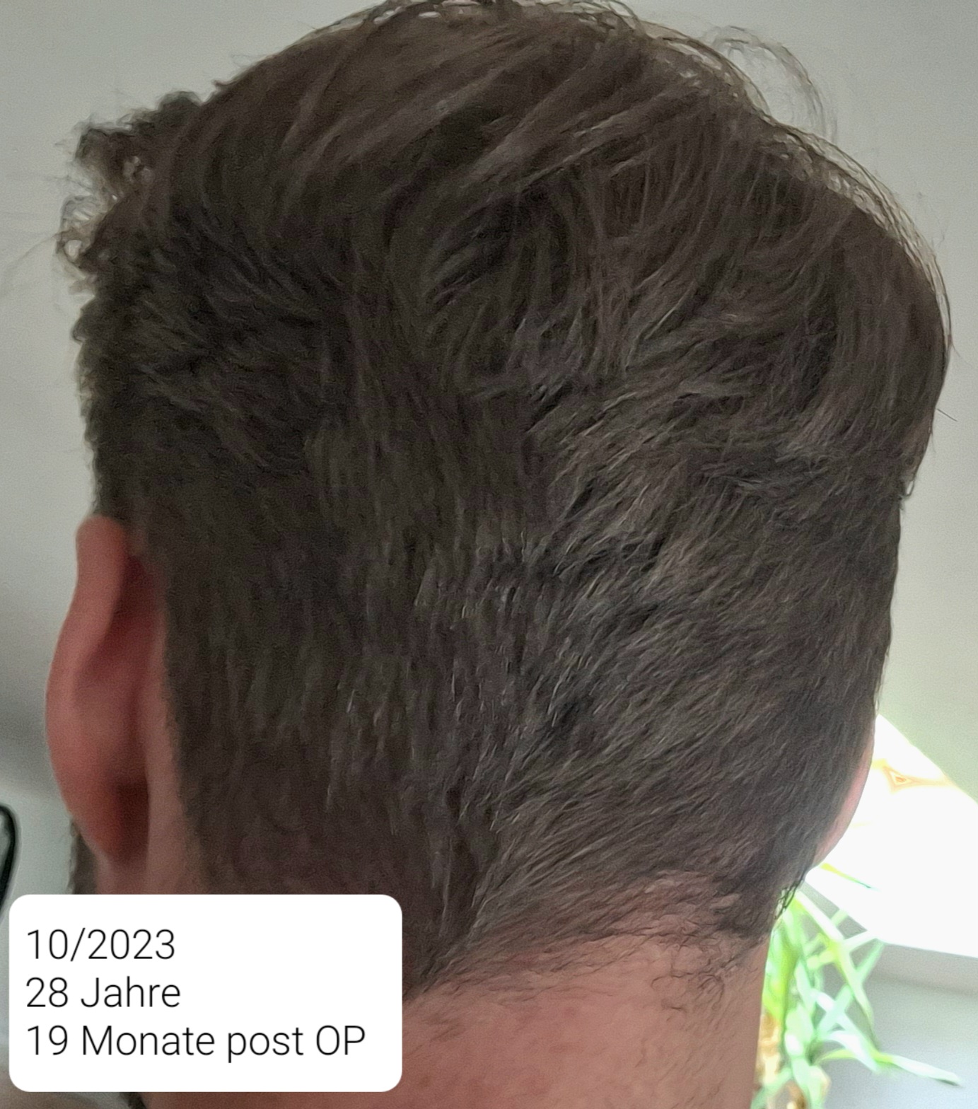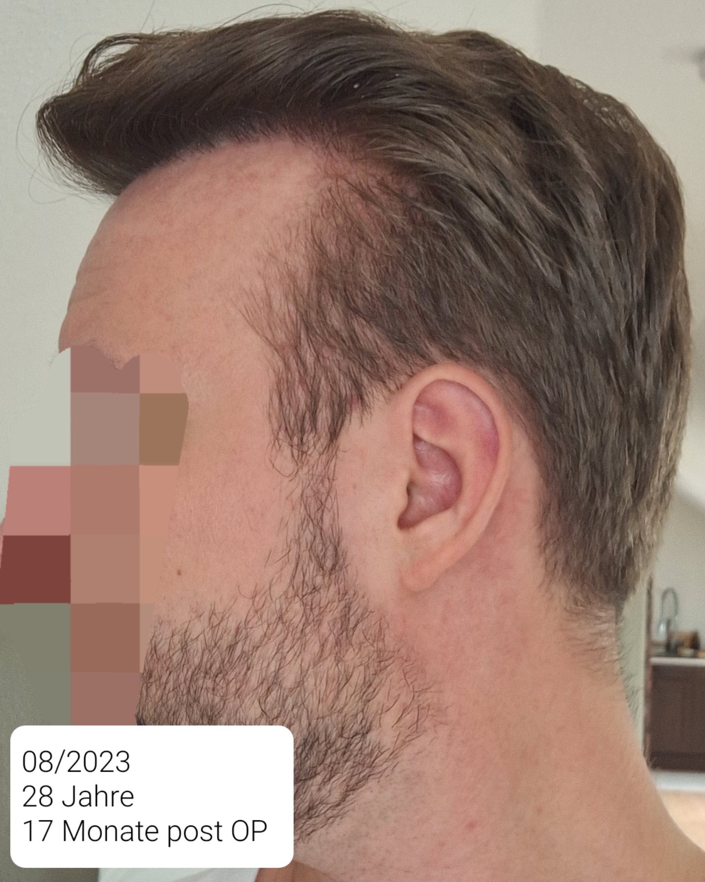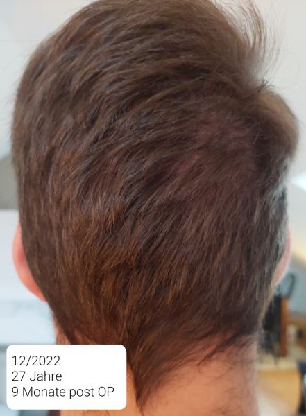 Das beim 9. Monat wie eine kahle Stelle aussieht ist ein Wirbel. Im 18. sieht man den Spender bei direkter Sonneneinstrahlung. Da ich eine steile Haarwuchsrichtung habe, empfiehlt mir meine Friseurin (auch schon vor der HT), die Seiten nicht zu kurz zu tragen und schneidet sie immer mit der Schere.