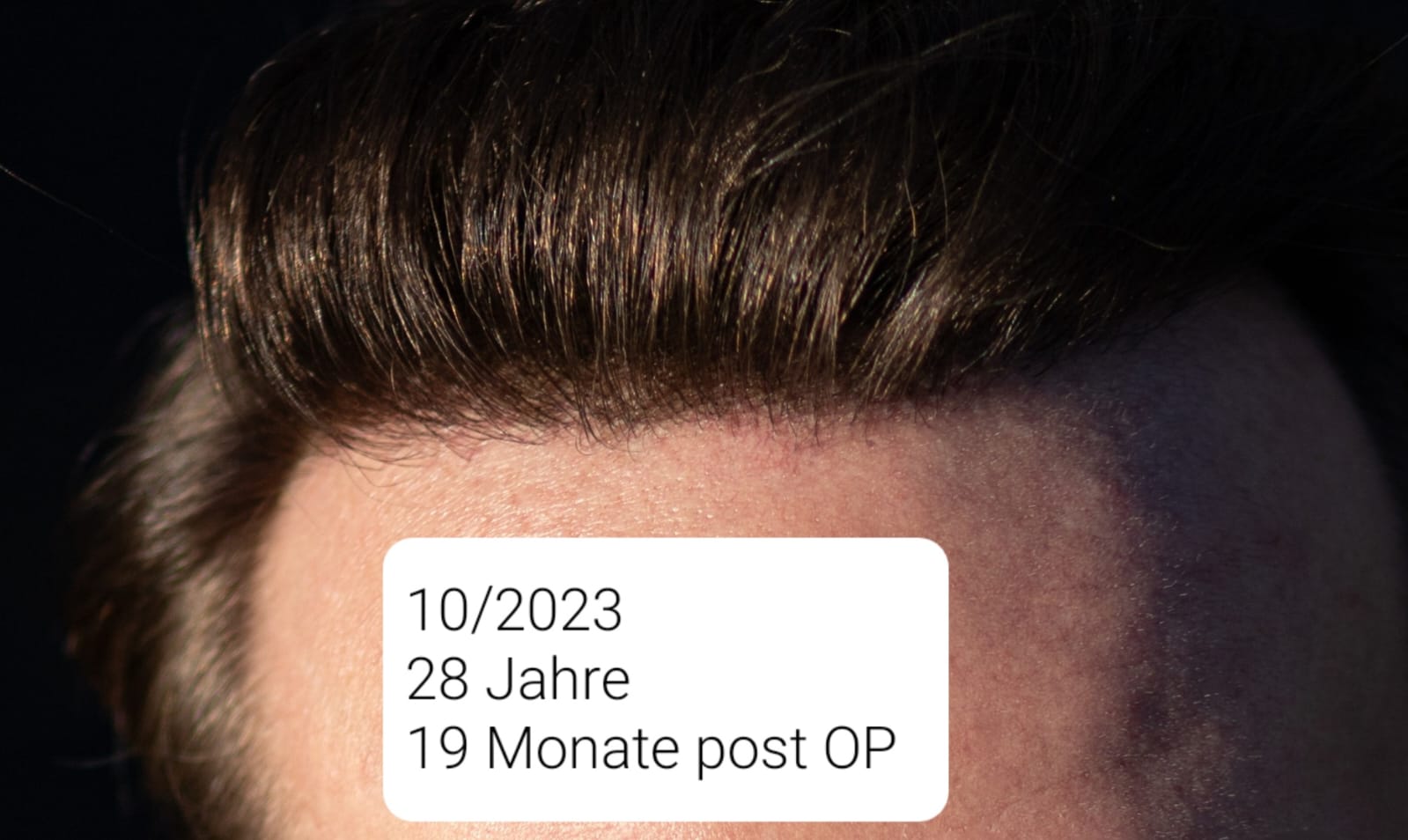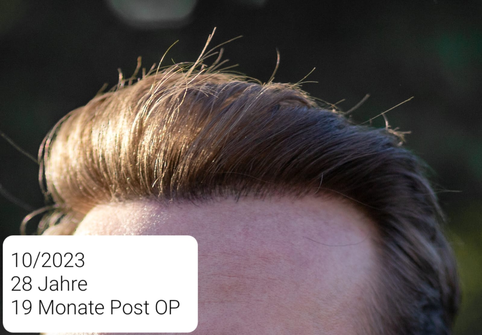 Diese Bilder sind ganz aktuell aus Mitte Oktober 2023 und mit direkter Sonneneinstrahlung gemacht worden. Finde es mit verschiedenen Lichtverhältnissen ganz interessant, weil es ohne Licht von oben deutlich dichter aussieht. Hier mal als Nahaufnahme von der Haarlinie, auch wenn einem Menschen ja nie so nah kommen. Für das Shooting habe ich 4-5 Sprüher Streuhaar benutzt, um eine etwas lichtere Stelle zu kaschieren (zum Lichen Planopilaris schreibe ich noch einen Post)
