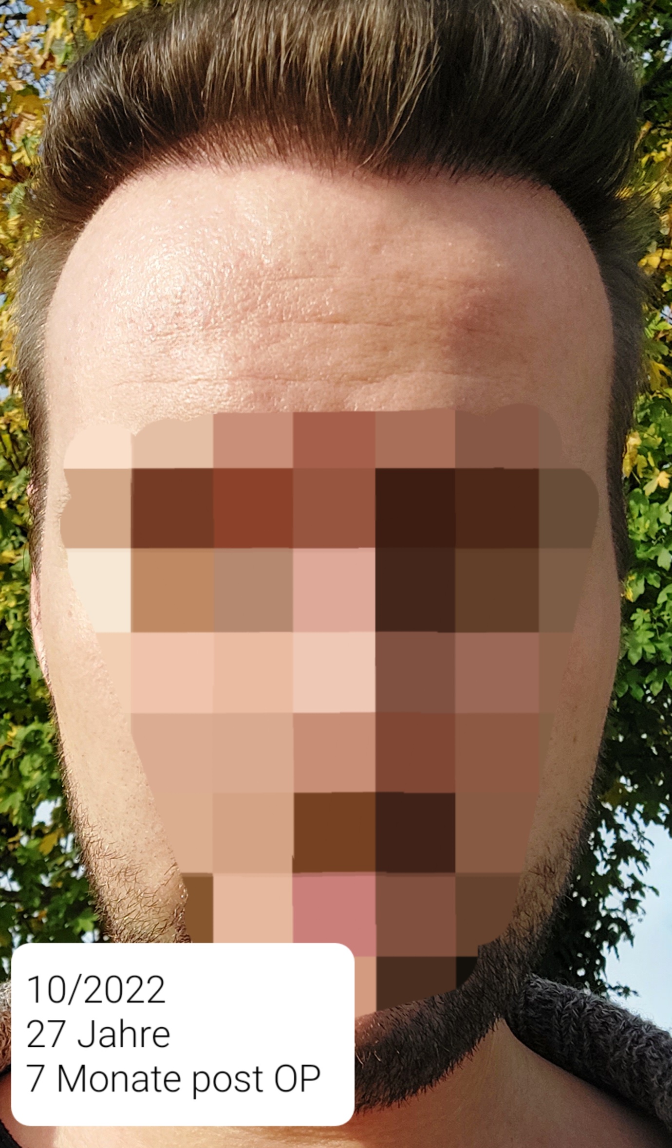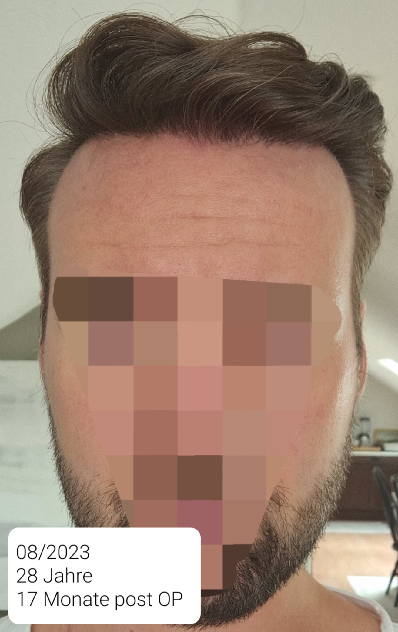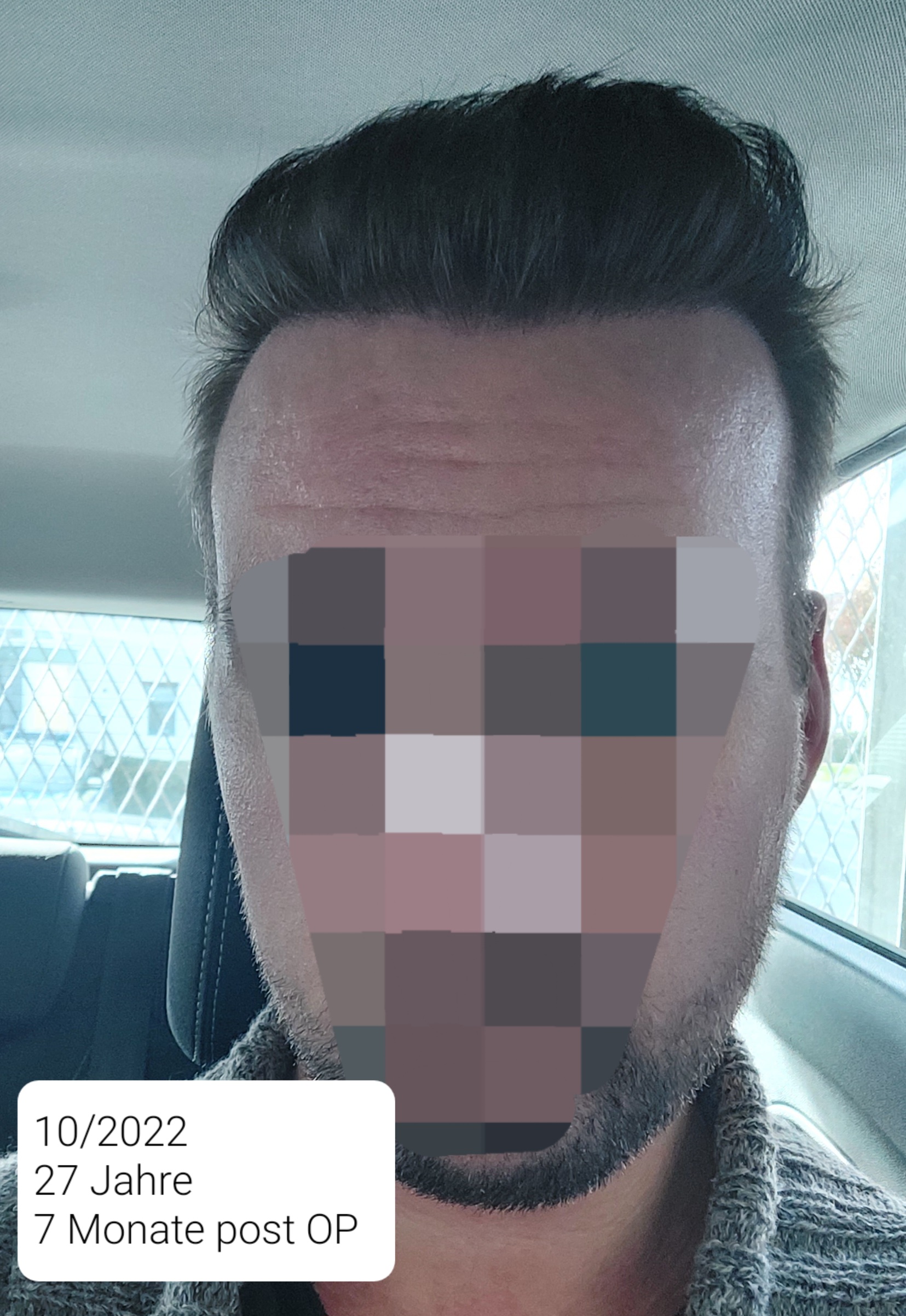 Die ersten 4 Wochen wurden täglich Fotos gemacht, da hier am meisten passierte. Ich war sehr froh, dass meine Mutter nicht weit entfernt wohnt und mir bei der Haarwäsche helfen konnte. Diesen Lotionsschaum habe ich nämlich nicht ausgewaschen bekommen... Hier wurde von anderen HTlern empfohlen diesen mit Wasser in den Handflächen beim Auftragen zu verdünnen, was besser funktioniert hat. Die Heilung des Spenderbereichs verlief extrem gut. Nach ein paar Tagen wurde die Kruste des Empfängerbereichs etwas rissig, weshalb ich dünn Kaufmanns Kindercreme aufgetragen habe. Nachdem die Kruste aufgeweicht und entfernt werden durfte/ teils abgefallen ist, habe ich meine Kopfhaut mit Aloe Vera Gel gepflegt. Das Shedding nach einem Monat war ziemlich übel und es ist ein Großteil der Haare ausgefallen. 3, 4 und 5 Monate Post OP ließ ich je eine PRP Behandlung durchführen. 4 Monate Post OP begannen neue Haare licht zu wachsen. Nach 6,5-7 Monaten fing es an dichter zu werden und gut auszusehen. Mit einem Dermaroller habe ich ab 4-5 Monaten Post OP begonnen, aber irgendwie die notwendige Regelmäßigkeit vergessen und aufgehört. Seit Ende 2022, also nach 8-9 Monaten, habe ich keine großen Unterschiede mehr wahrgenommen. Allerdings sind seit dem 8. Monat auch mehr Haare ausgefallen. Darauf gehe ich aber in einem Post weiter unten ein.
