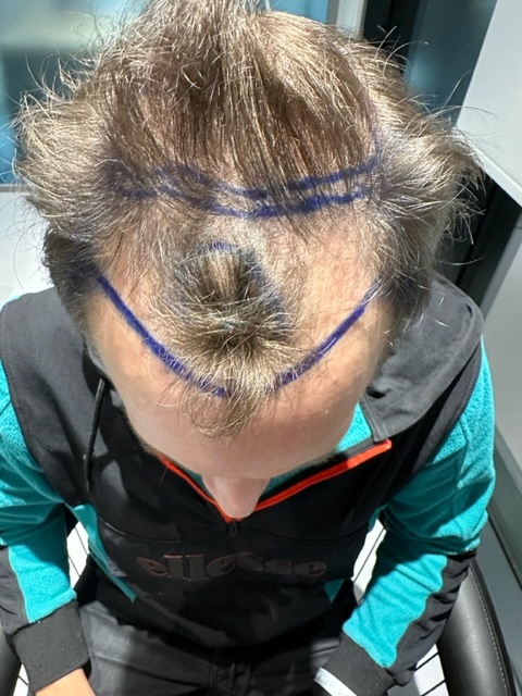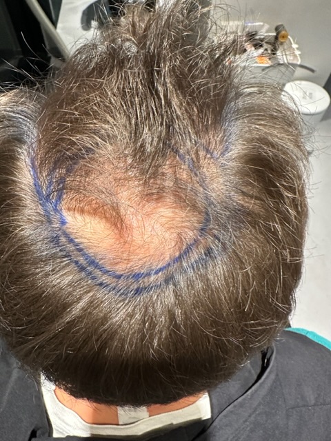 Ziel war eine dichtere Haarlinie, Verkleinerung der GHE und das Stopfen der Lichtung (keine mega Dichte). Um den Donor zu schonen sind 500 Barthaare auf den Hinterkopf gewandert. Insgesamt wurden 4000 Grafts transplantiert. Der Donor hat also noch etwas Reserve (ca. 3000). Ebenso der Bart (ca. 500).Dicke der Haare ist sehr gut, Anzahl der vorhandenen Multigrafts war durchschnittlich.