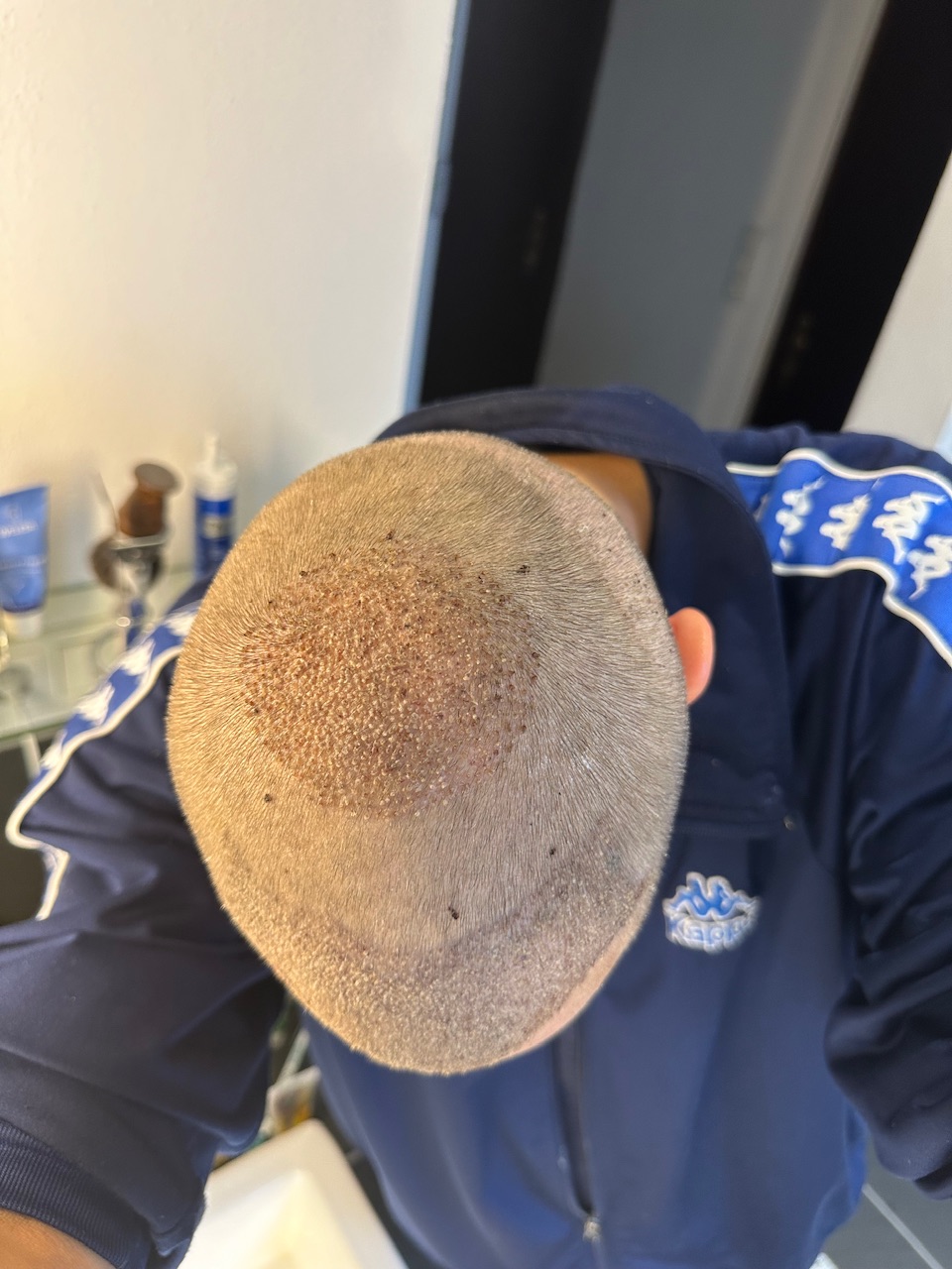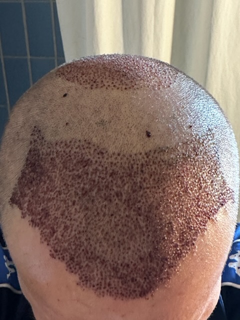 Die Transplantationsdichte ist nun besser zu sehen. Meine Kopfhaut ist wohl sehr dünn und empfindlich. Deshalb war es ziemlich blutig.